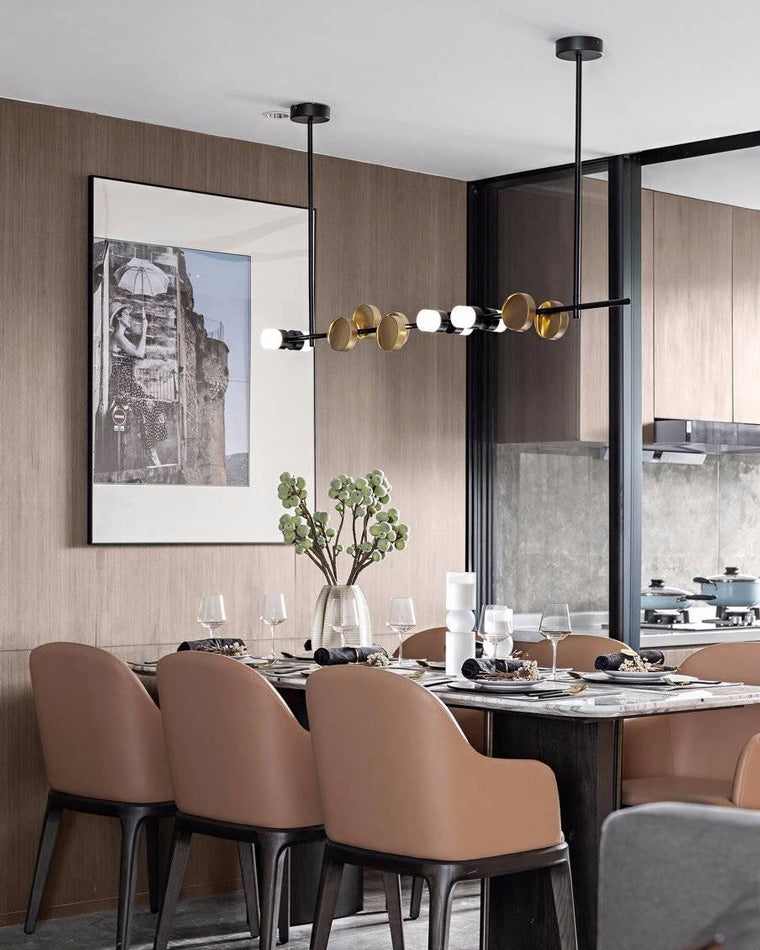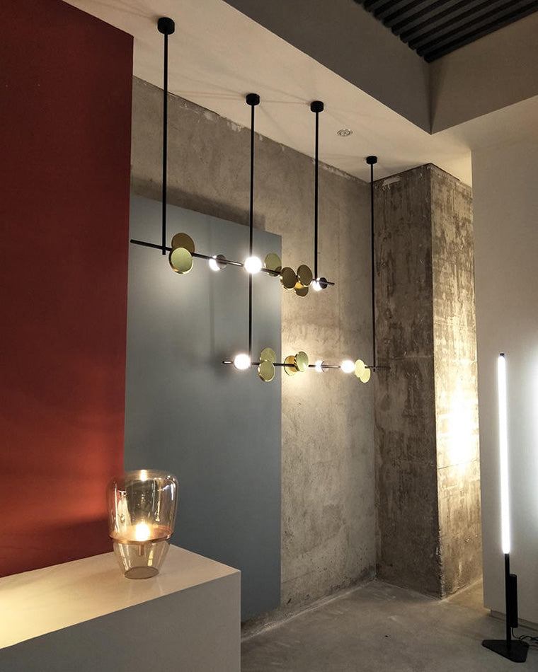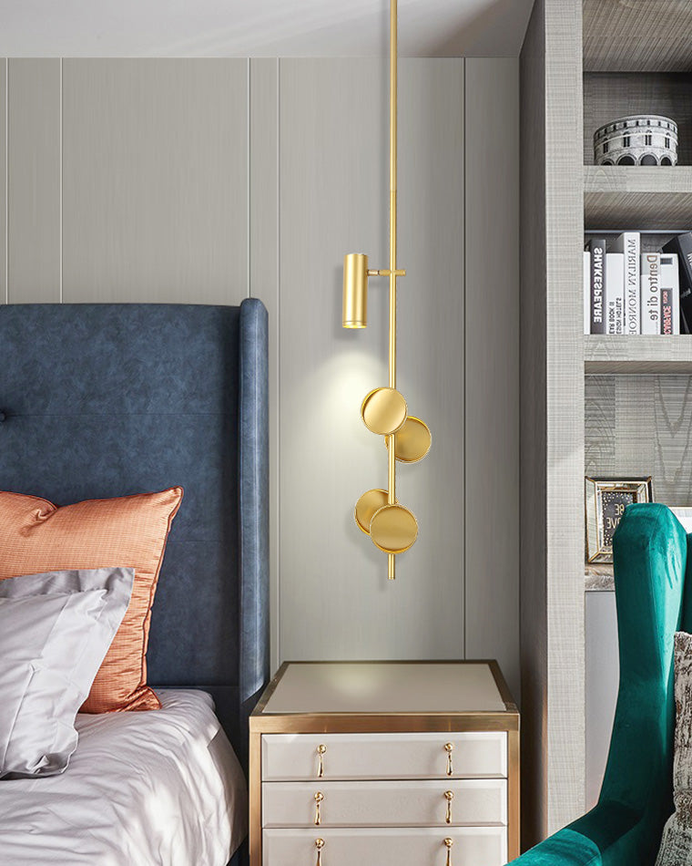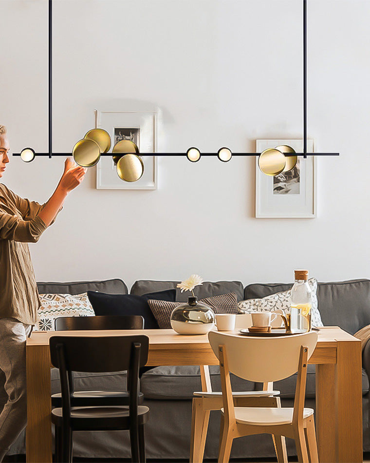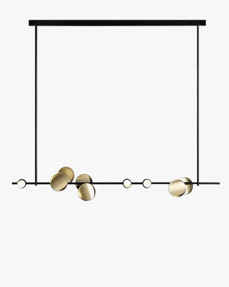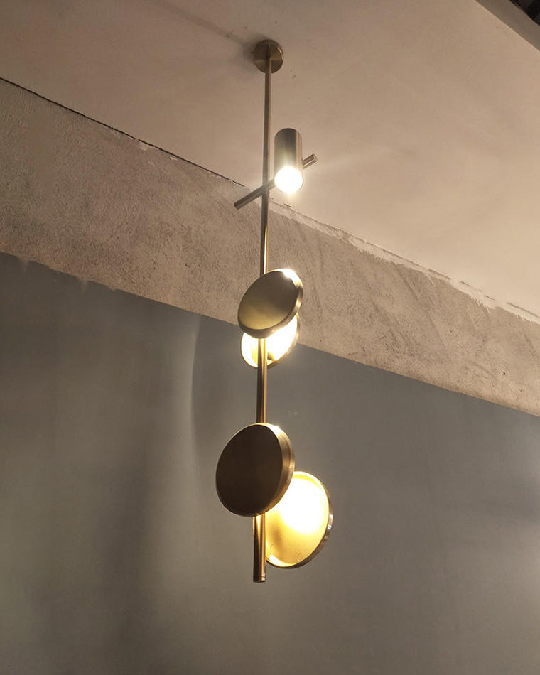 The Sculptural Pendant is unique and simple design. The lamp derived from the simple geometry of a smaller cylinder and a larger cylinder, Disc presents a complex yet pared back aesthetic. Always installed in pairs, the light is reflected and flushed on the internal curve, thus providing decorative engraving elements as part of your layout system configuration (or expression we are going to say). This pendant is made from metal rods, aluminum disc and acrylics.coated with sandy black and gold finish, this Disc Pendant light brings different glories and elegance of mid-century to your space.