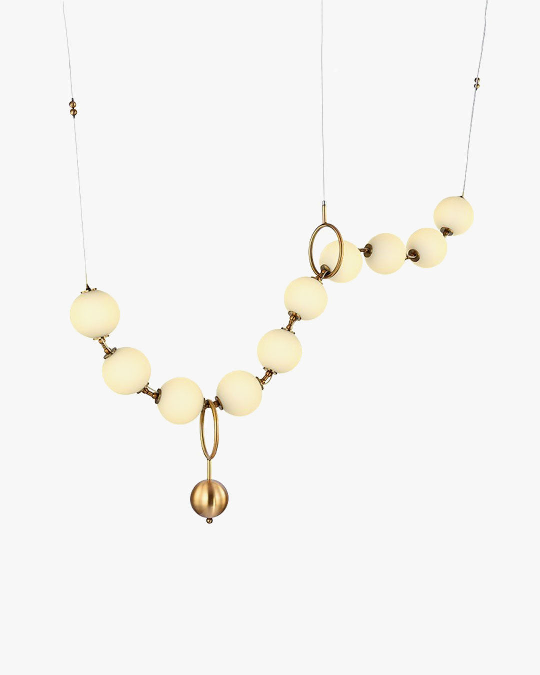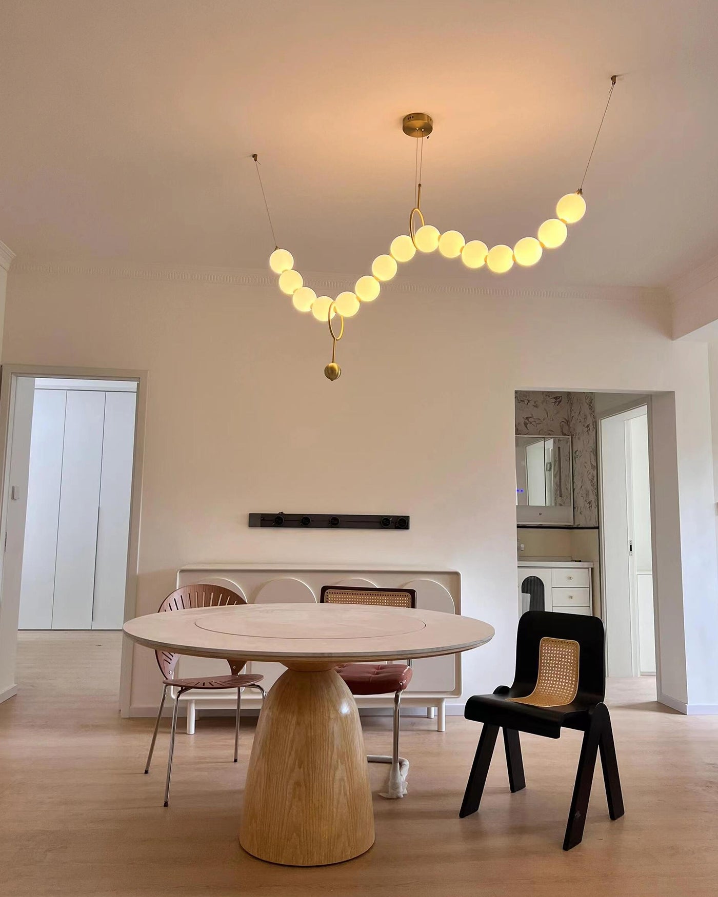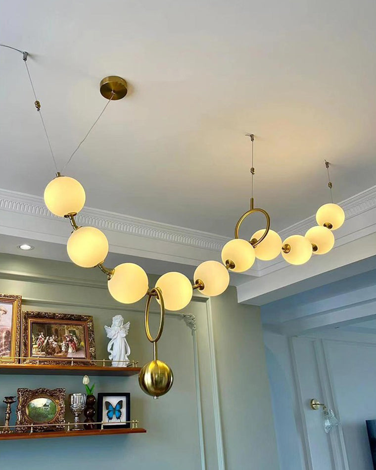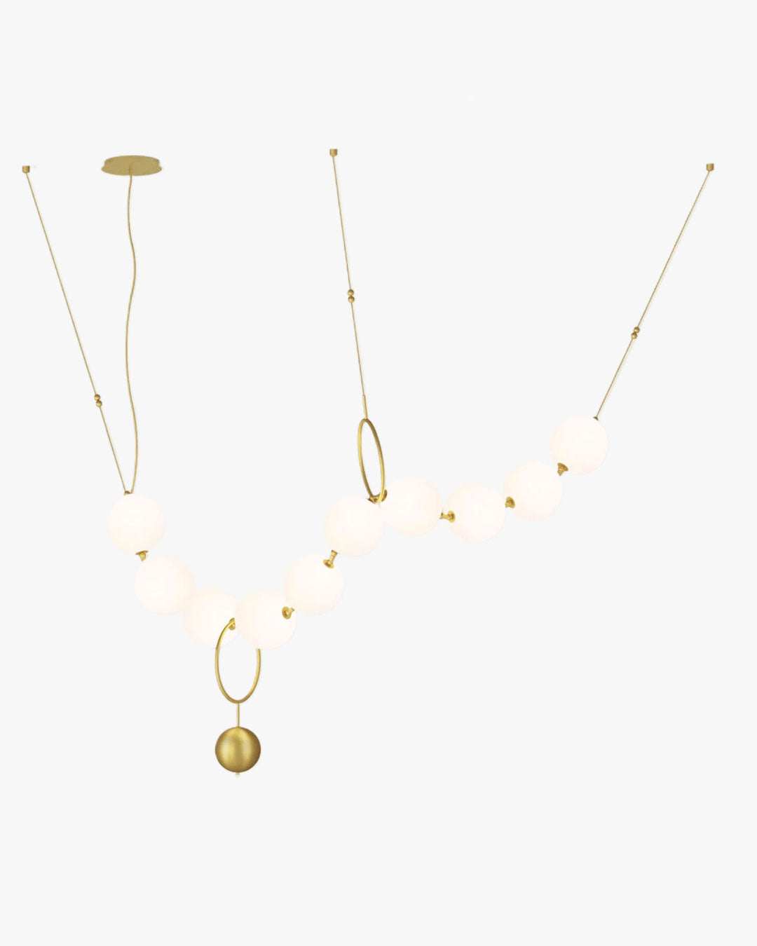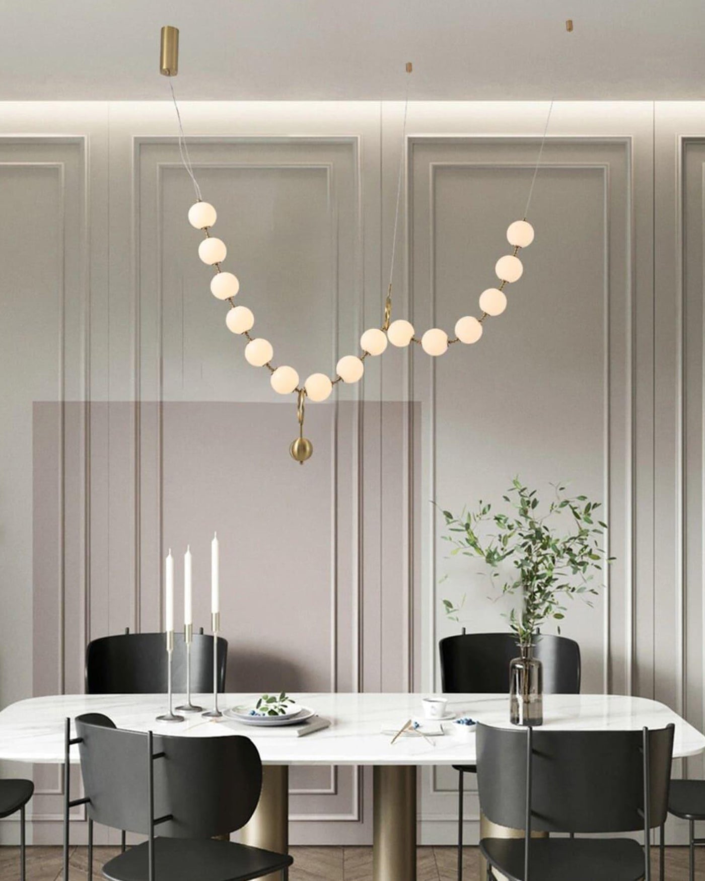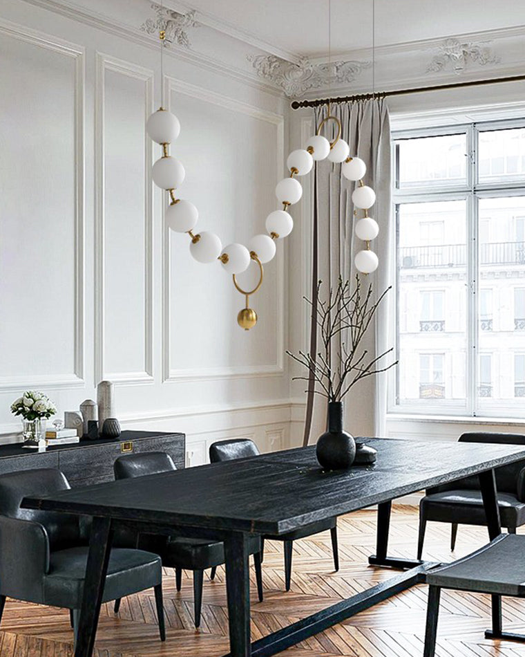 Experience the glamour of Art Deco with the WOMO Adjustable Pearl Chandelier-WM2936. The gold frame and shimmering acrylic pearls create a stunning globe design, perfect for adding luxury to any dining room. With its adjustable height, this chandelier offers both elegance and functionality.