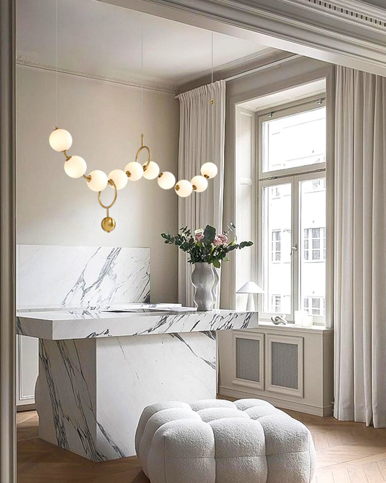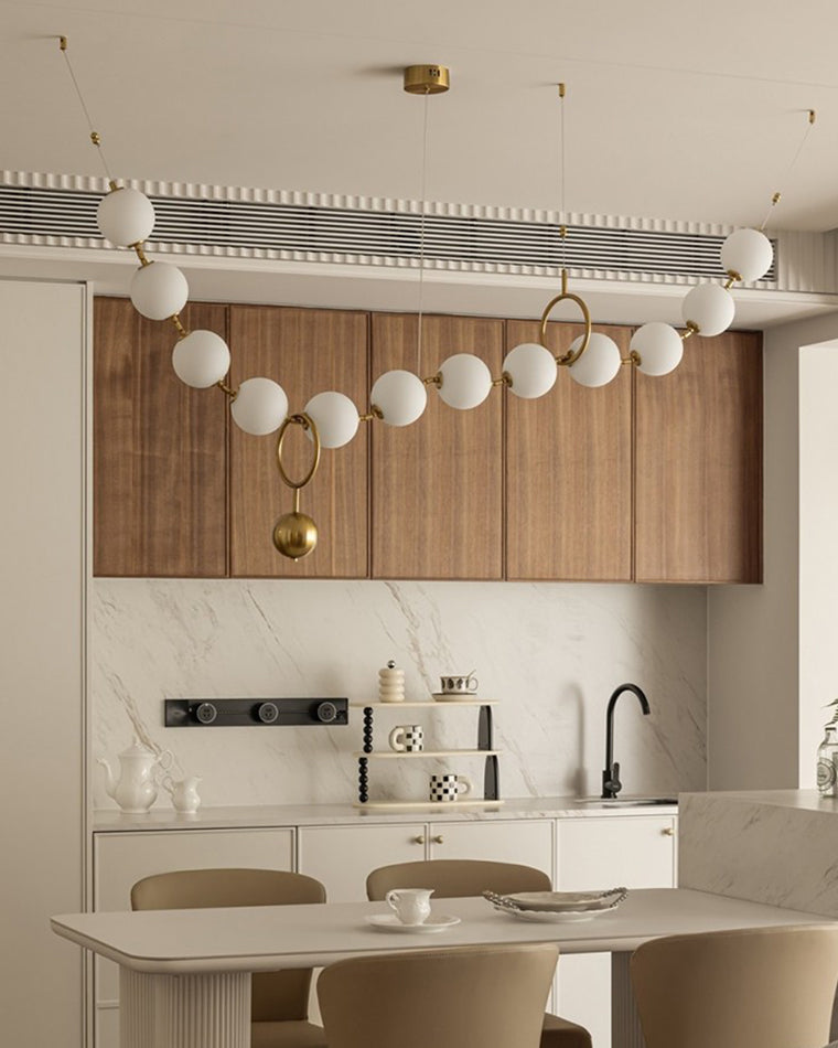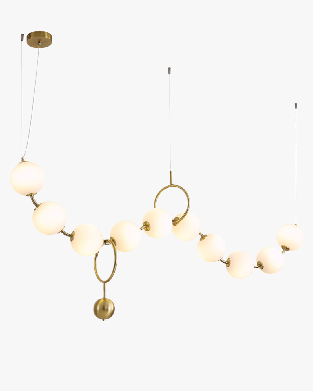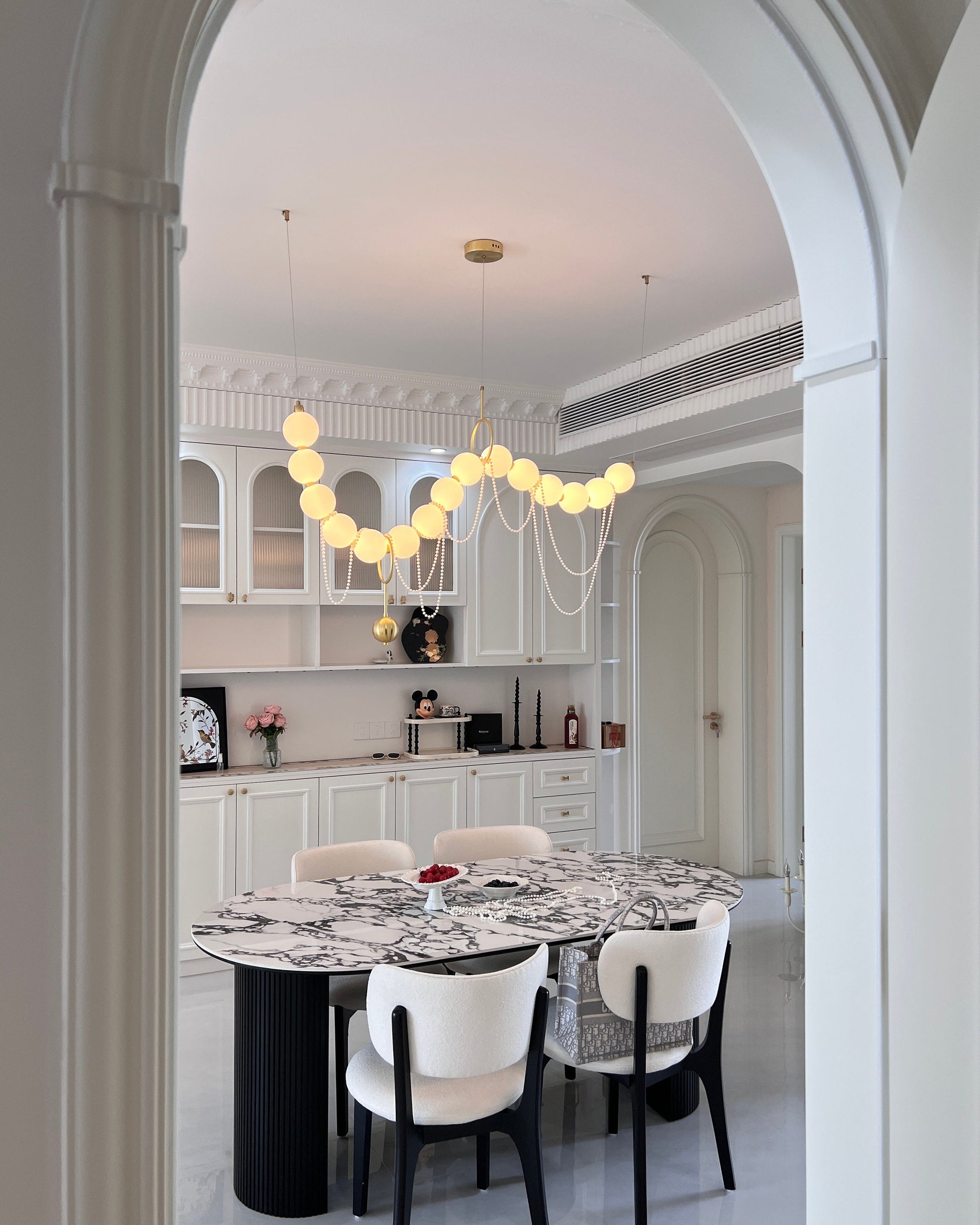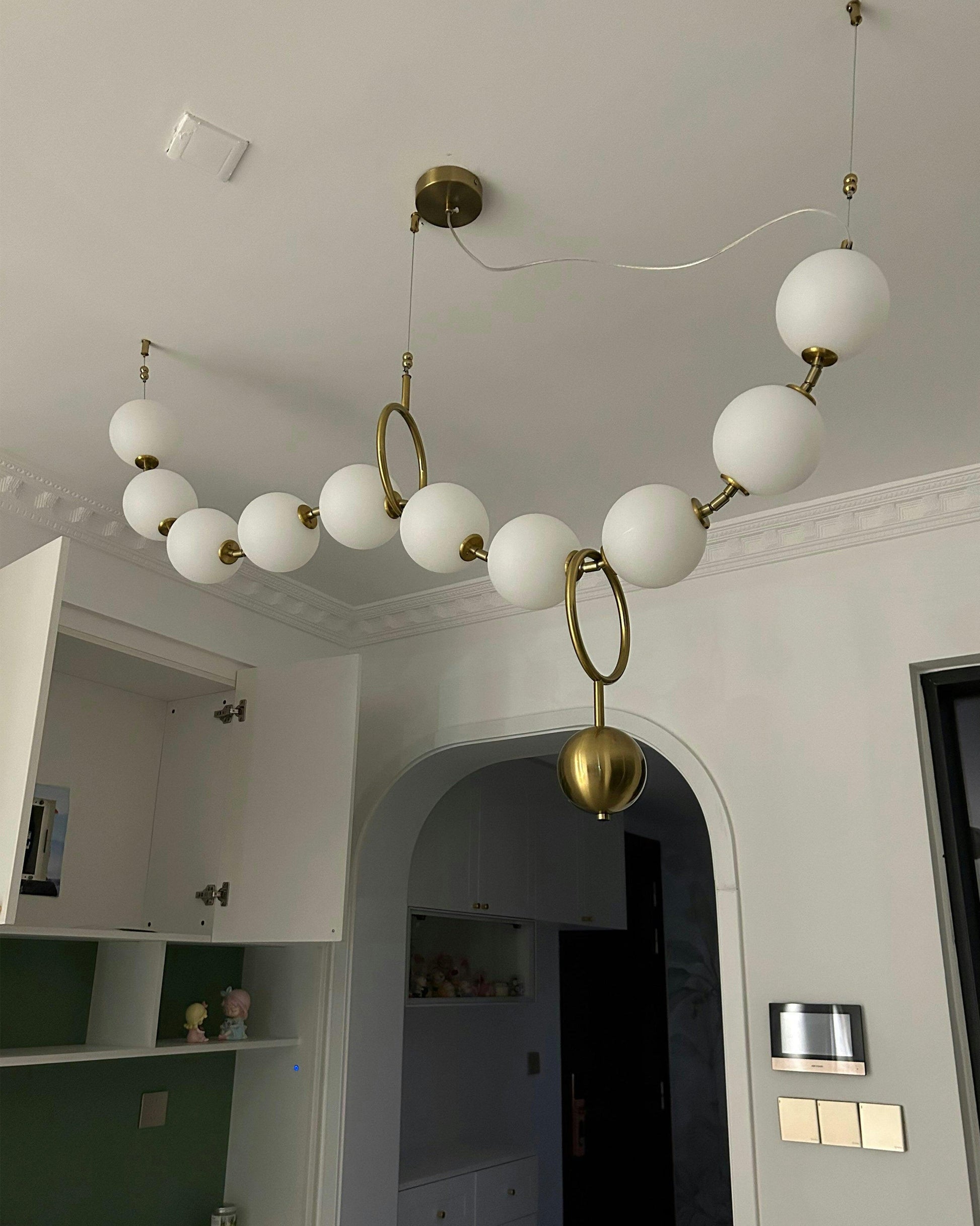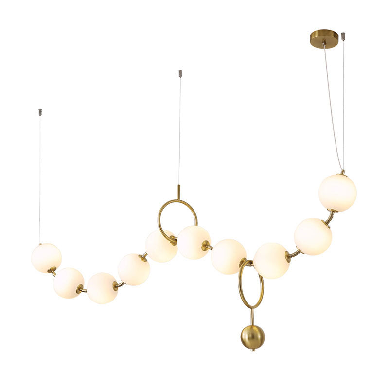 Experience the glamour of Art Deco with the WOMO Adjustable Pearl Chandelier-WM2936. The gold frame and shimmering acrylic pearls create a stunning globe design, perfect for adding luxury to any dining room. With its adjustable height, this chandelier offers both elegance and functionality.