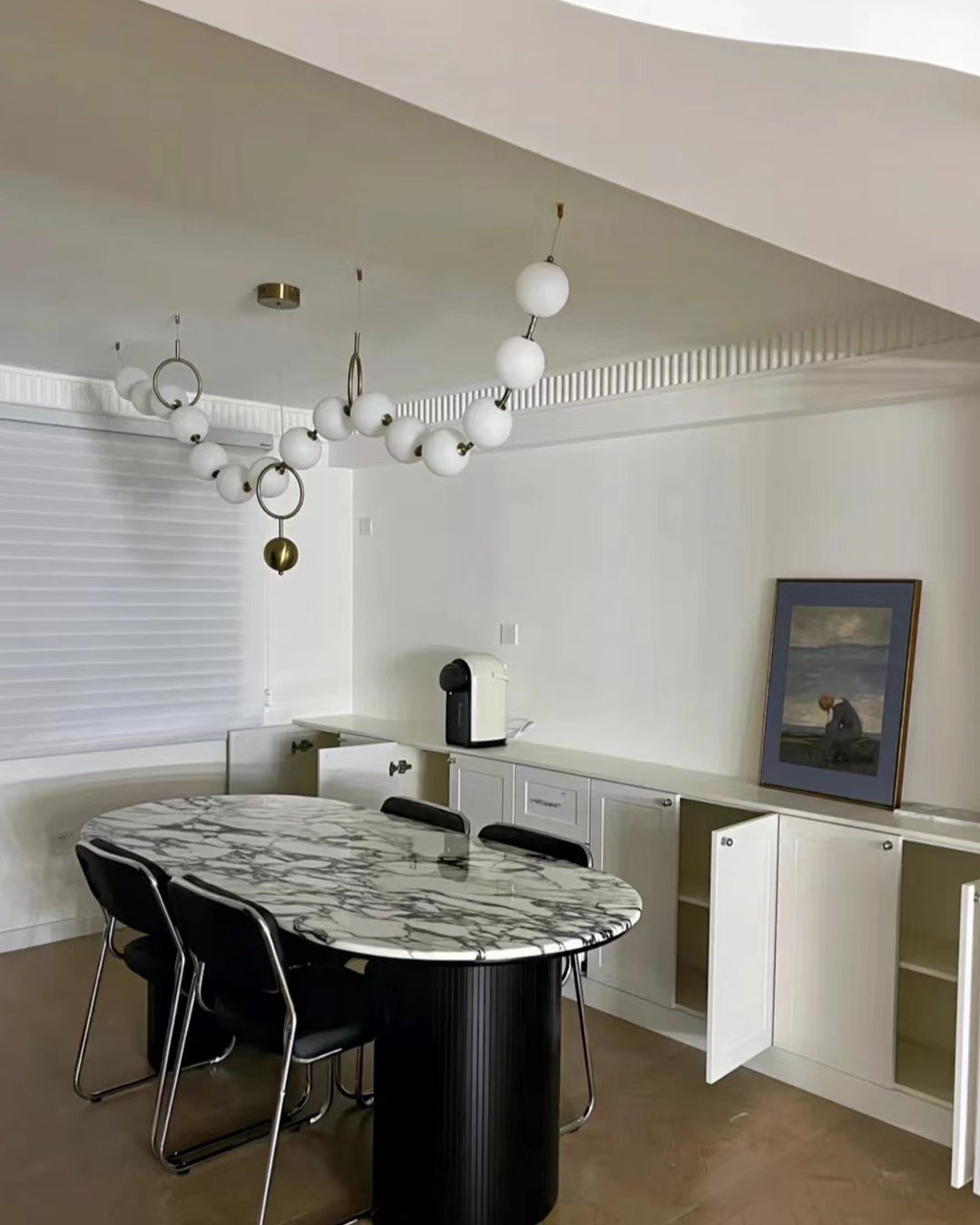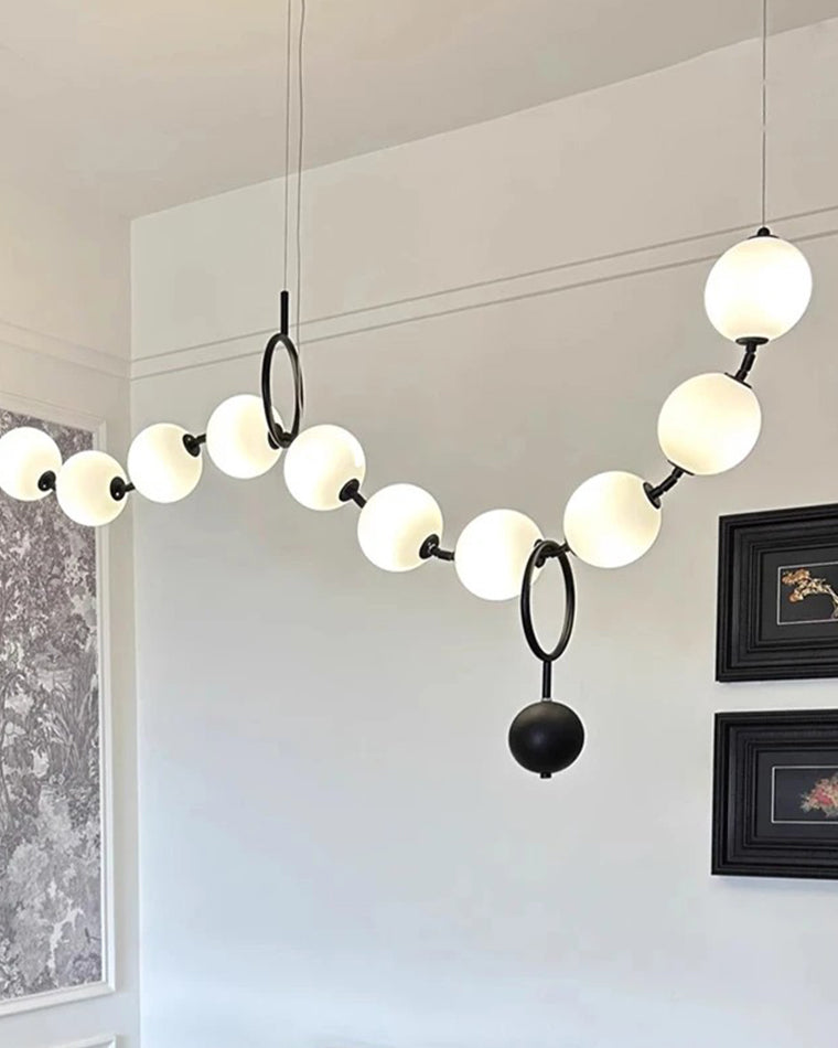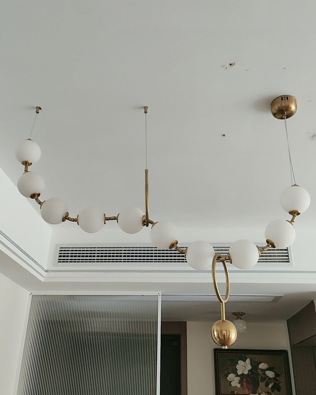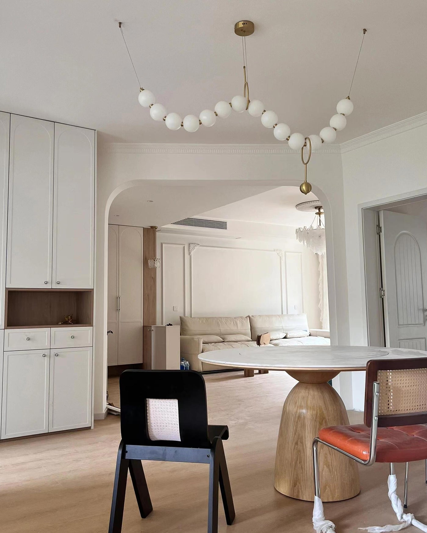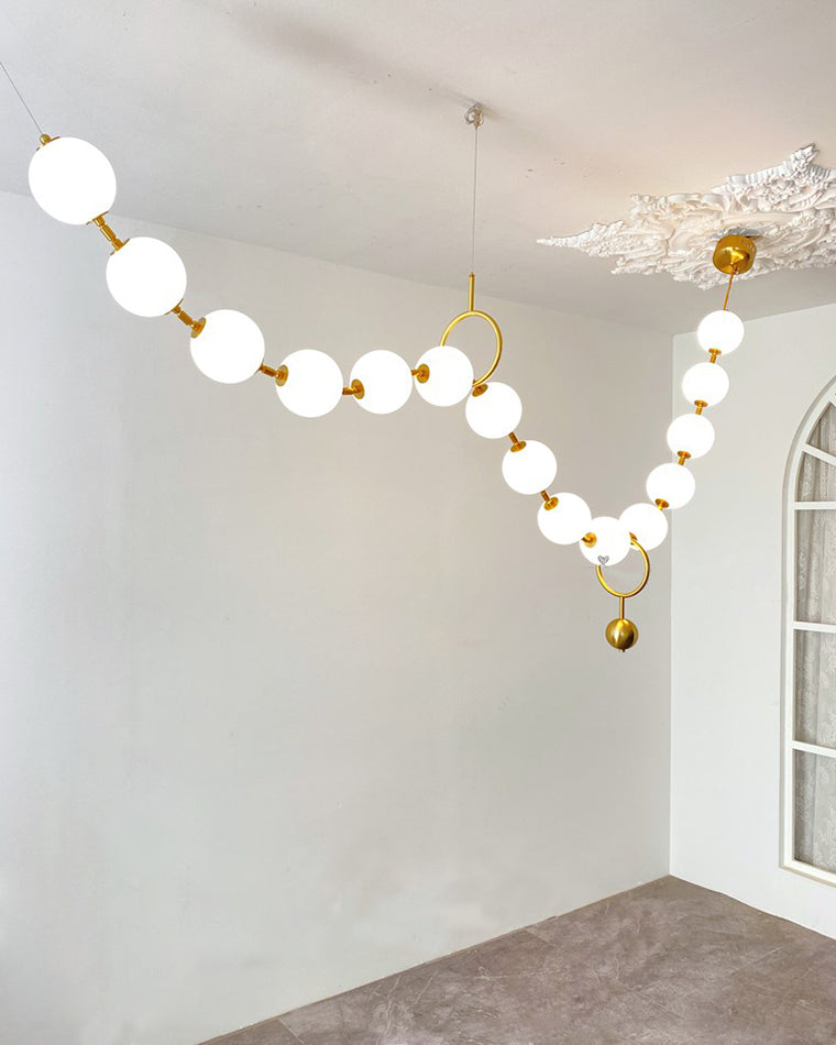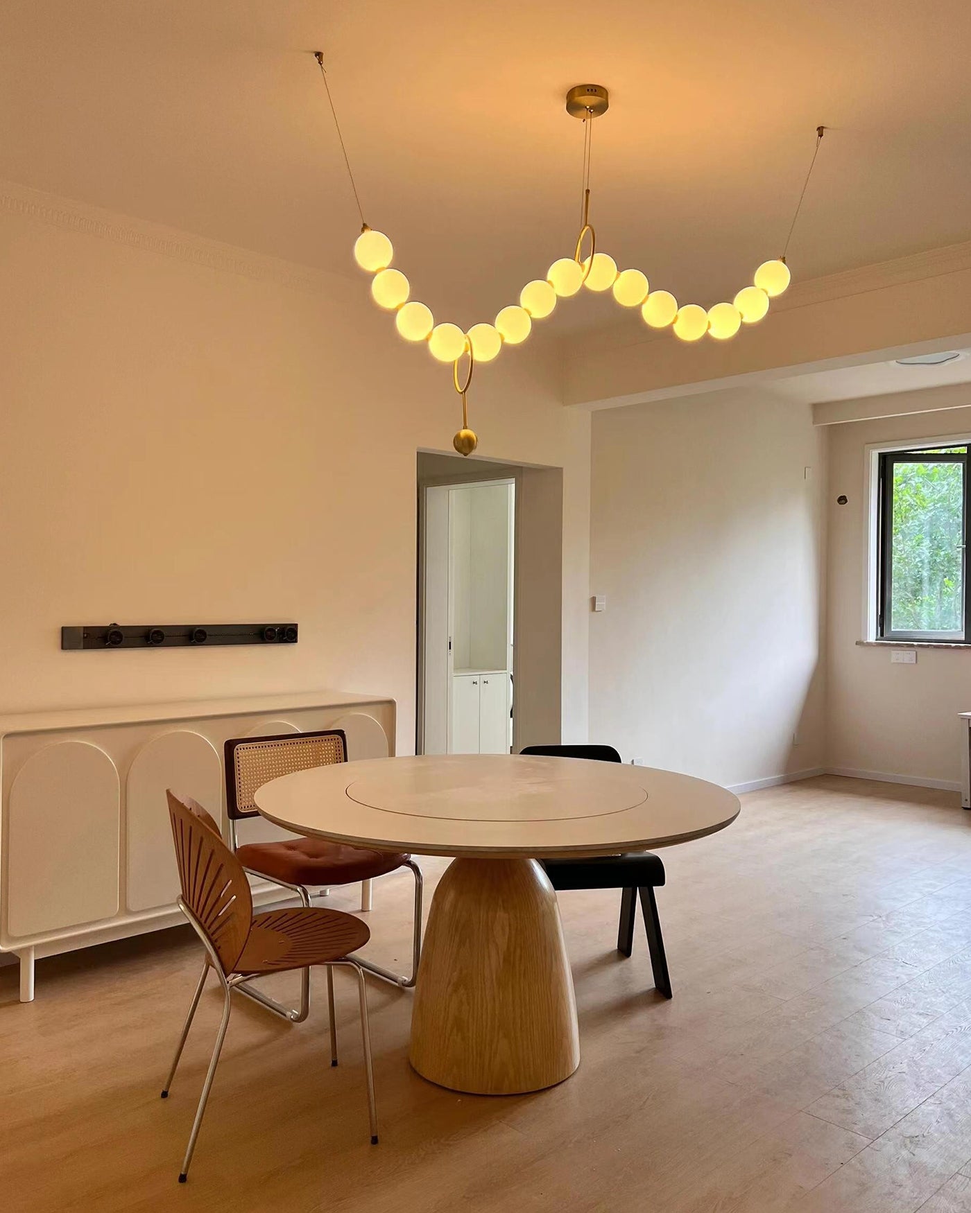 Experience the glamour of Art Deco with the WOMO Adjustable Pearl Chandelier-WM2936. The gold frame and shimmering acrylic pearls create a stunning globe design, perfect for adding luxury to any dining room. With its adjustable height, this chandelier offers both elegance and functionality.