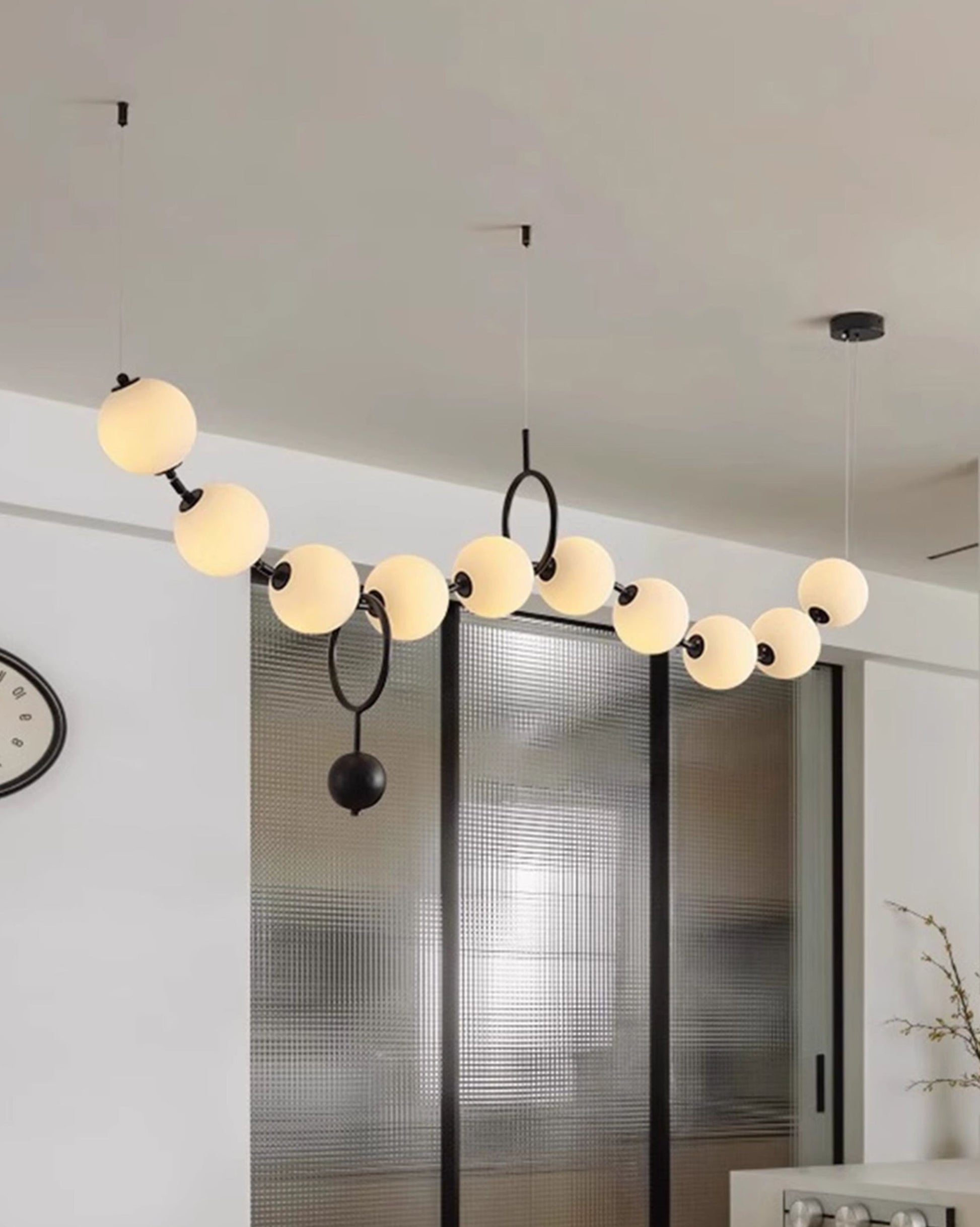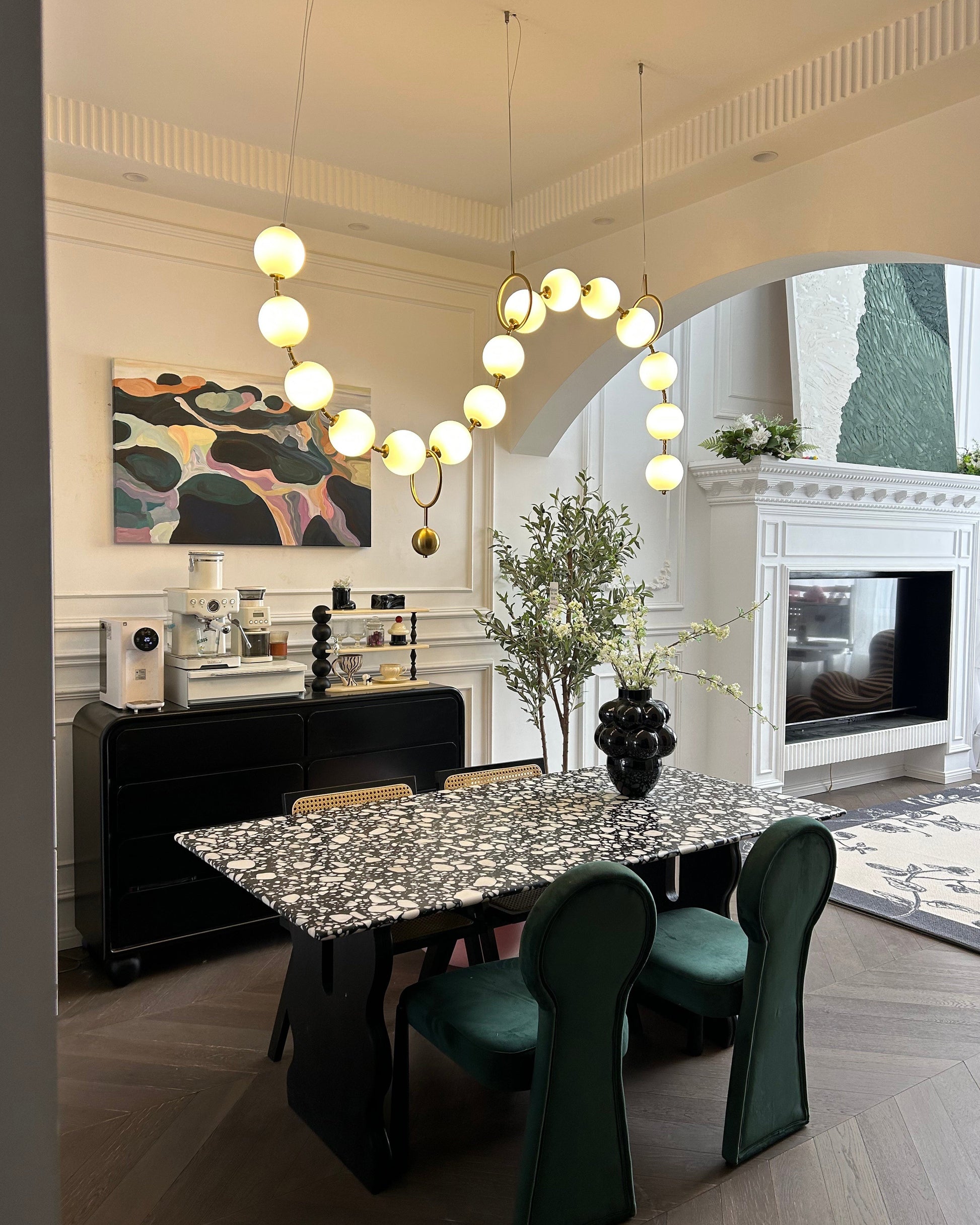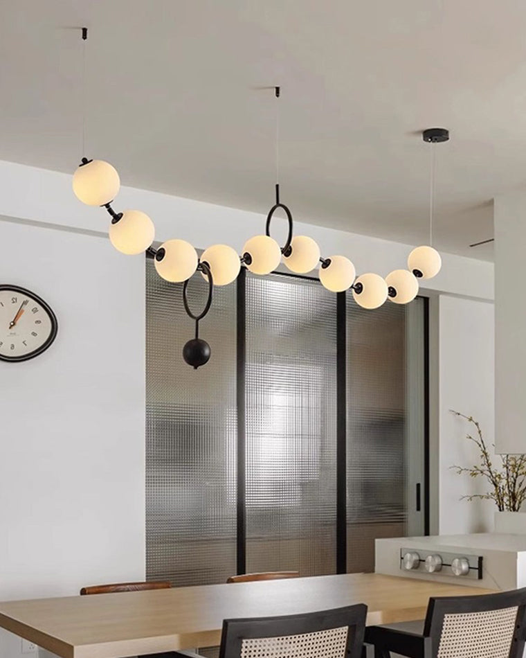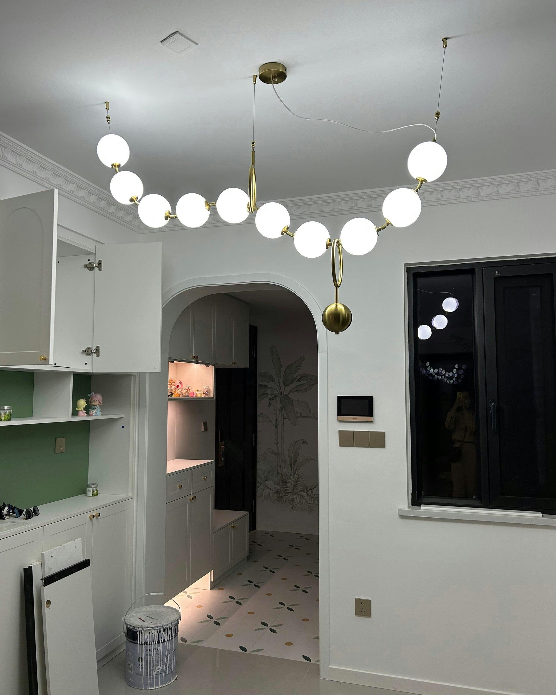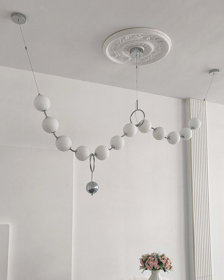 Experience the glamour of Art Deco with the WOMO Adjustable Pearl Chandelier-WM2936. The gold frame and shimmering acrylic pearls create a stunning globe design, perfect for adding luxury to any dining room. With its adjustable height, this chandelier offers both elegance and functionality.