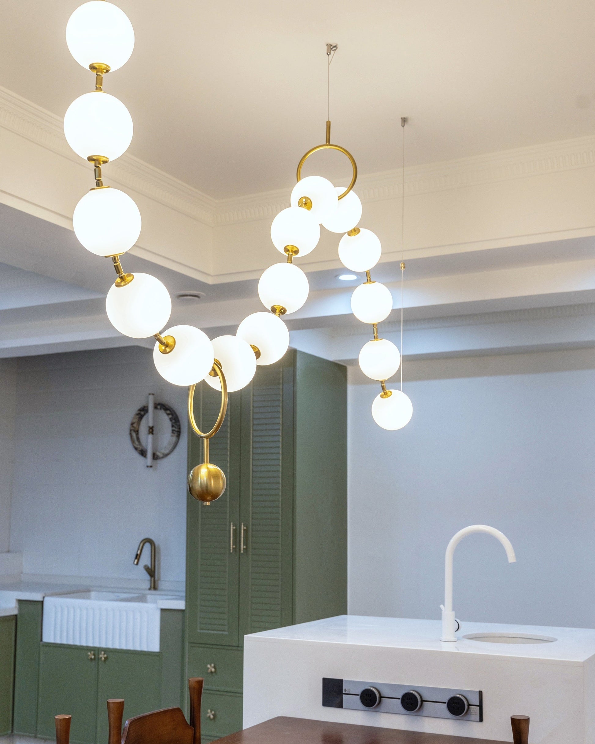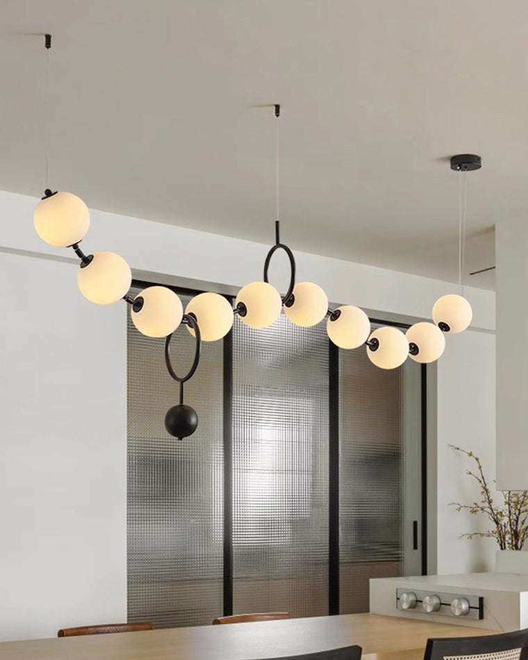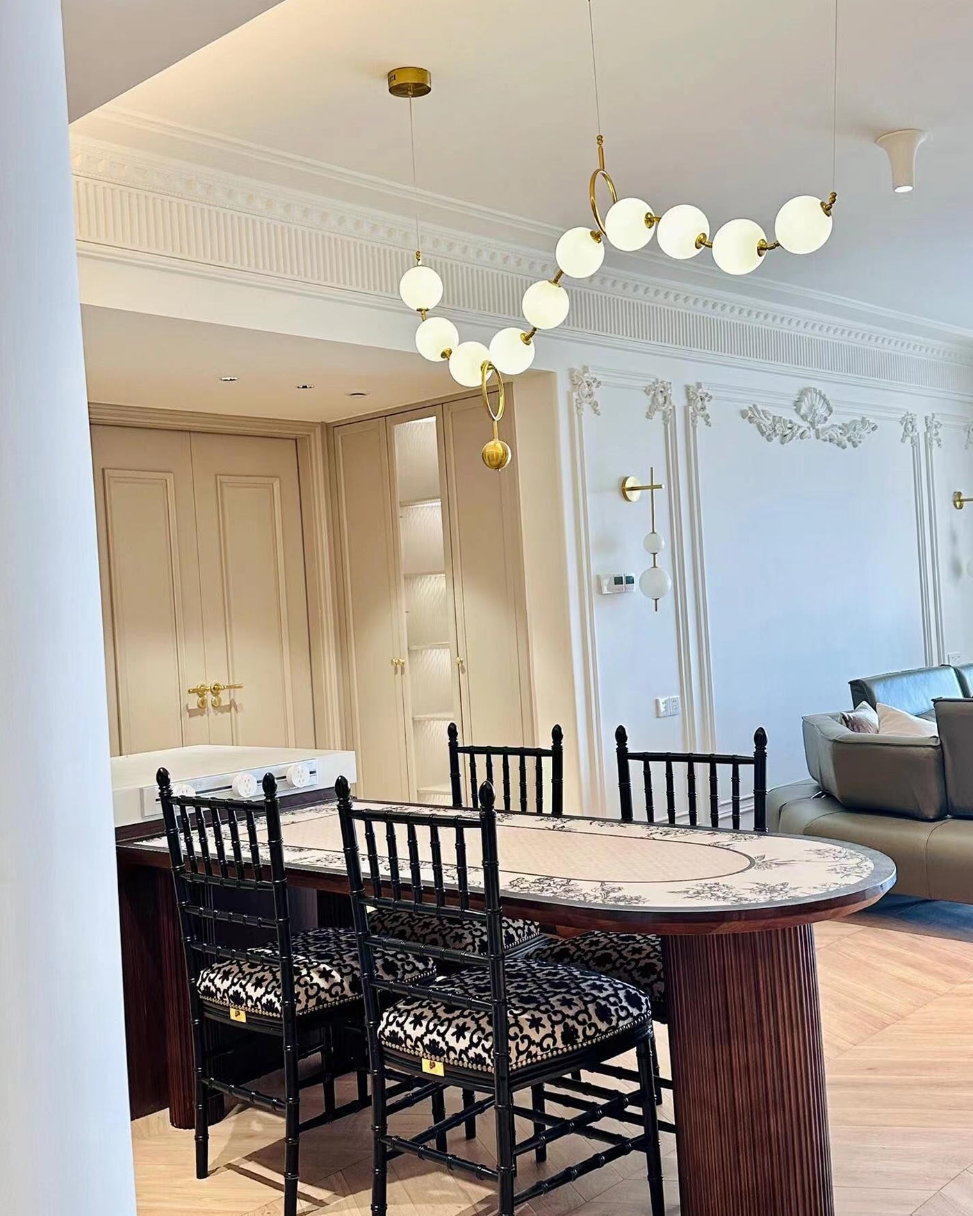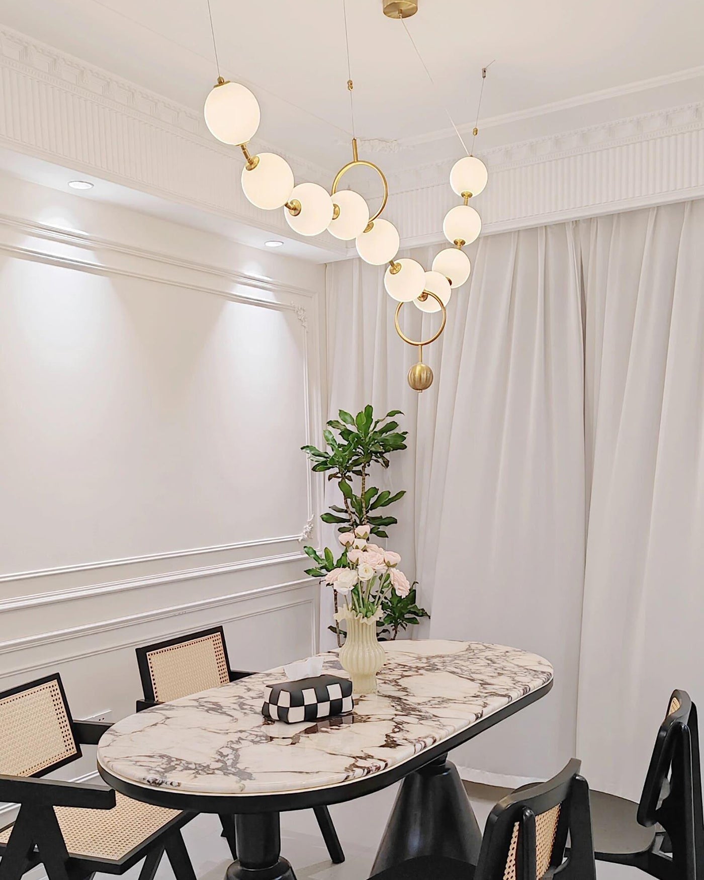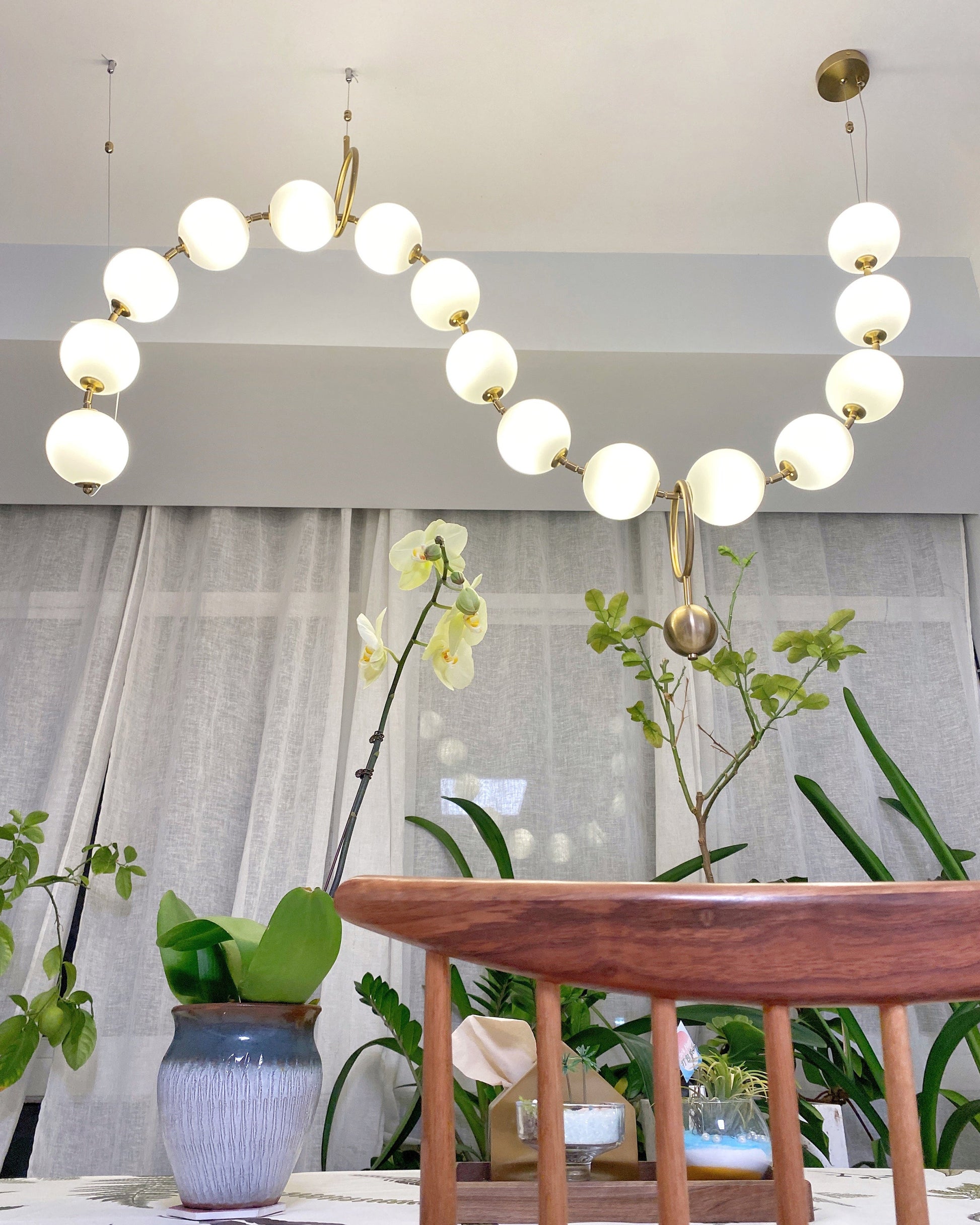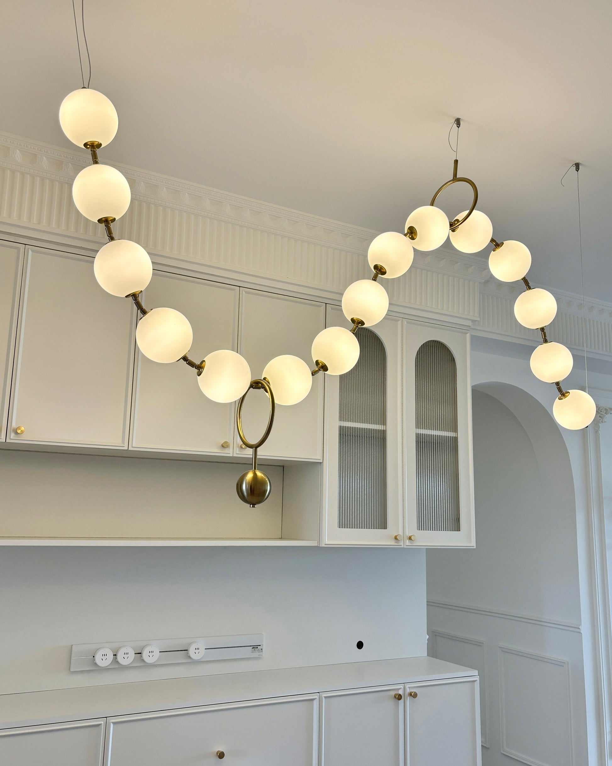 Experience the glamour of Art Deco with the WOMO Adjustable Pearl Chandelier-WM2936. The gold frame and shimmering acrylic pearls create a stunning globe design, perfect for adding luxury to any dining room. With its adjustable height, this chandelier offers both elegance and functionality.