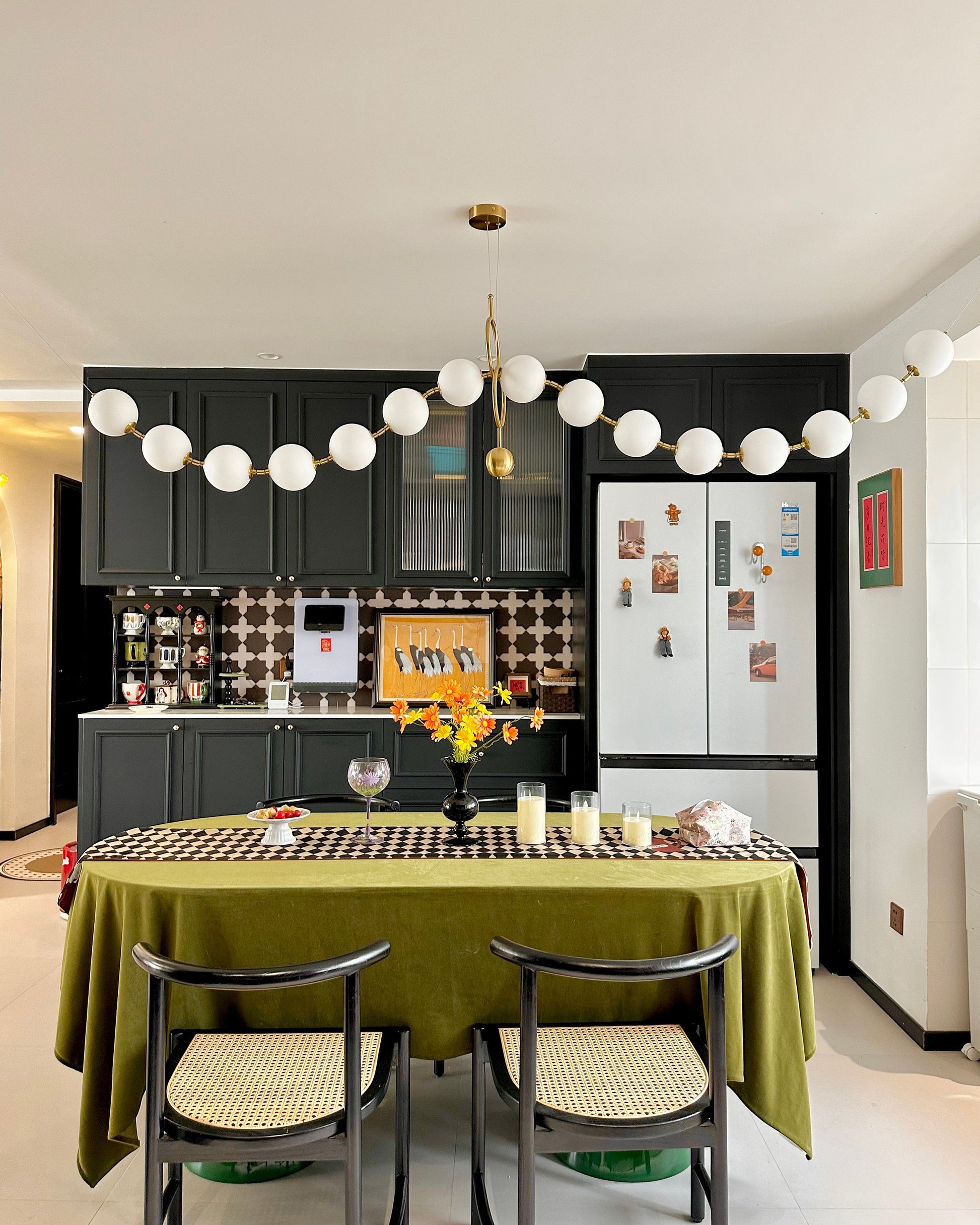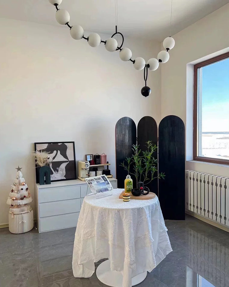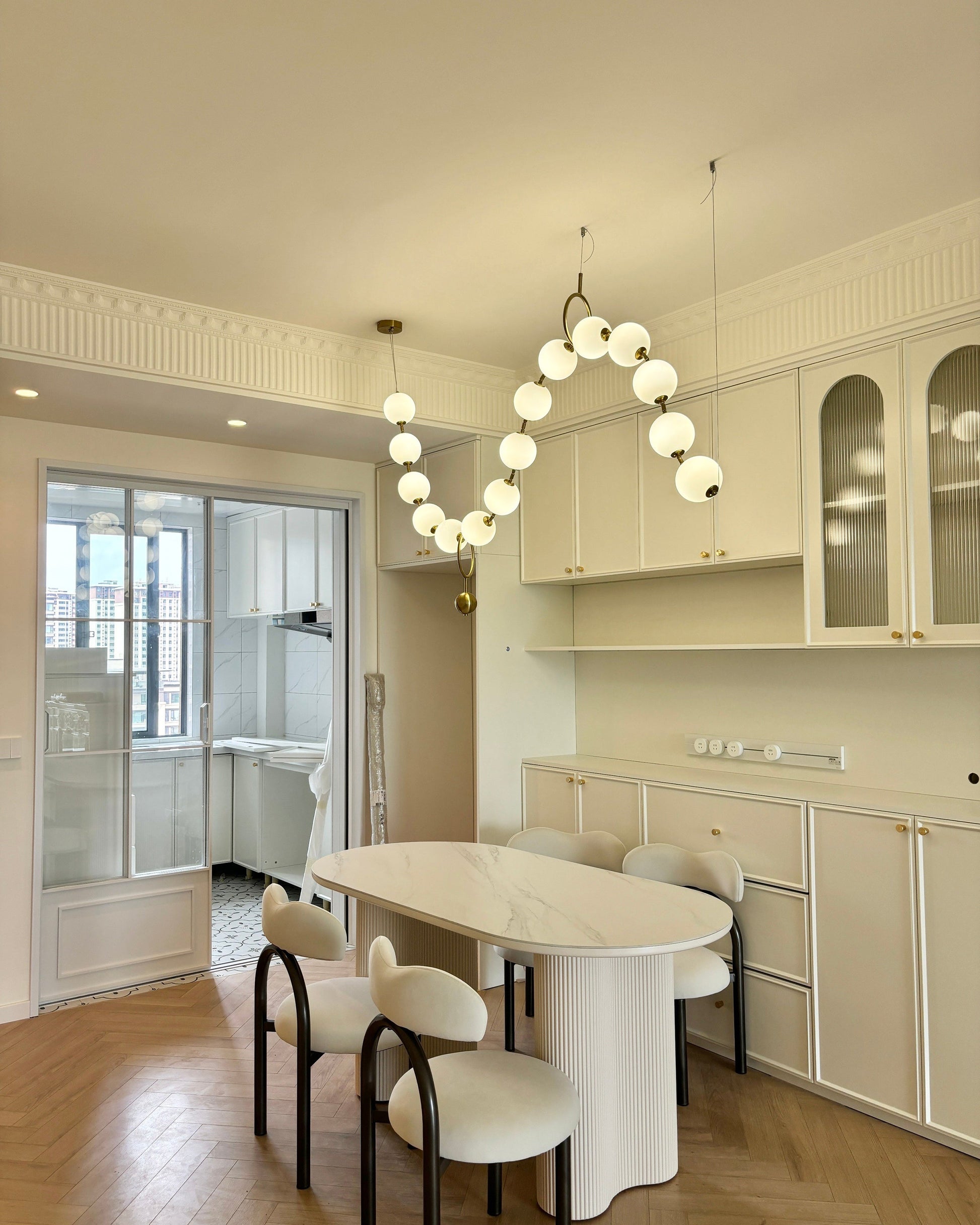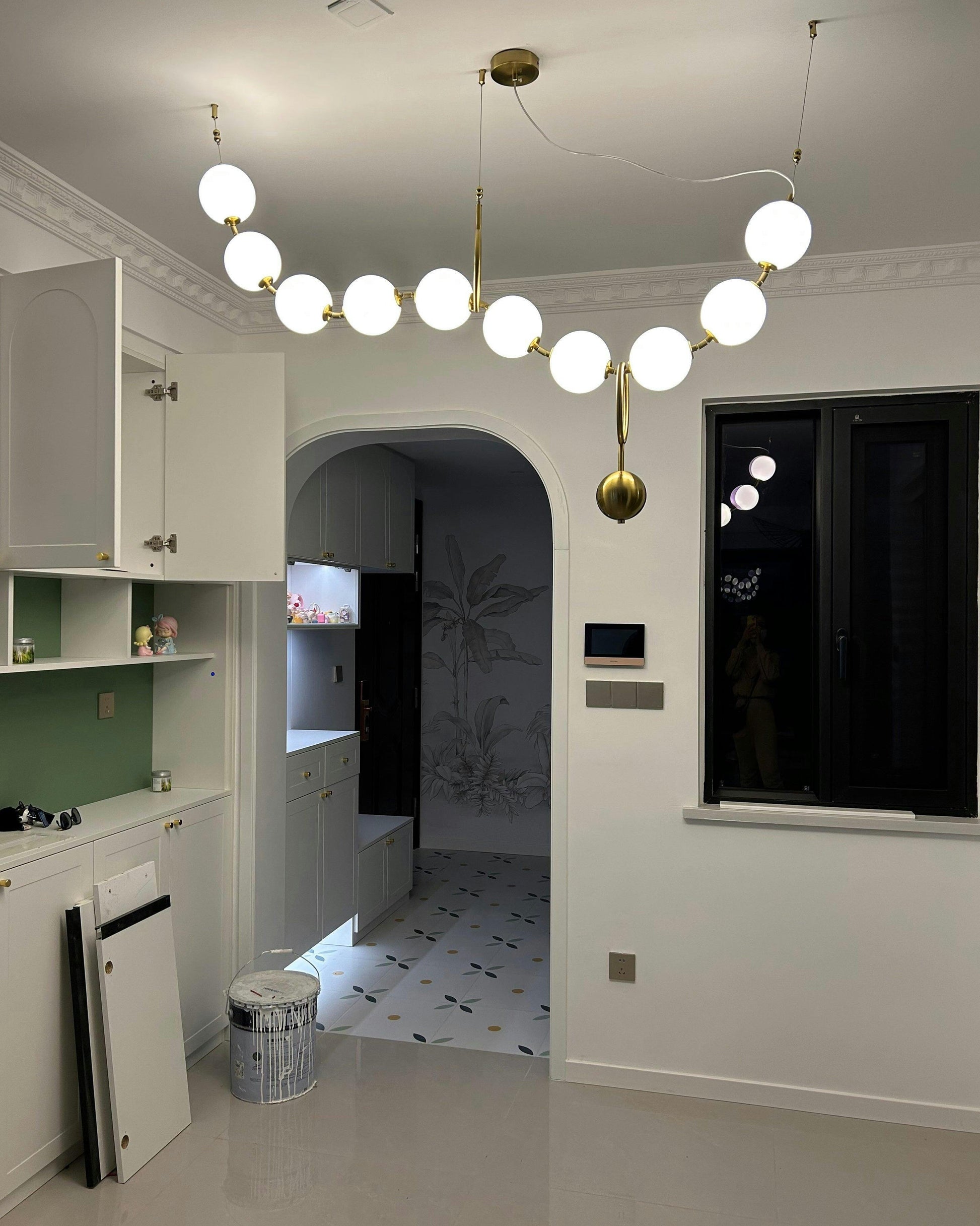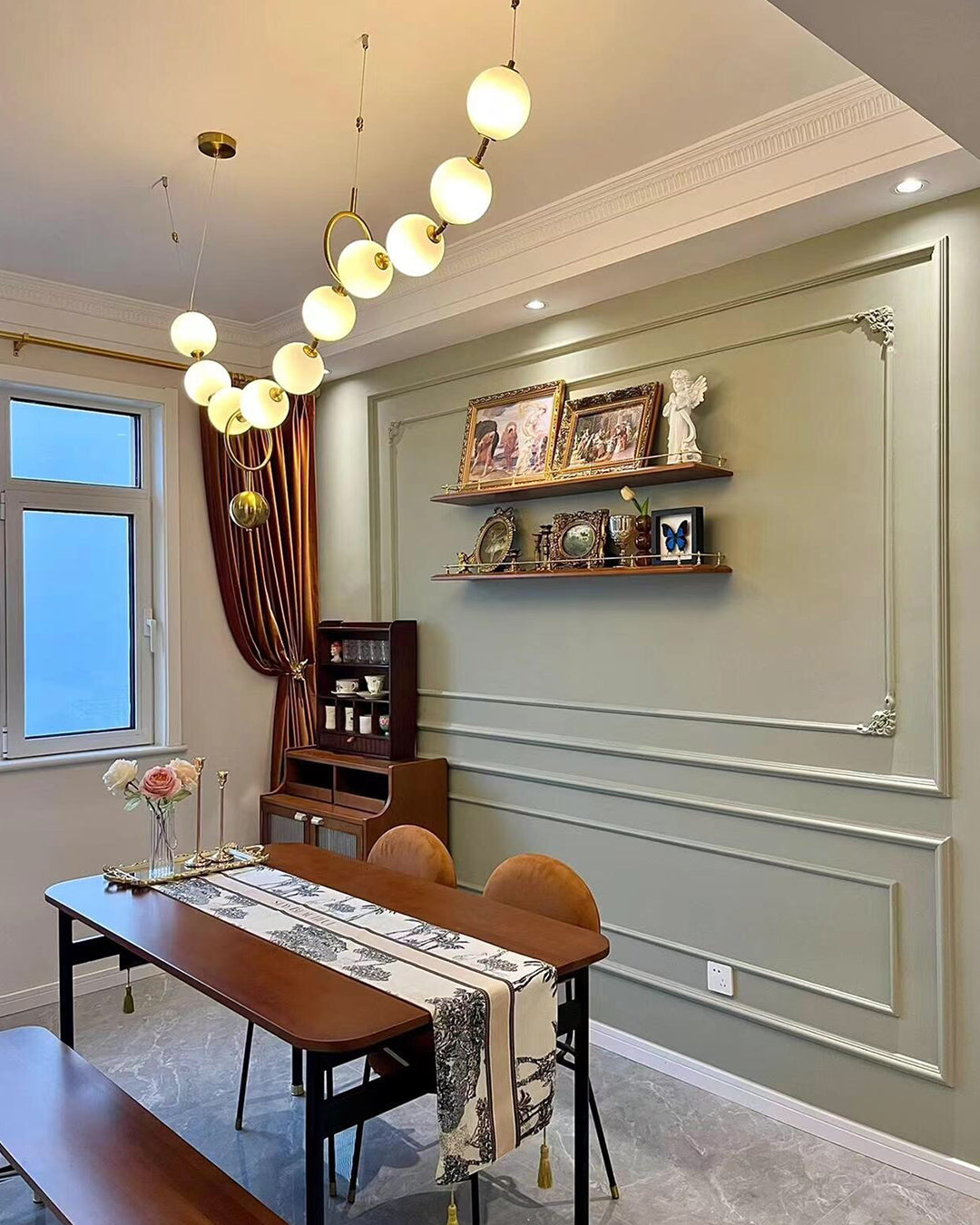 Experience the glamour of Art Deco with the WOMO Adjustable Pearl Chandelier-WM2936. The gold frame and shimmering acrylic pearls create a stunning globe design, perfect for adding luxury to any dining room. With its adjustable height, this chandelier offers both elegance and functionality.
