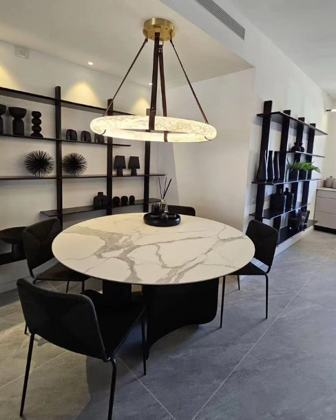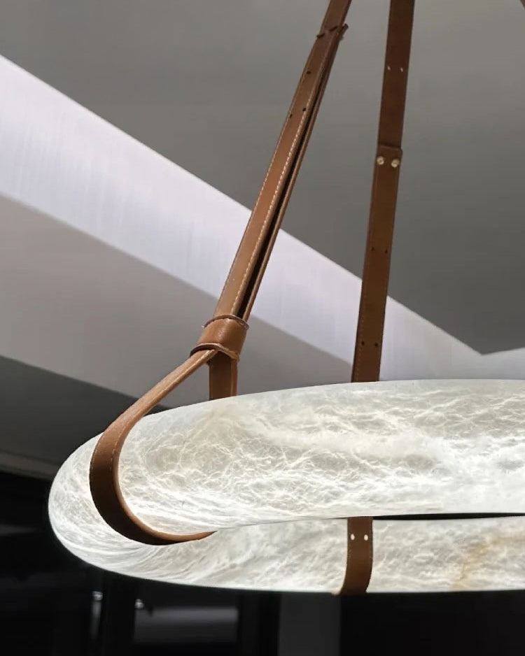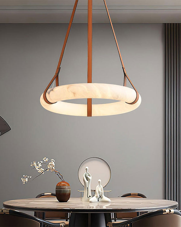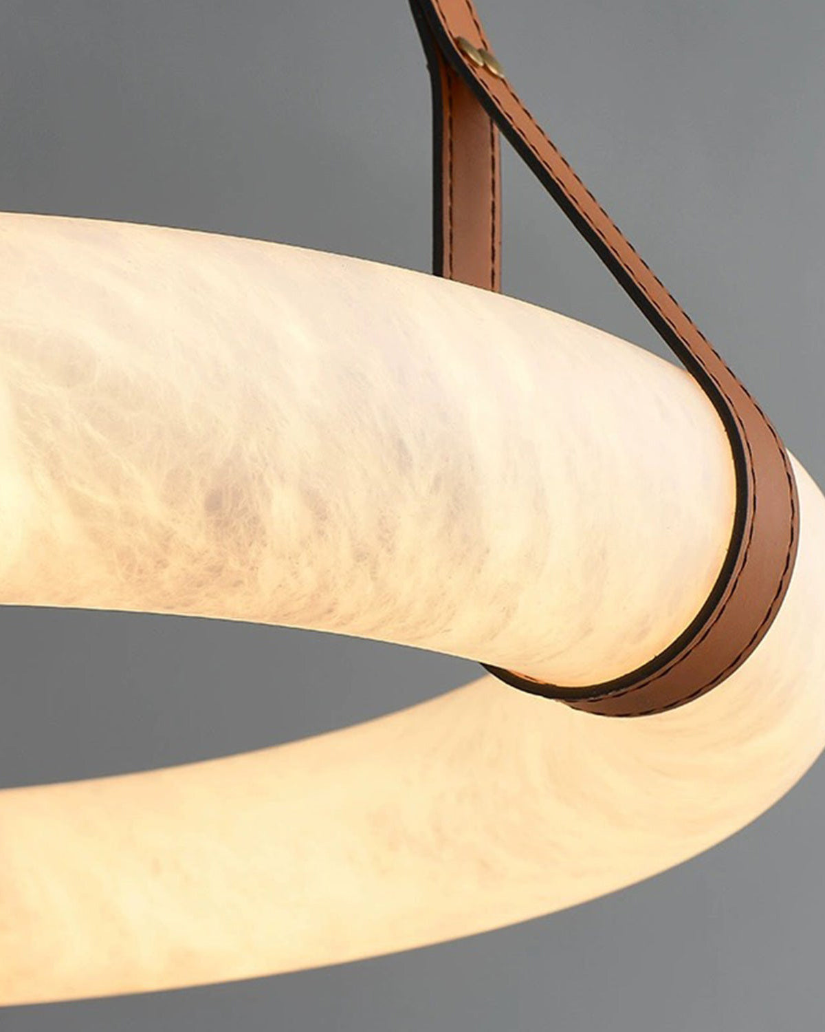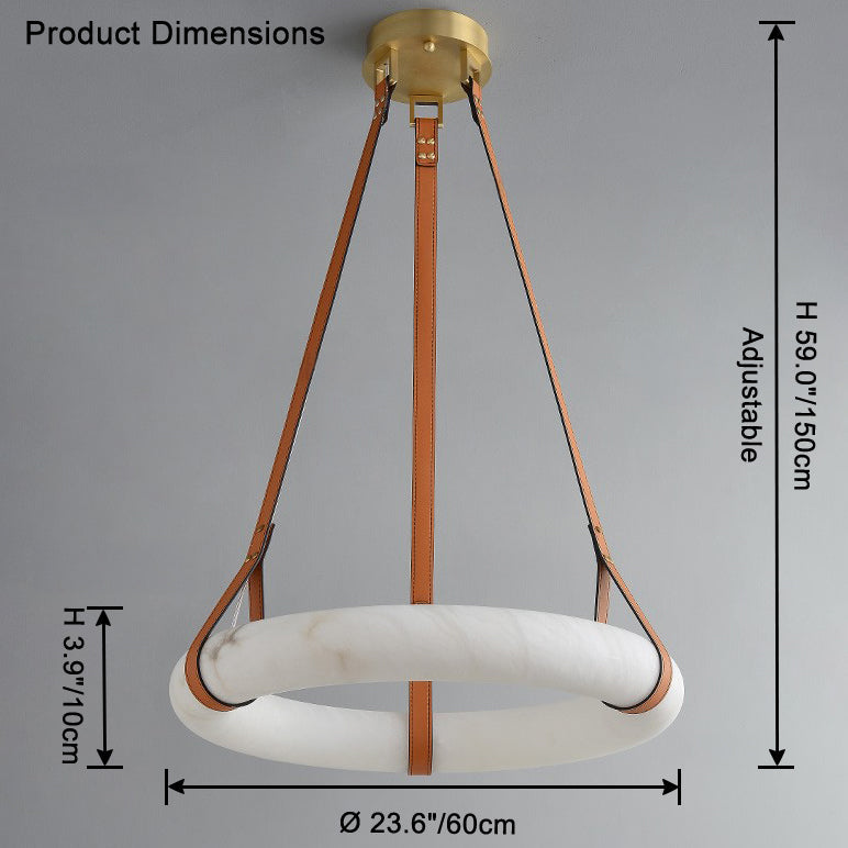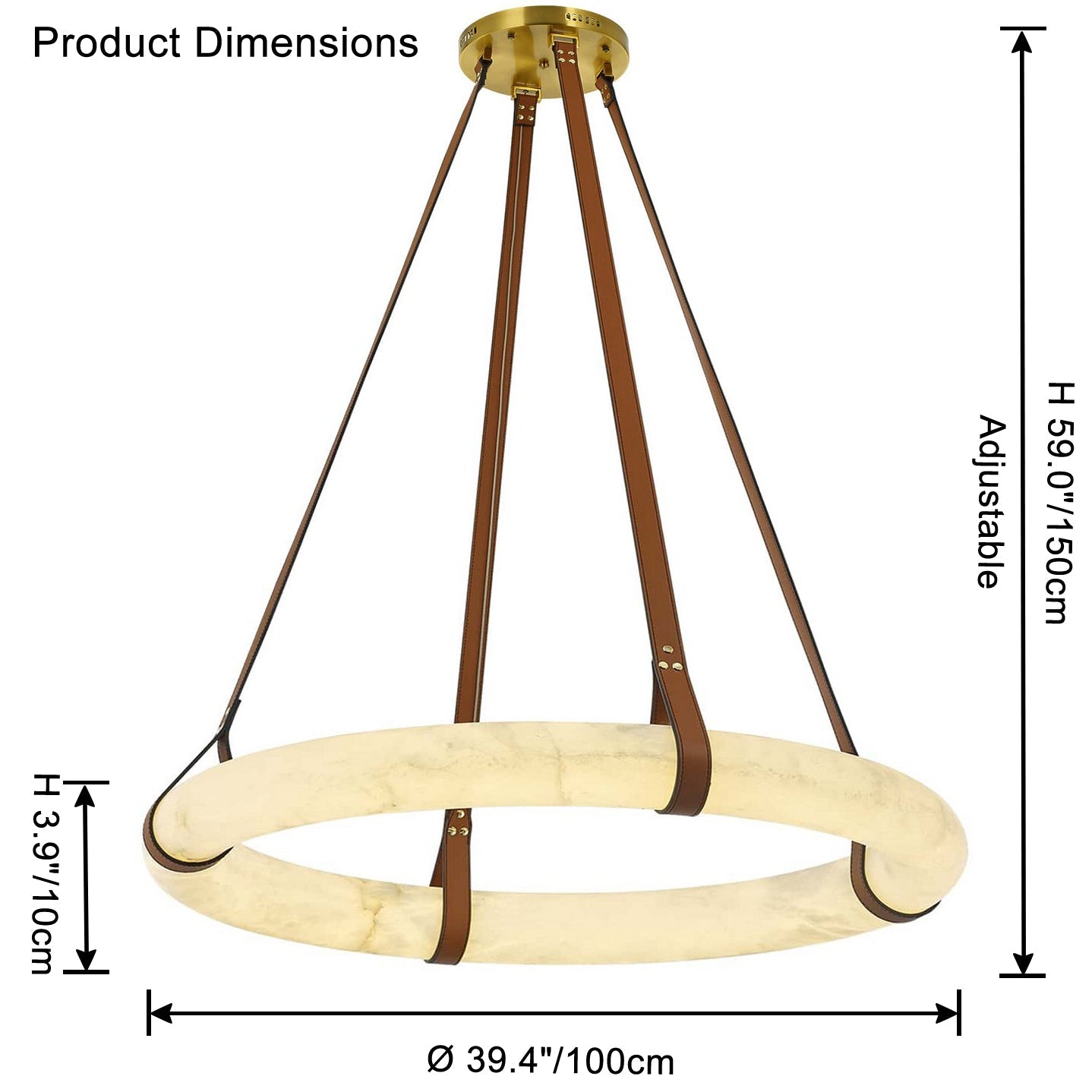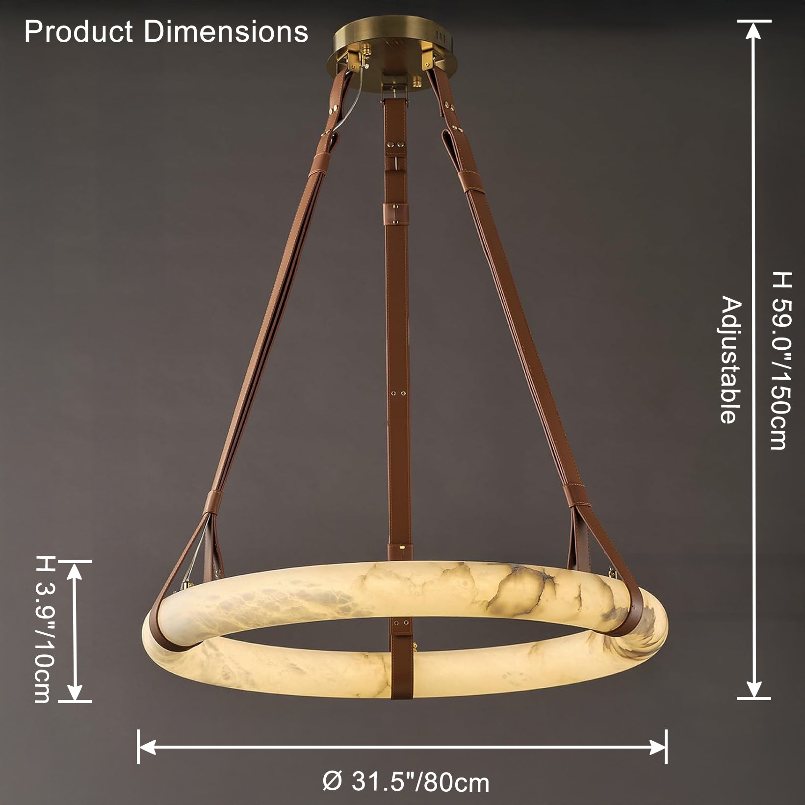 Bring an elegant touch to your dining or living room with our WOMO Luxury Leather Round Marble LED Chandelier. The beautiful alabaster and gold design adds a touch of luxury, while the circular shape creates a warm and welcoming atmosphere. Upgrade your home with style and sophistication.