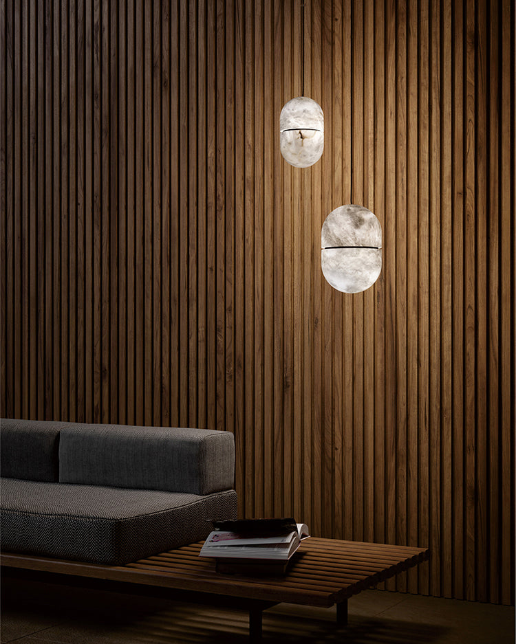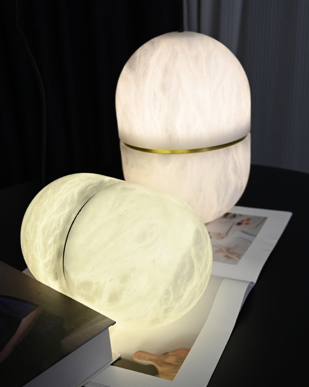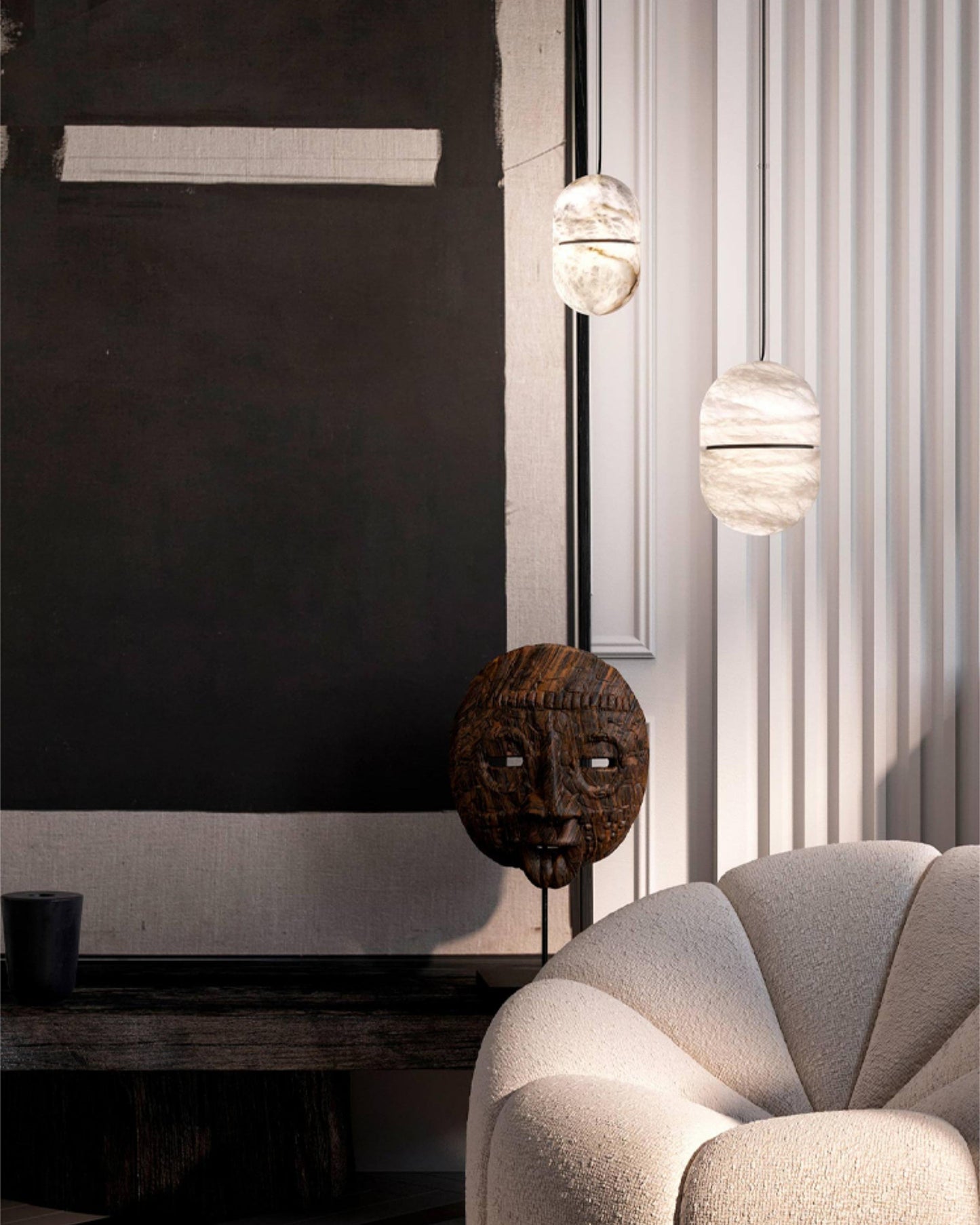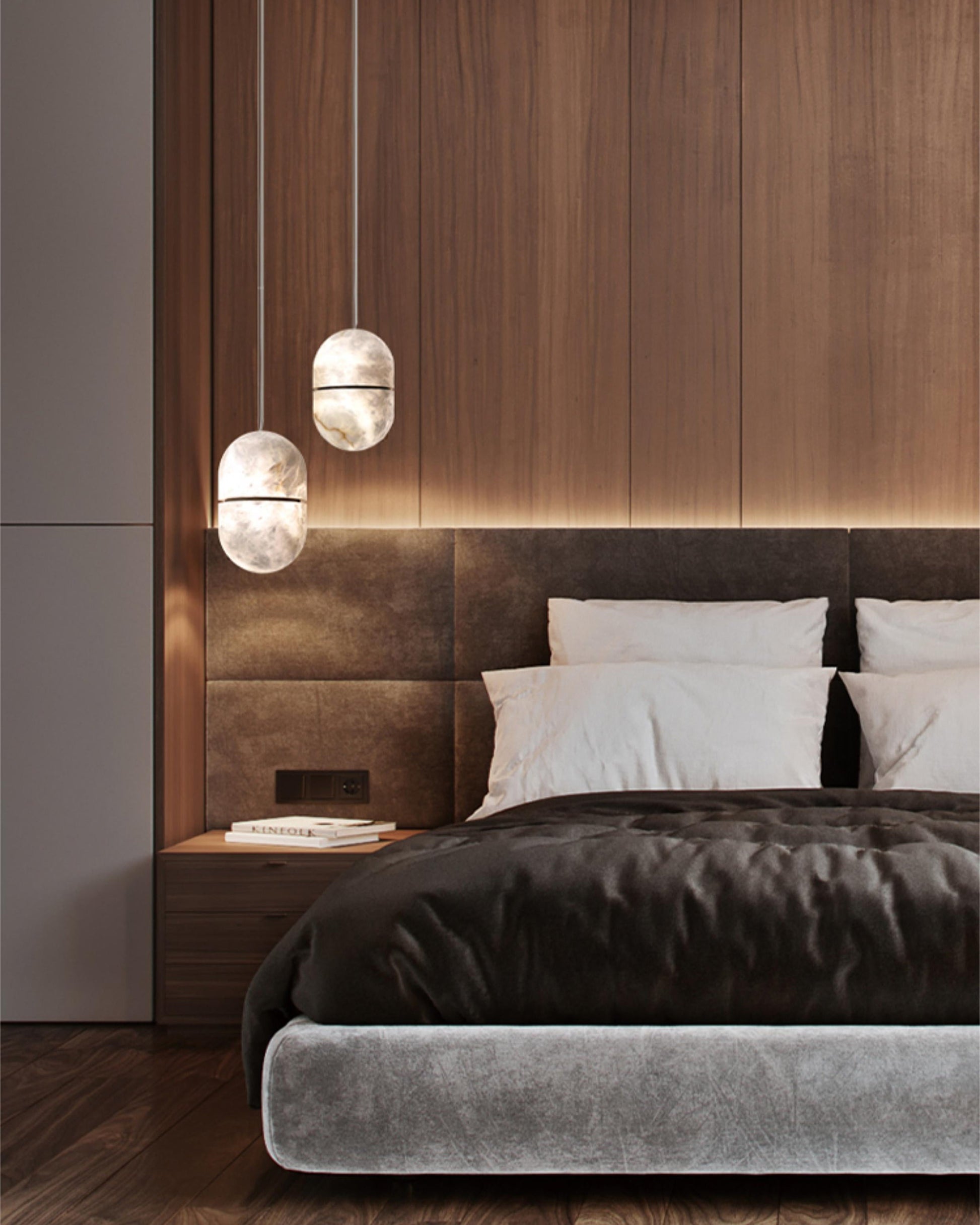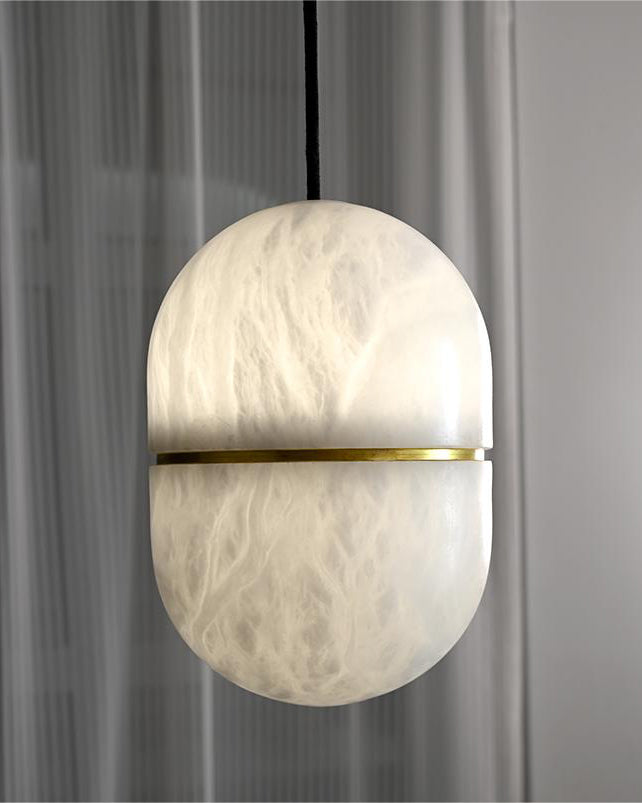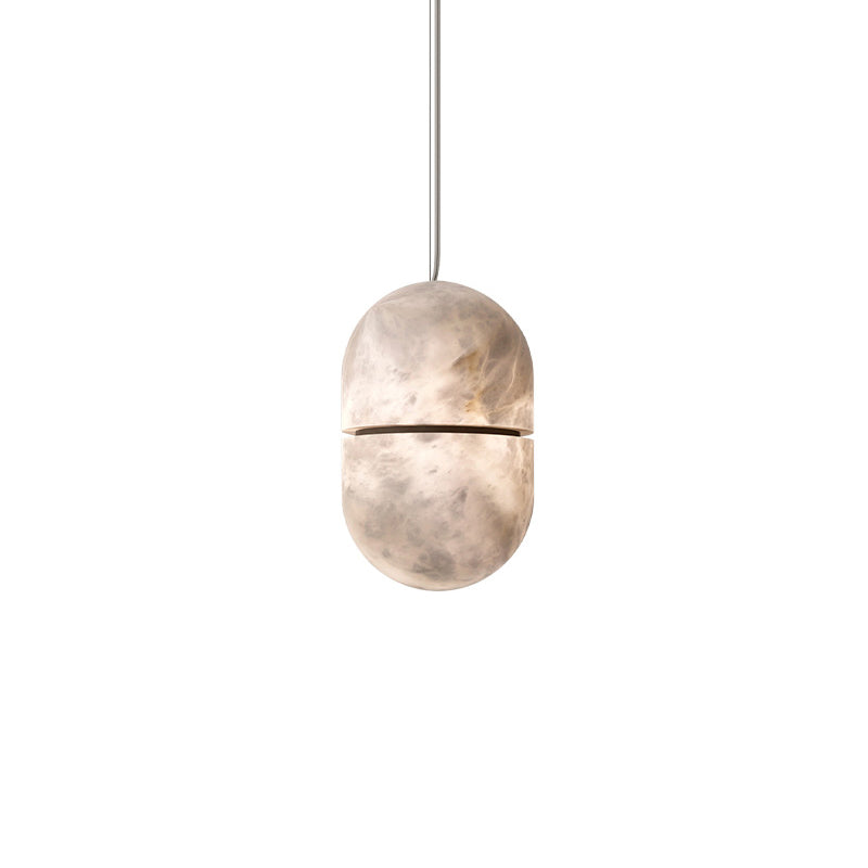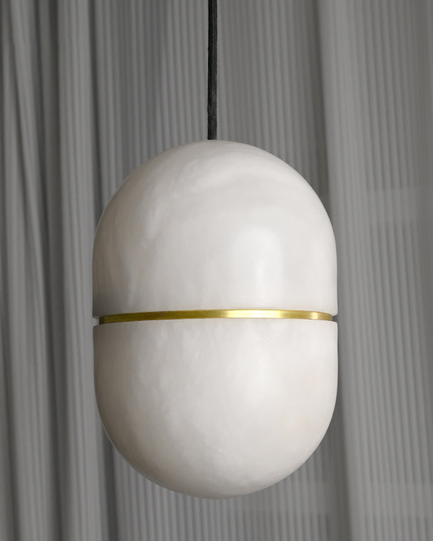 Transform your bedroom into a luxurious haven with the contemporary WOMO Alabaster Oval Pendant Light. Its stunning alabaster and gold design adds a touch of elegance while illuminating the room with a warm, ambient light. Elevate your space with this exquisite pendant light.