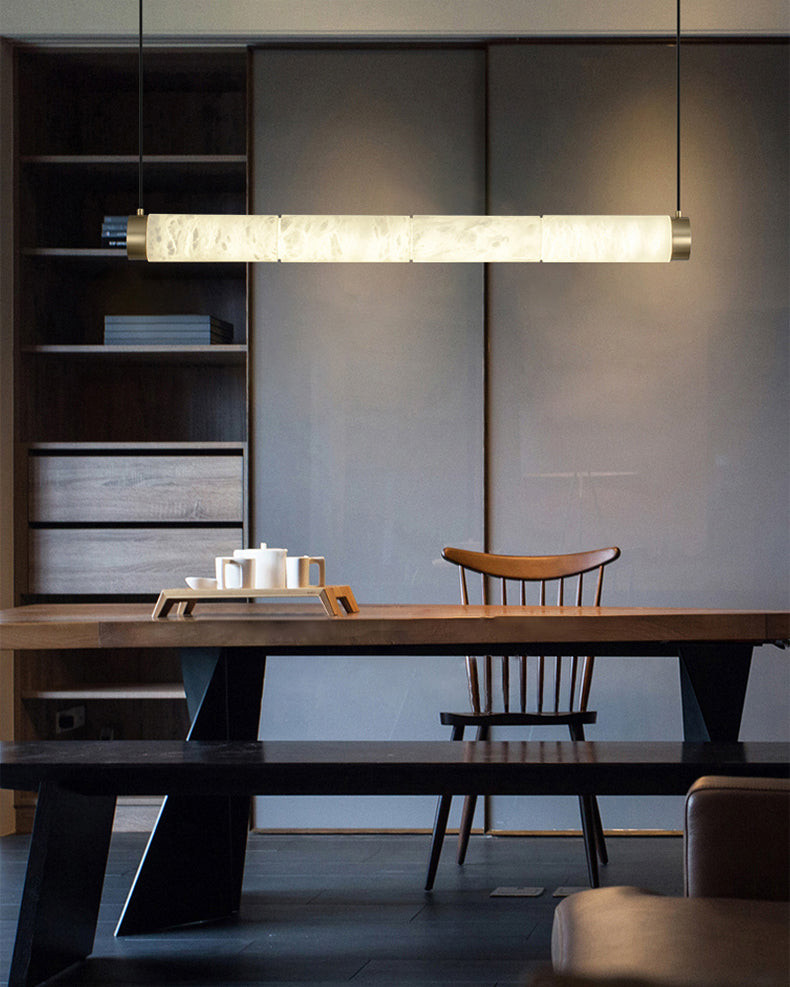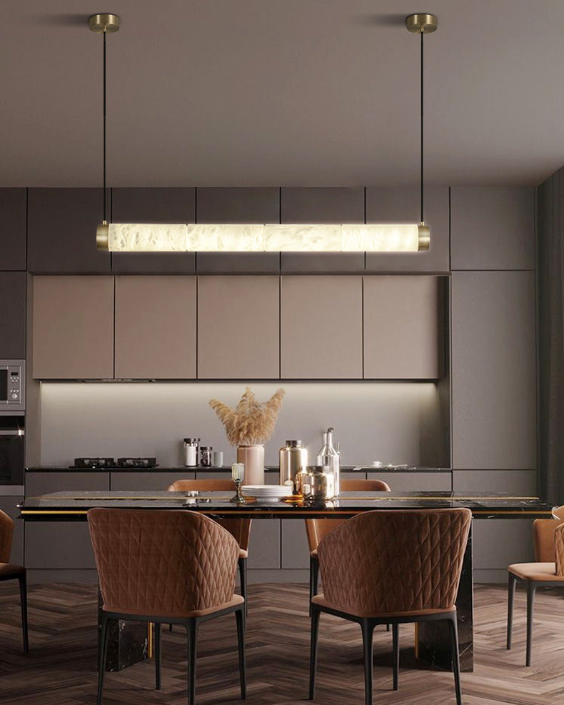 Elevate the atmosphere of your dining room or kitchen with our WOMO Linear Pendant Light. Its contemporary design, combined with alabaster and gold finishes, adds a touch of elegance to any space. The linear shape not only complements modern settings, but also provides ample lighting for your dining and cooking needs.