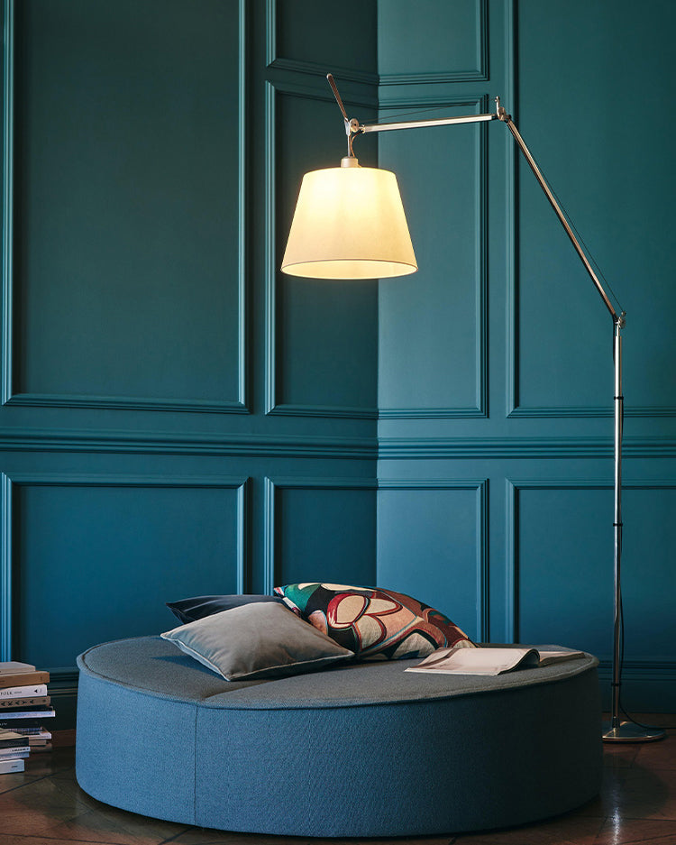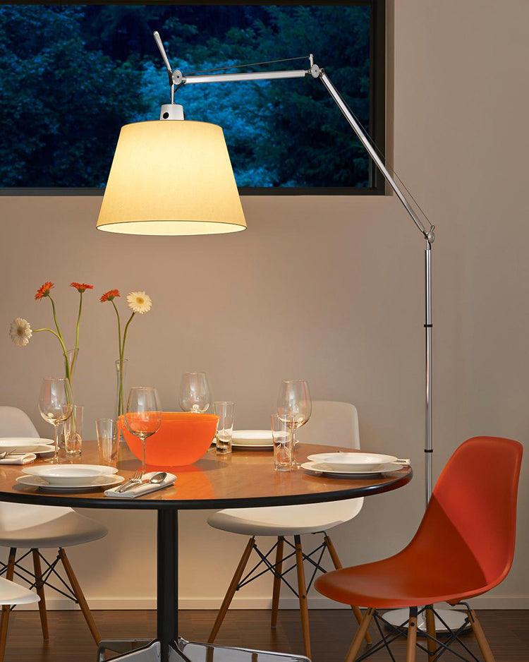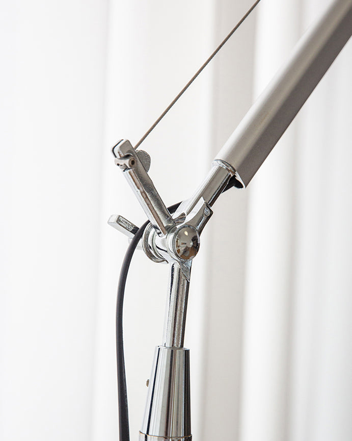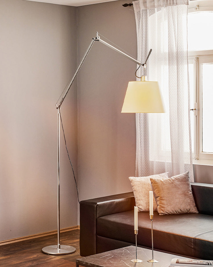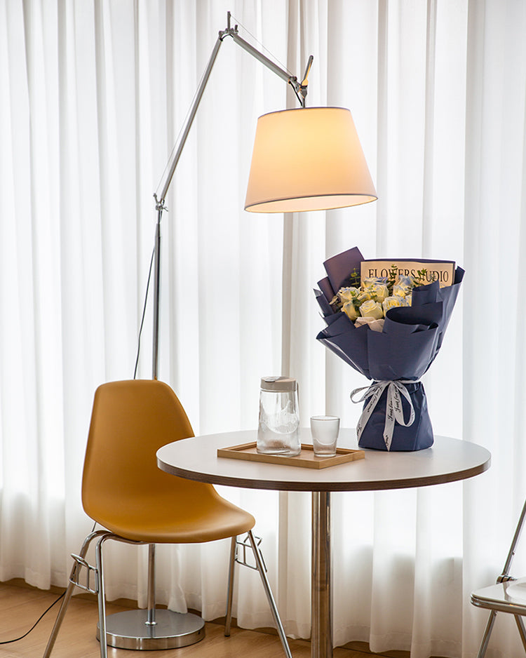 Elevate your living room or bedroom with the sleek and industrial design of the WOMO Articulating Floor Lamp. Made with high-quality fabric and chrome, this lamp adds a touch of sophistication to any space. Bring a warm and inviting ambiance to your home with its soft silver glow.
