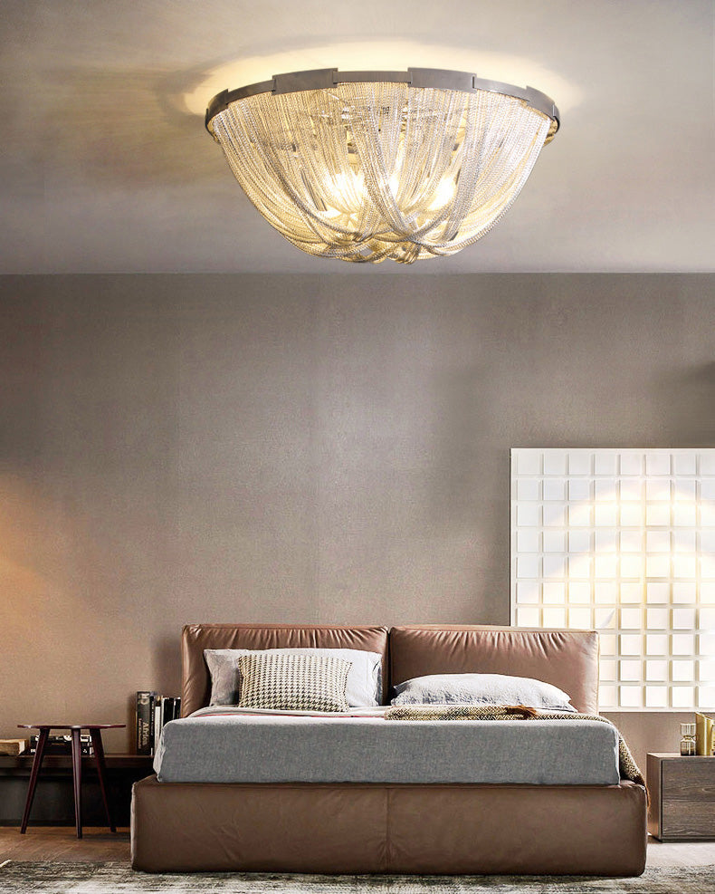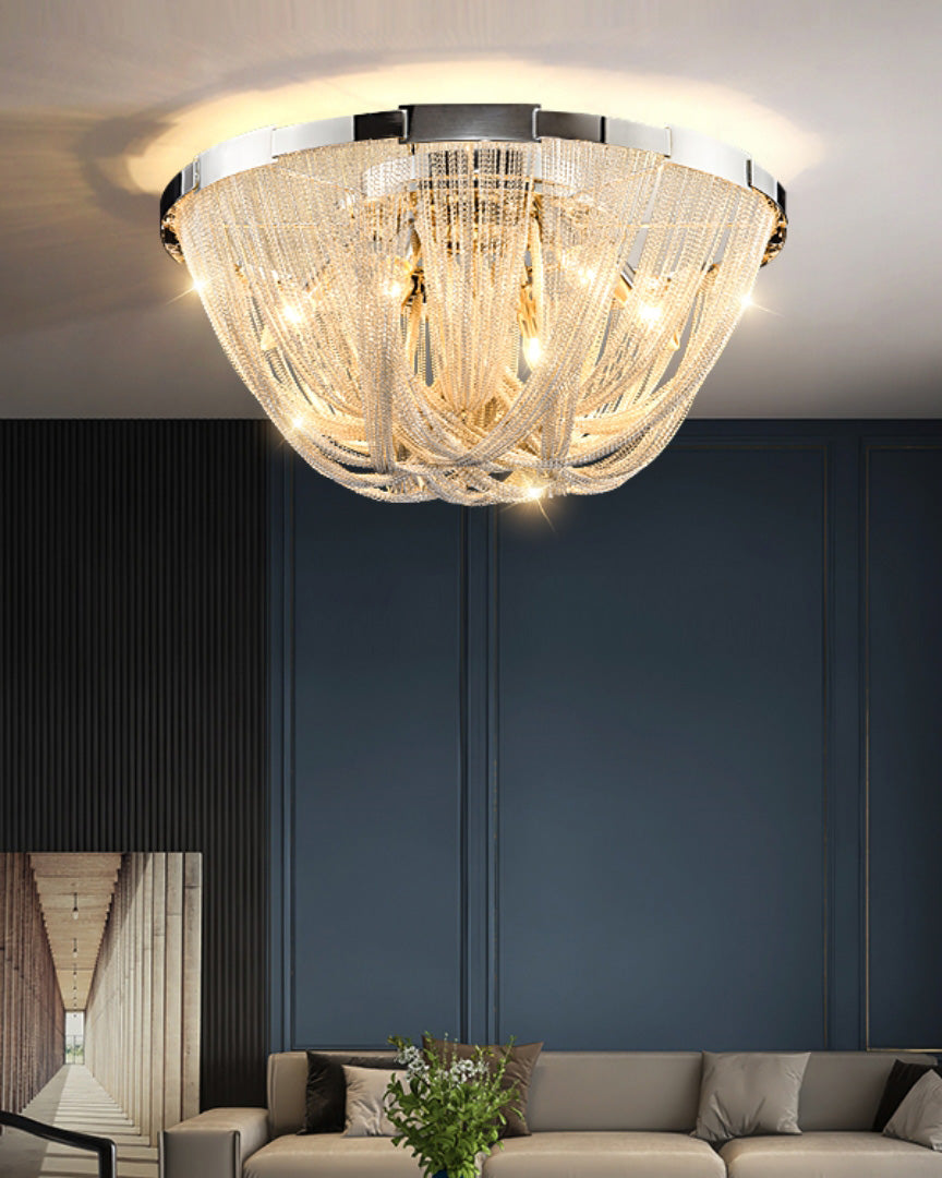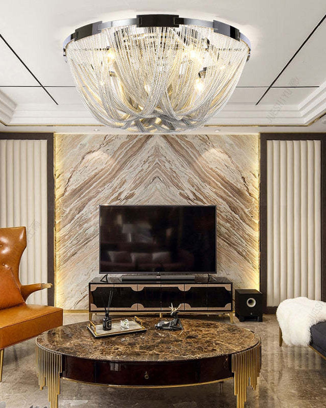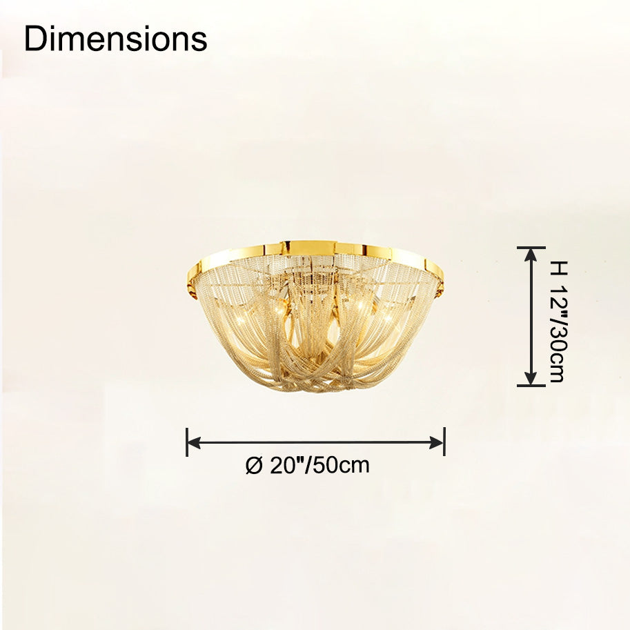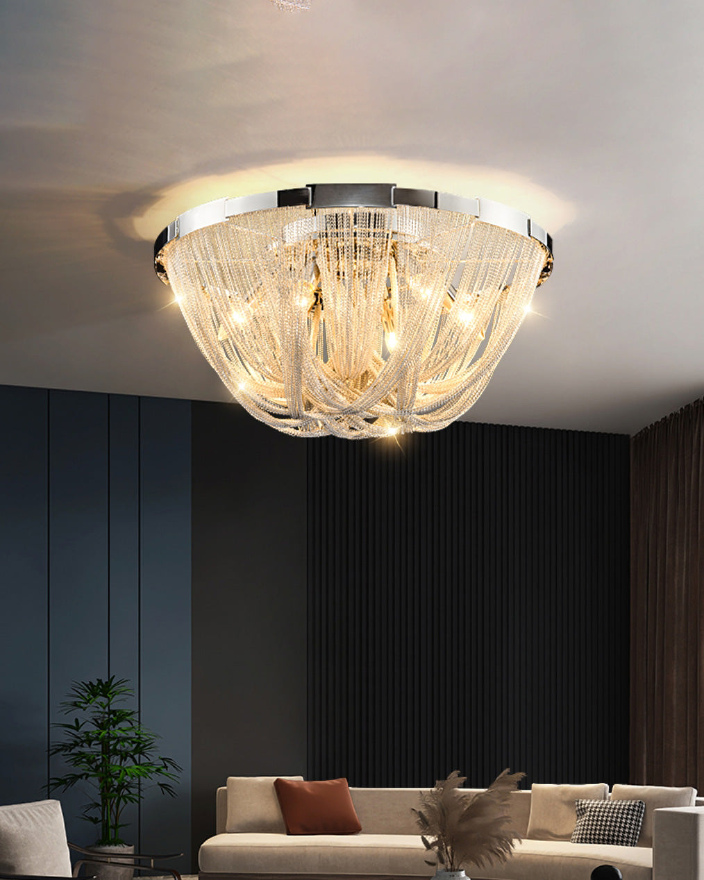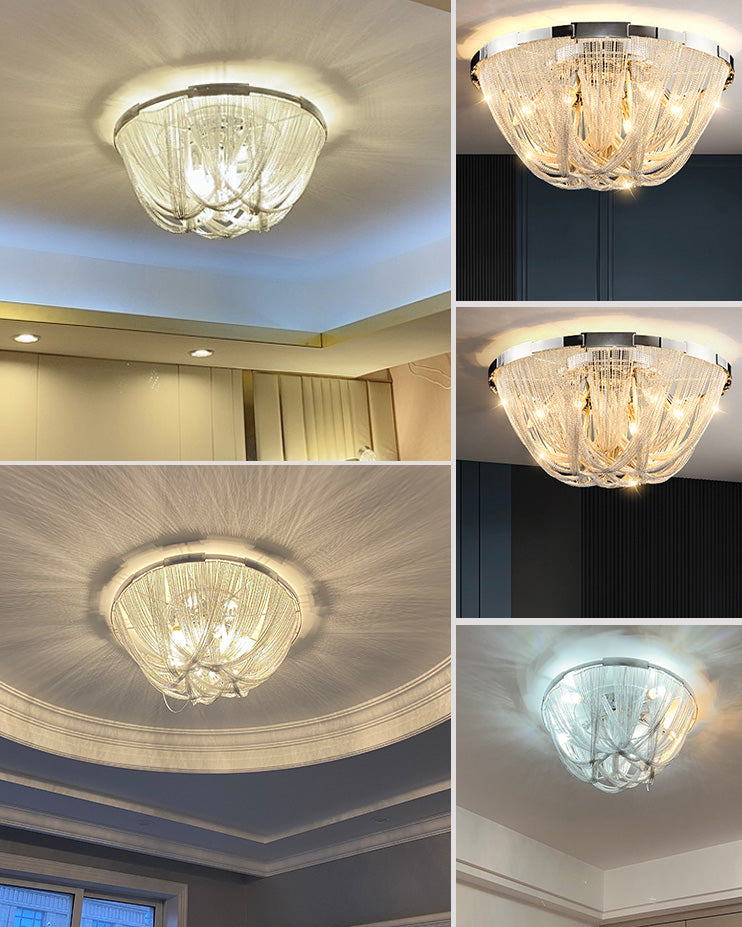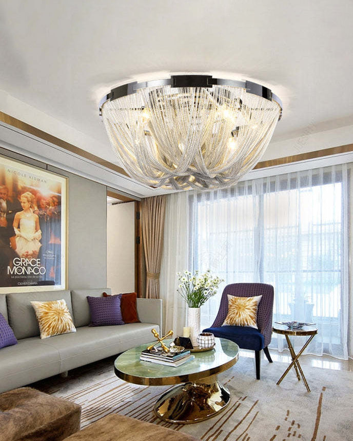 Bring a touch of luxury to your home with the WOMO Luxury Chain Tassel Ceiling Light. The Art Deco design and metal construction of this light fixture exude elegance and sophistication. The chrome and gold finish adds a glamorous touch to any bedroom or living room. Elevate your space with this stunning ceiling light!
