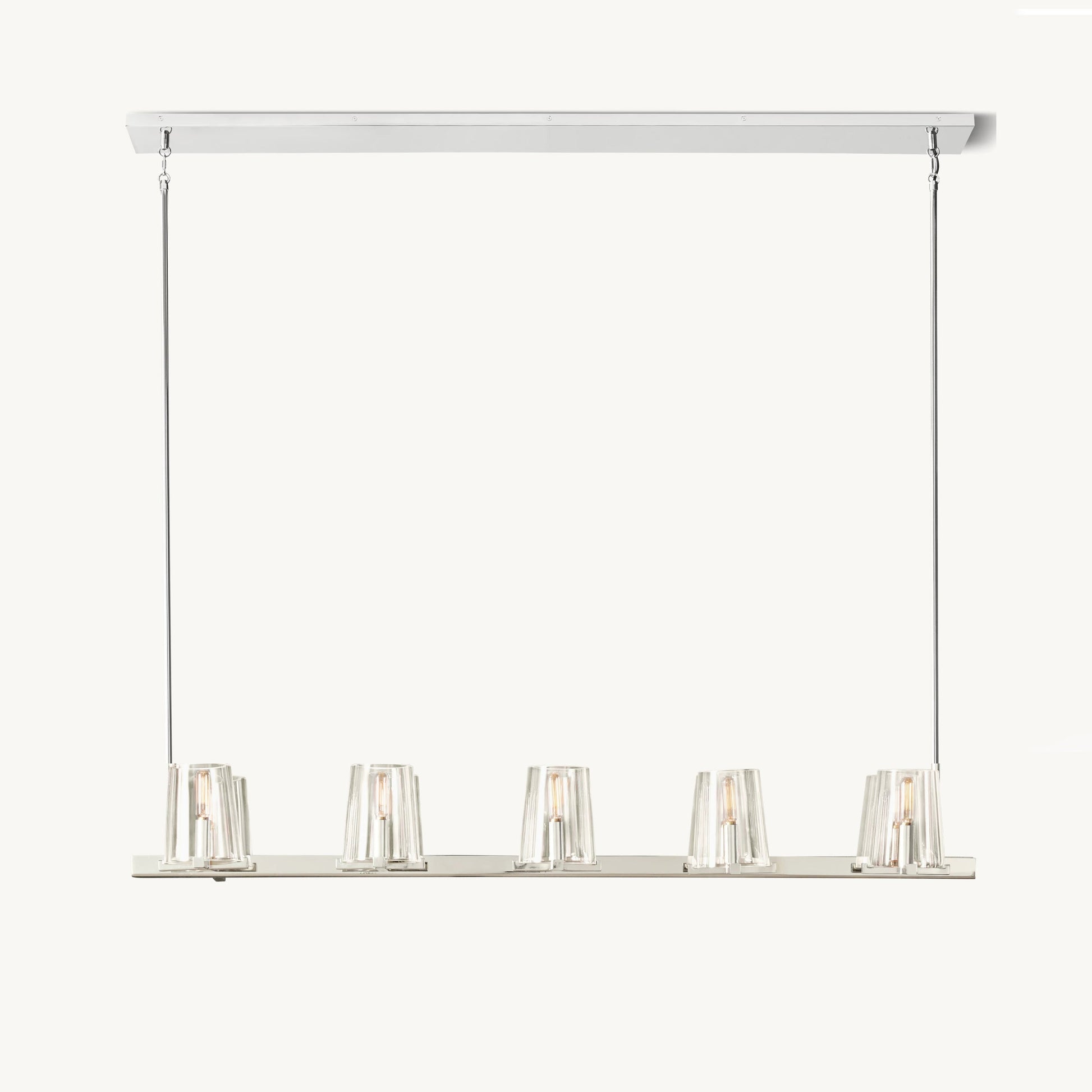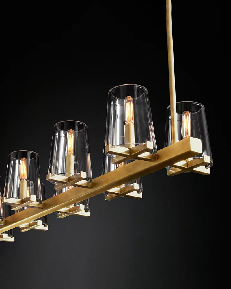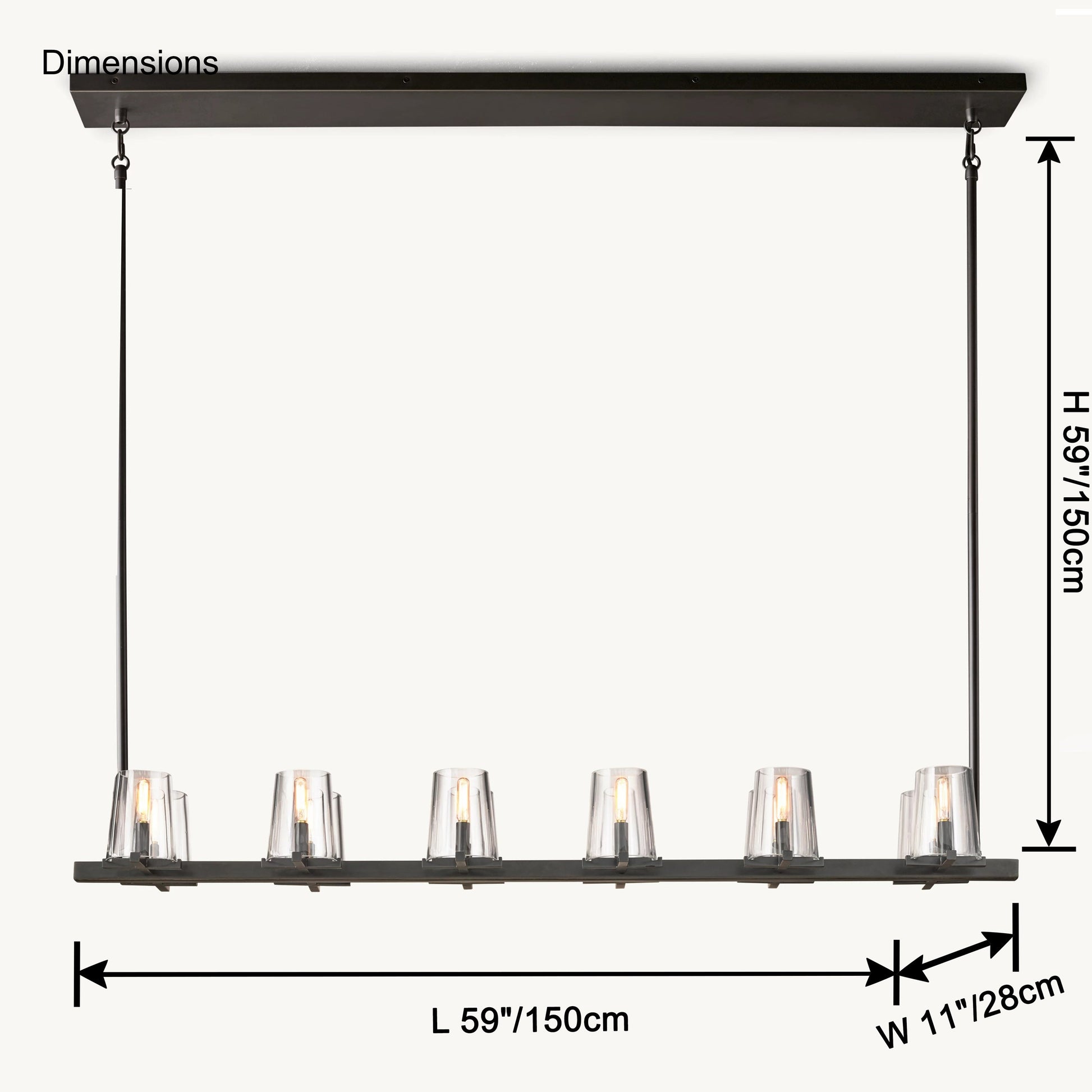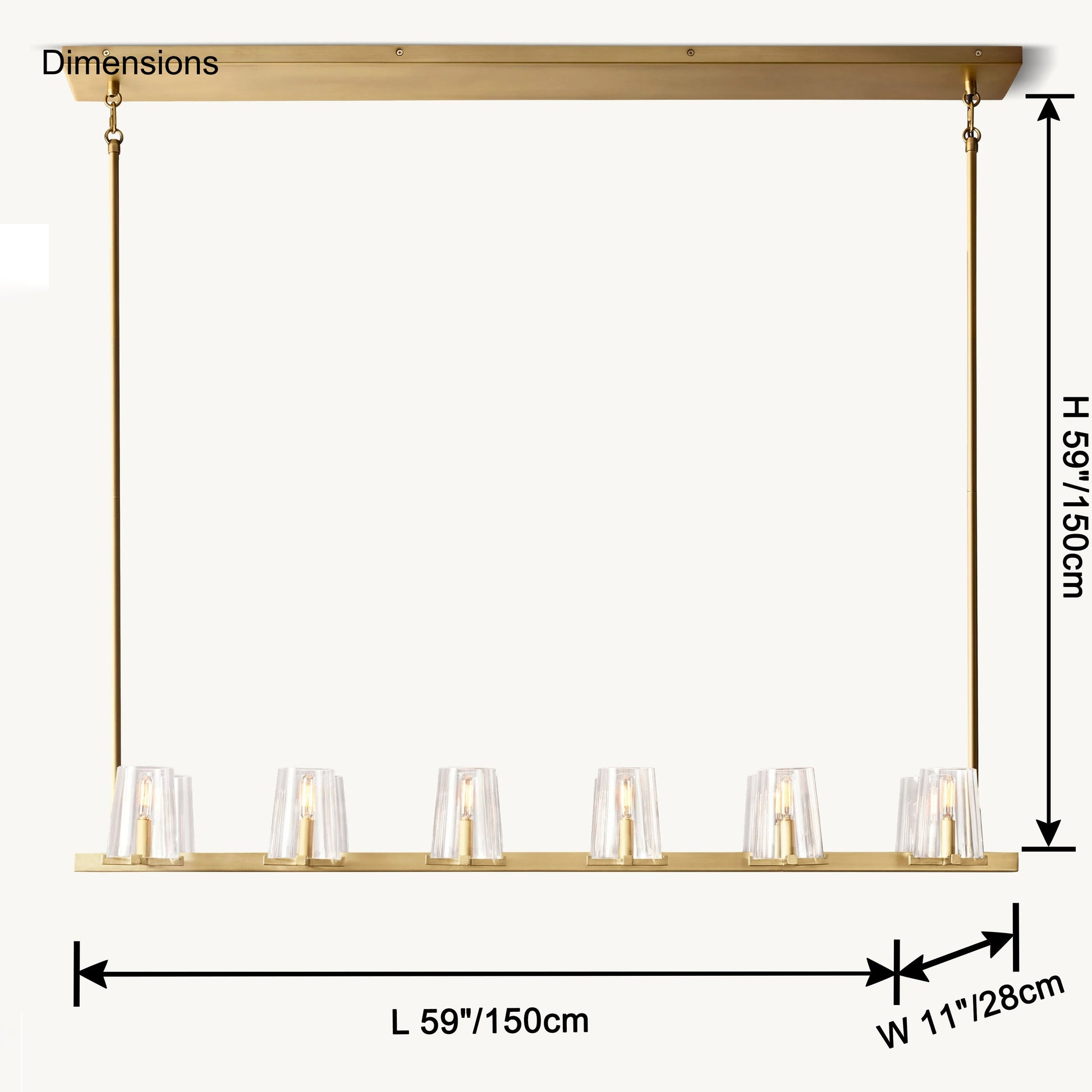 Elevate your dining room with our stunning WOMO Glass Pillar Candle Linear Chandelier. Embodying Art Deco style and available in gold, silver, or black, this chandelier features linear design and elegant glass detailing. Create a warm and inviting ambiance with the glow of pillar candles.