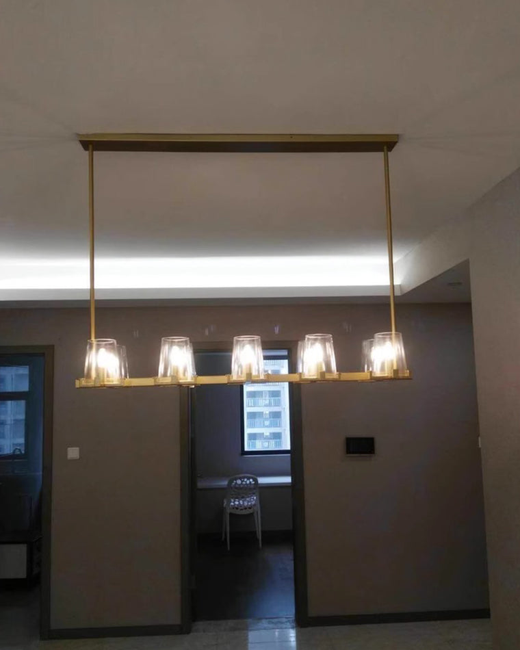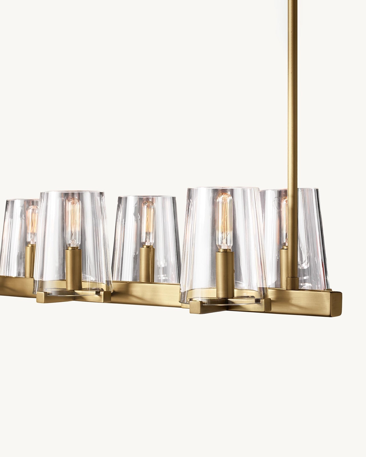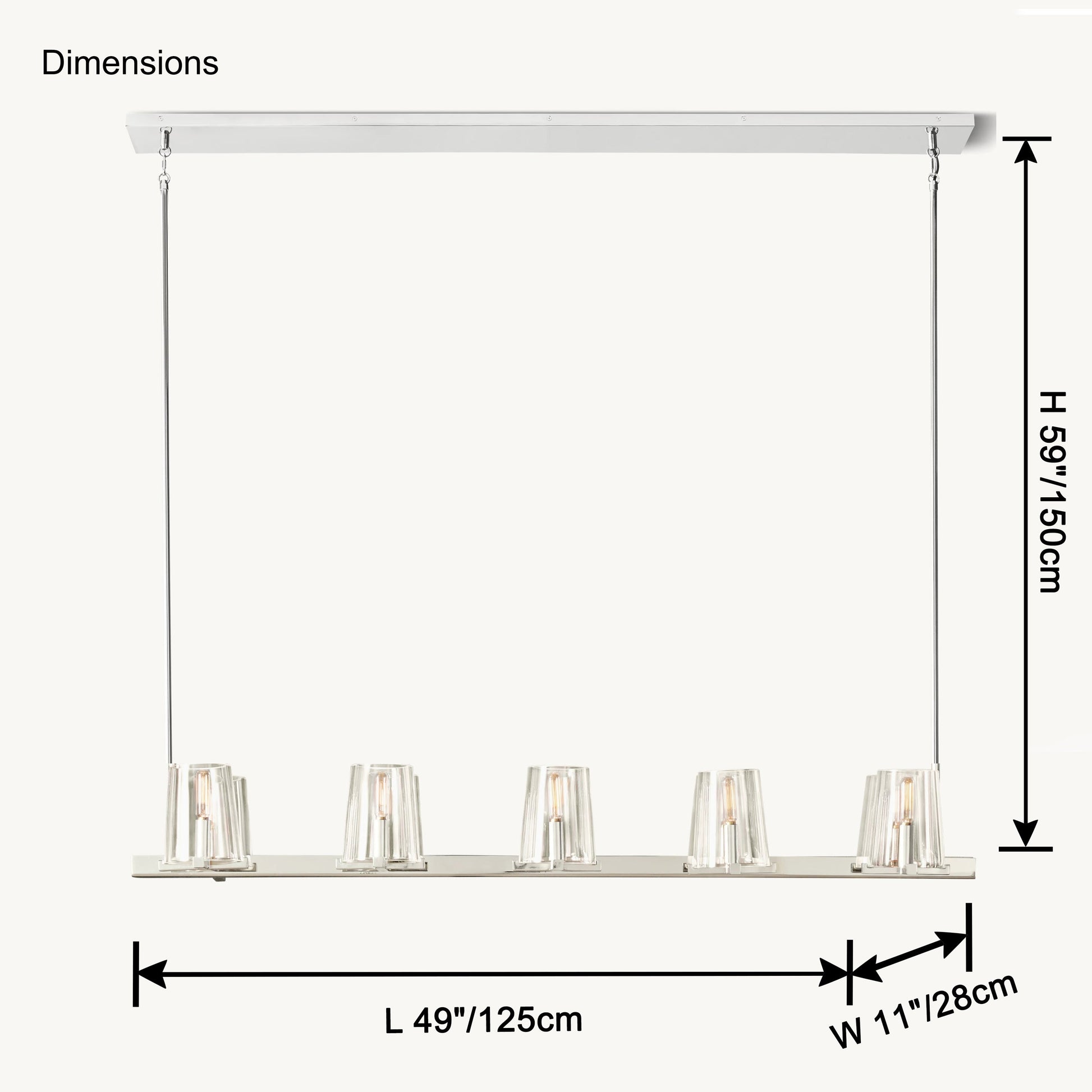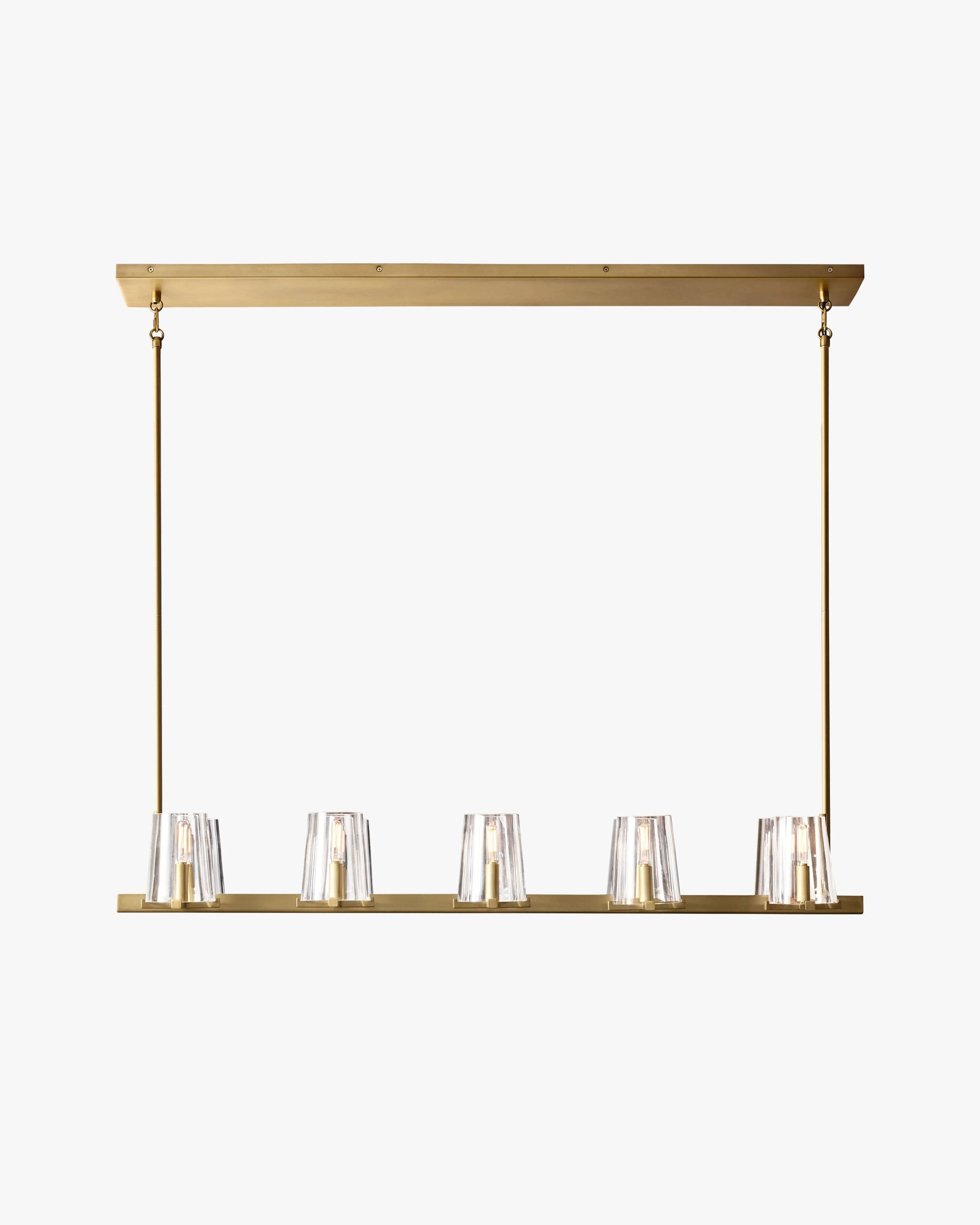 Elevate your dining room with our stunning WOMO Glass Pillar Candle Linear Chandelier. Embodying Art Deco style and available in gold, silver, or black, this chandelier features linear design and elegant glass detailing. Create a warm and inviting ambiance with the glow of pillar candles.