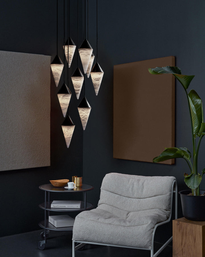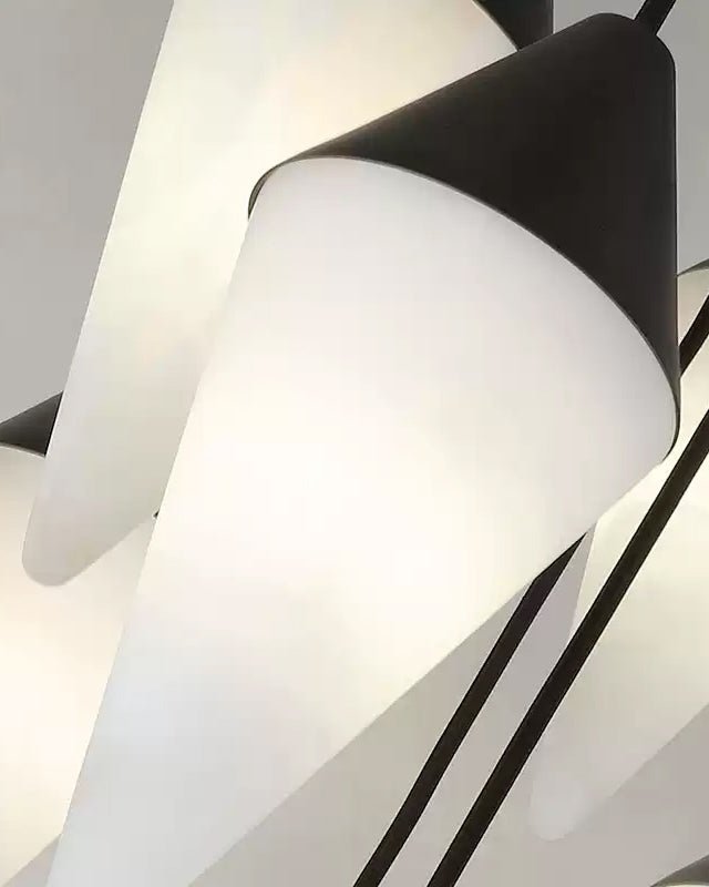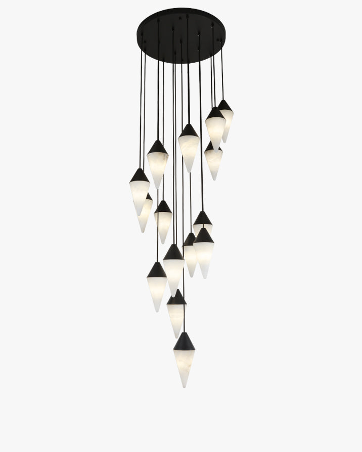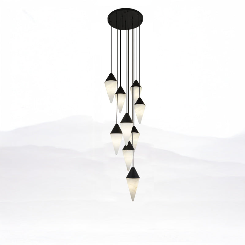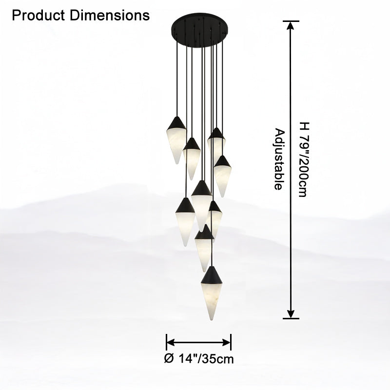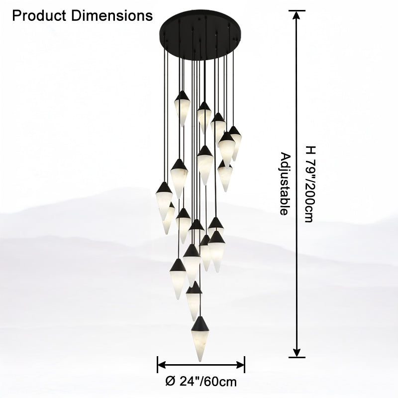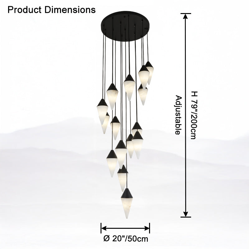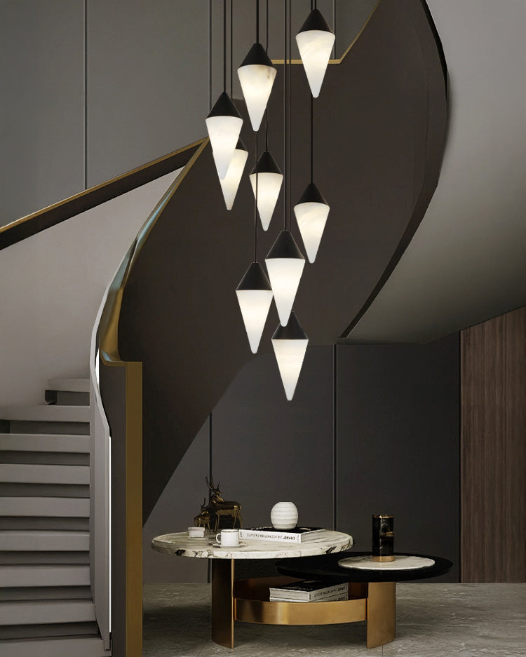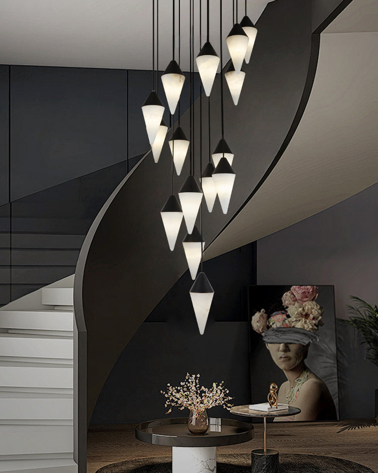 Add modern elegance to your staircase, foyer or dining room with WOMO's Hanging Linear Design Alabaster Chandeliers. The striking combination of black and alabaster creates a stylish focal point. Its linear design and unique cone shape will transform any space into a chic and sophisticated retreat!