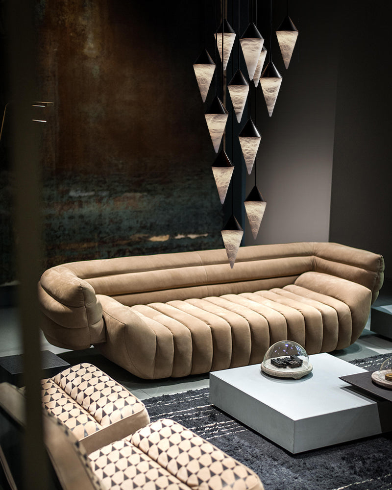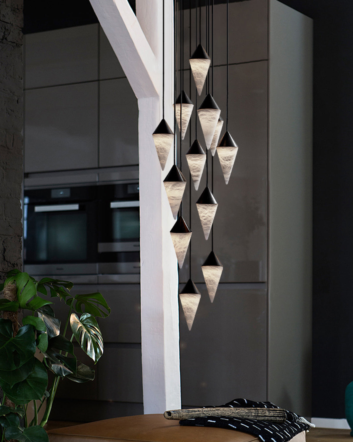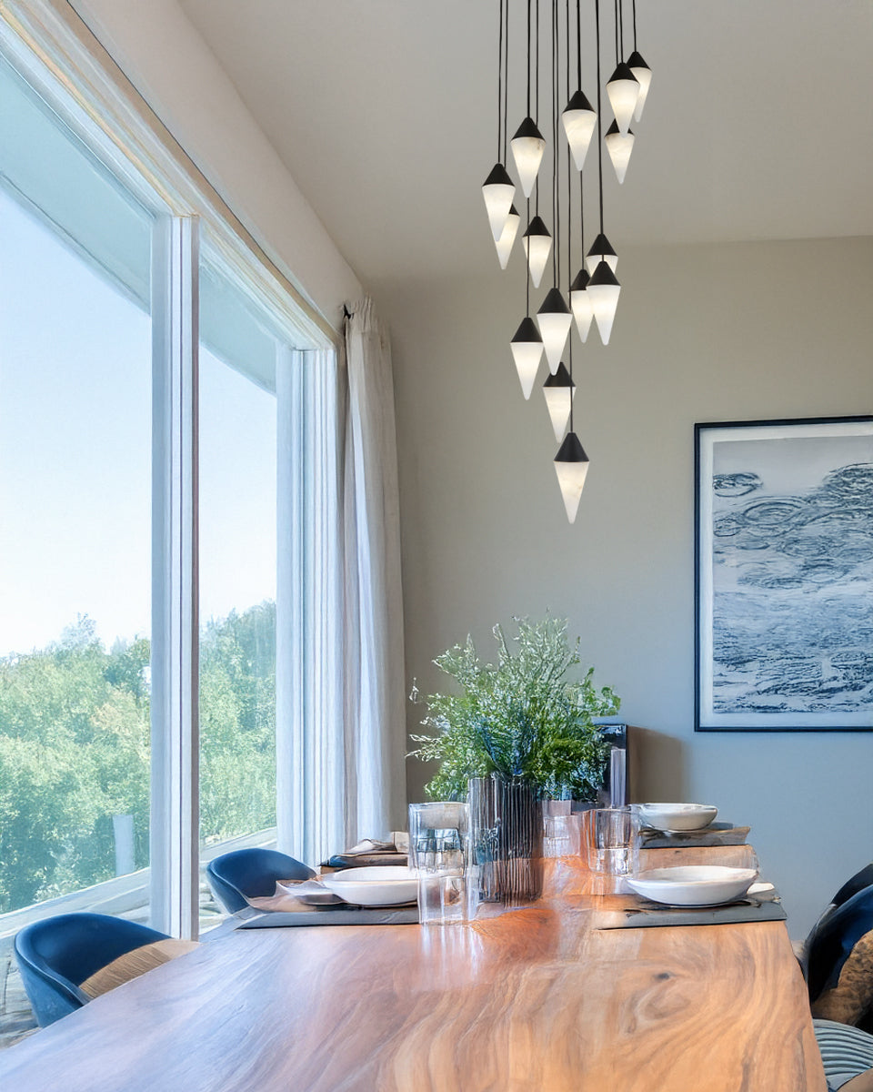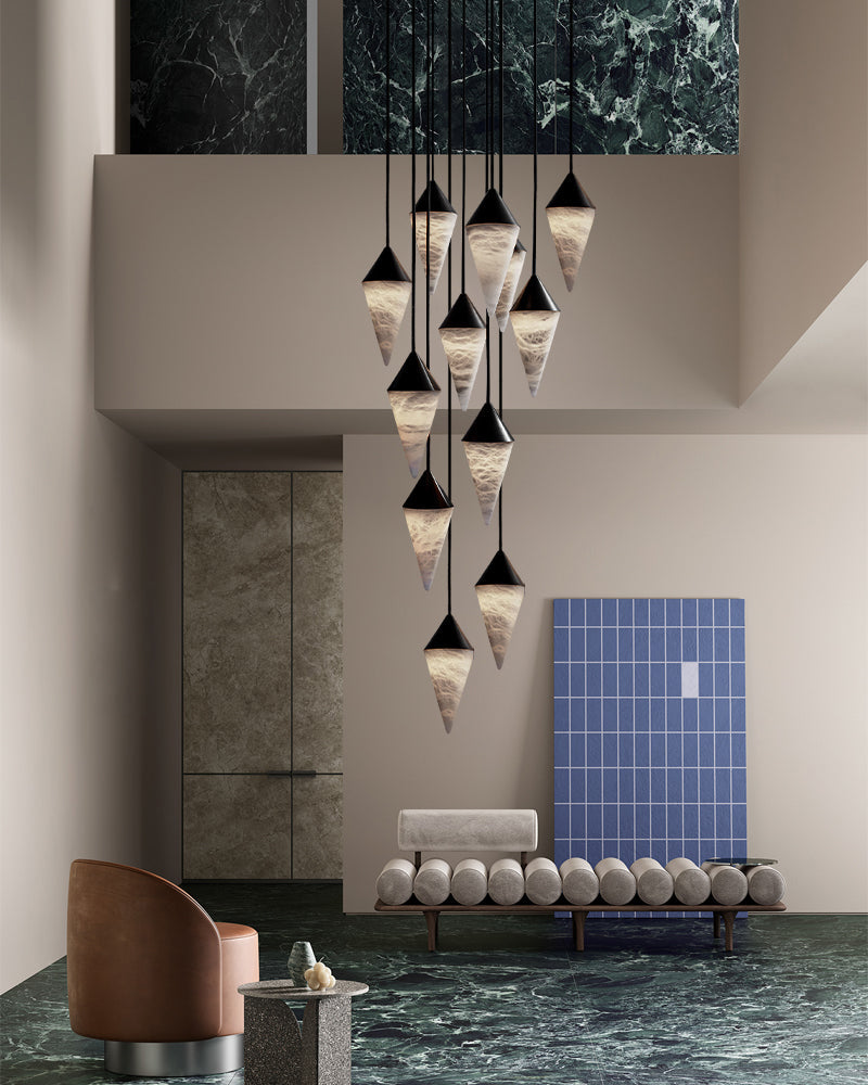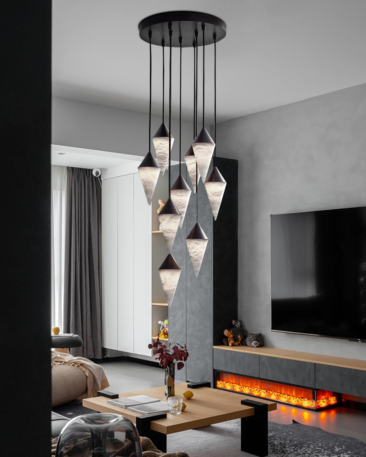 Add modern elegance to your staircase, foyer or dining room with WOMO's Hanging Linear Design Alabaster Chandeliers. The striking combination of black and alabaster creates a stylish focal point. Its linear design and unique cone shape will transform any space into a chic and sophisticated retreat!
