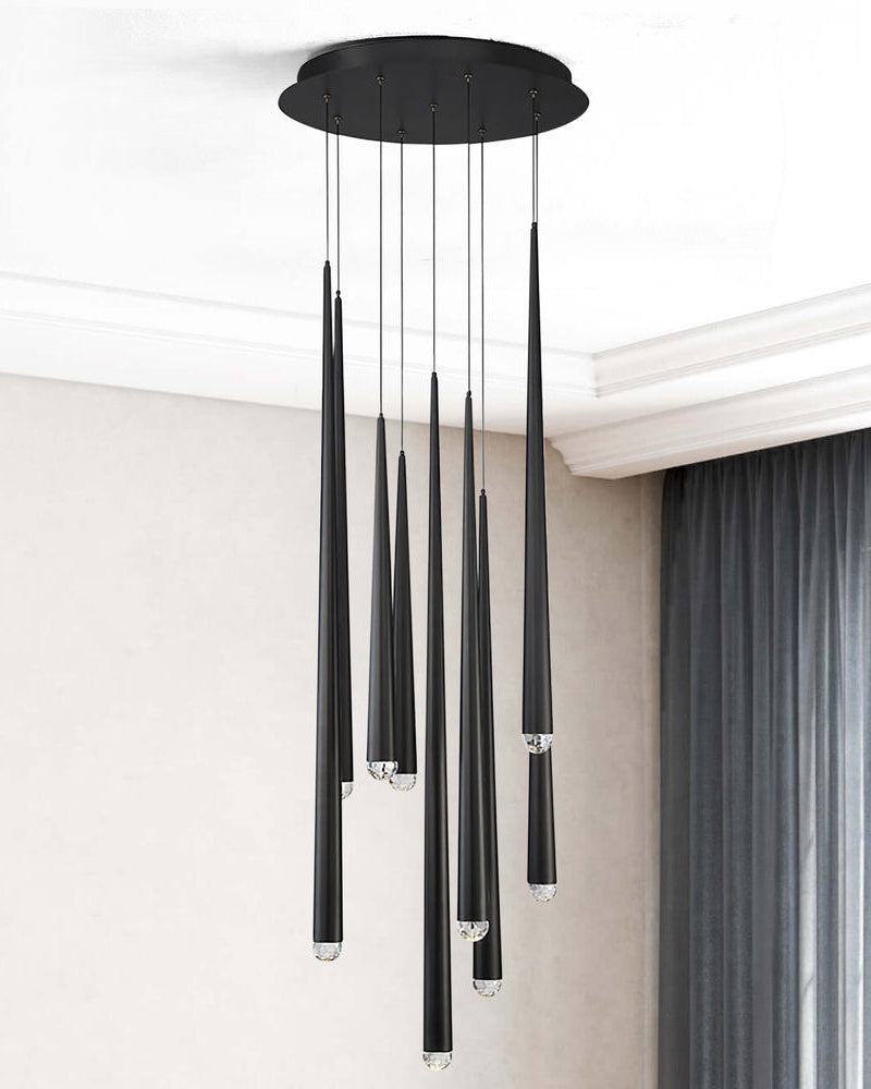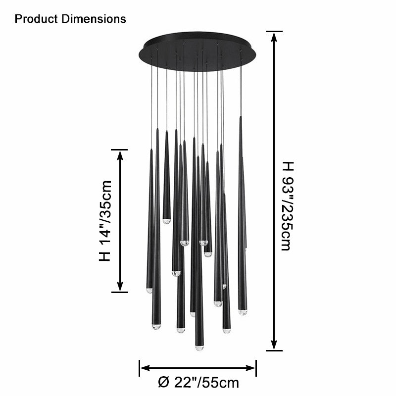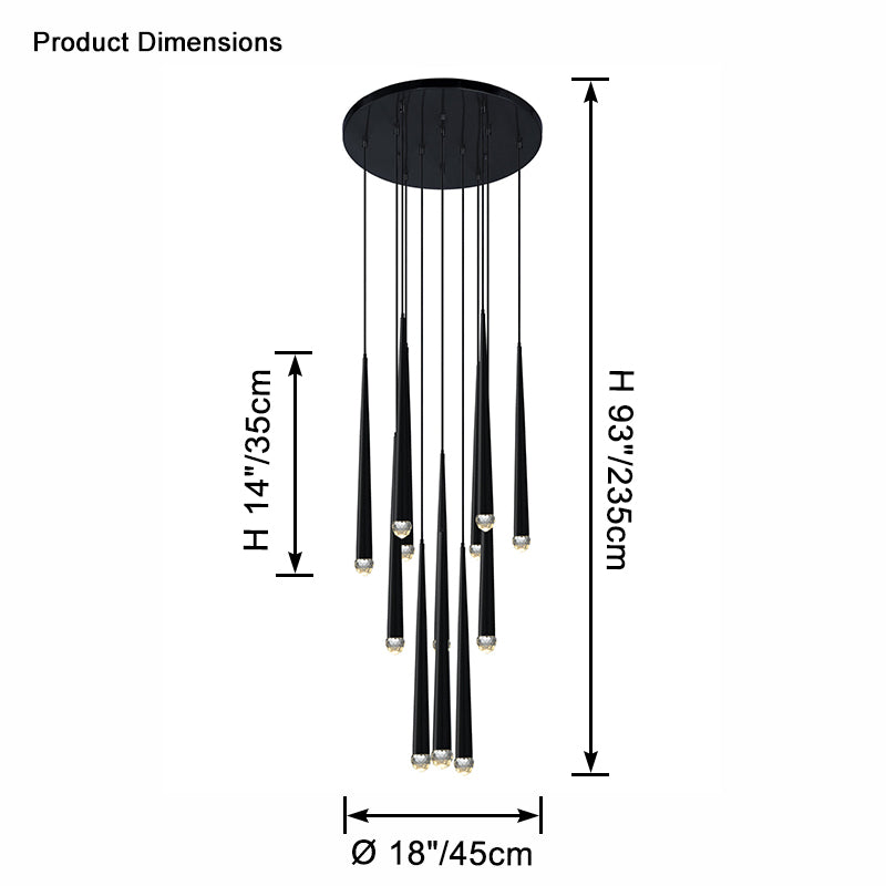Transform your space into a luxurious oasis with the captivating WOMO Cascade Cone Chandelier. Crafted from black and gold metal and adorned with sparkling crystals, this minimalist-inspired chandelier creates a stunning cascading effect, perfect for illuminating your staircase, dining room, or living room. Elevate your home decor with this elegant and timeless centerpiece!