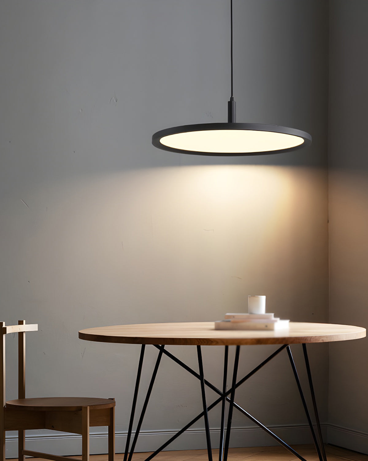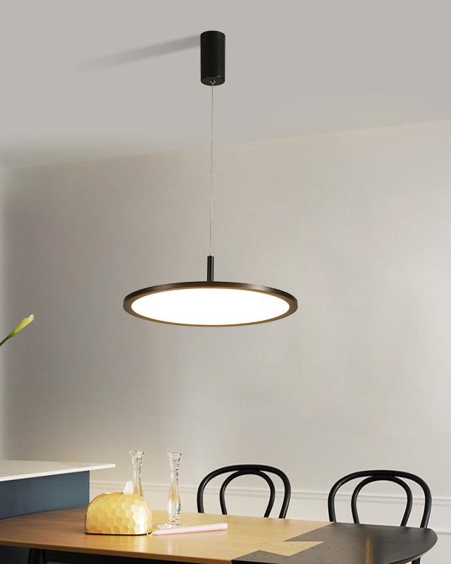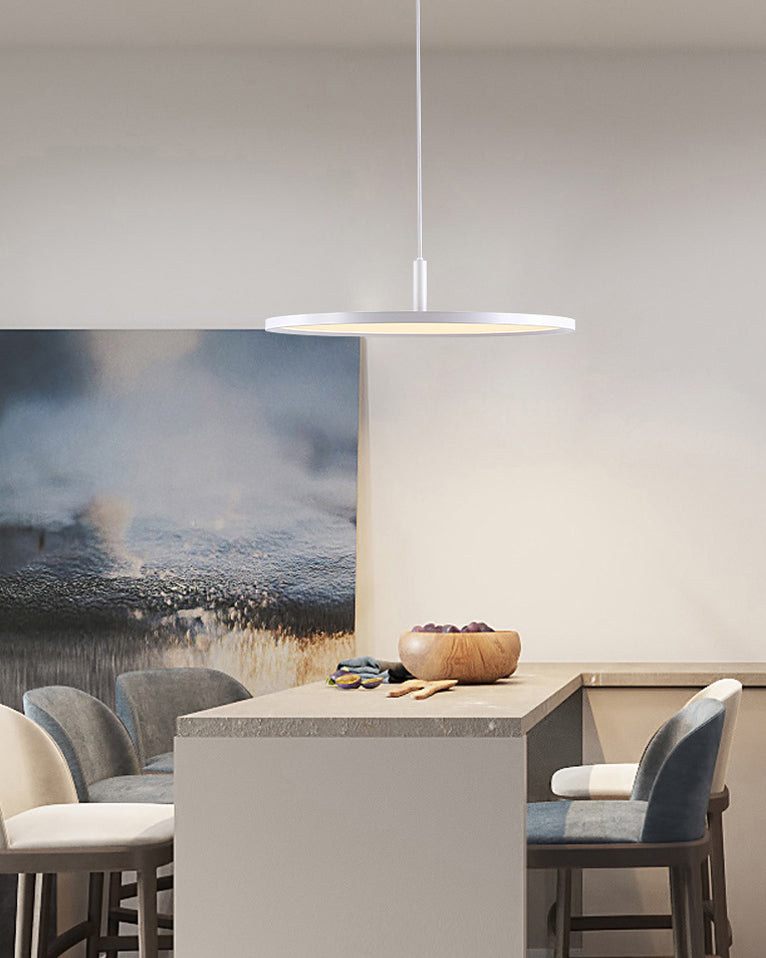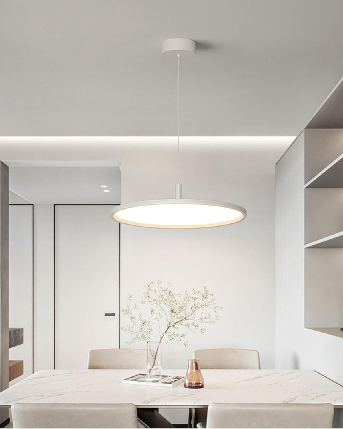 Introducing the WOMO Round Thin Led Pendant Light. This minimalist yet sleek design features a metal frame in black or white, perfect for adding a touch of elegance to any dining room. The round shape adds a modern twist while providing ample lighting. Elevate your dining experience with this must-have pendant light!
