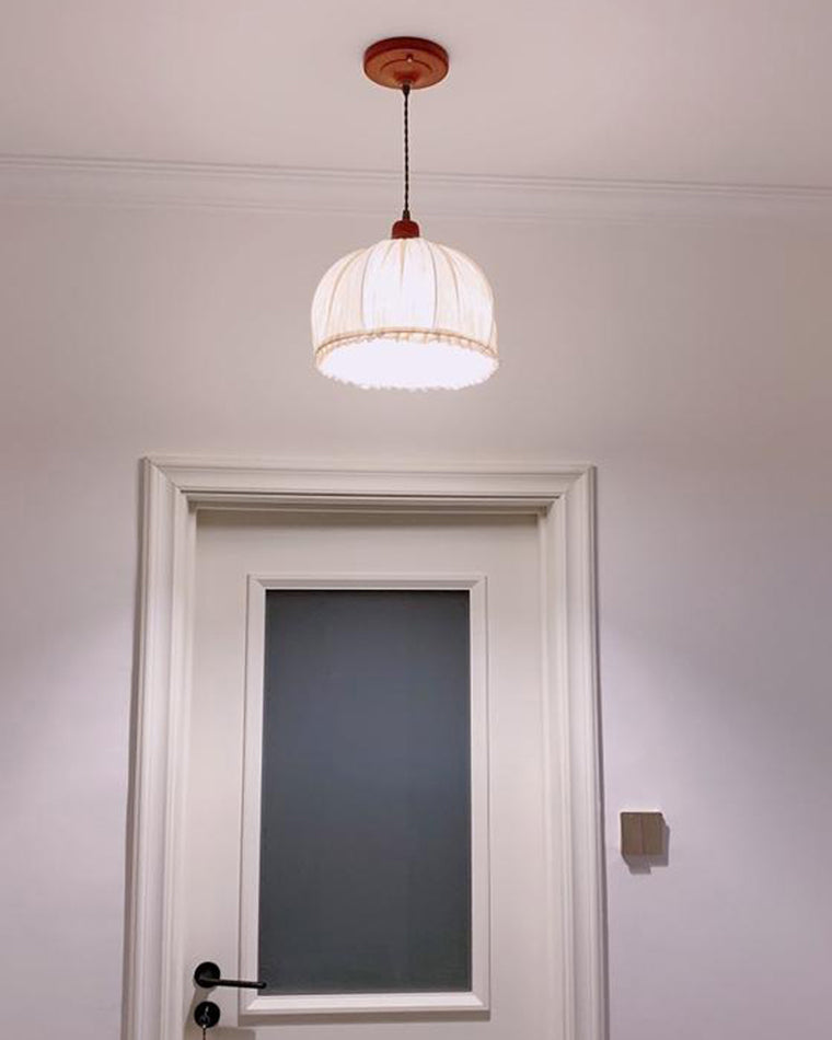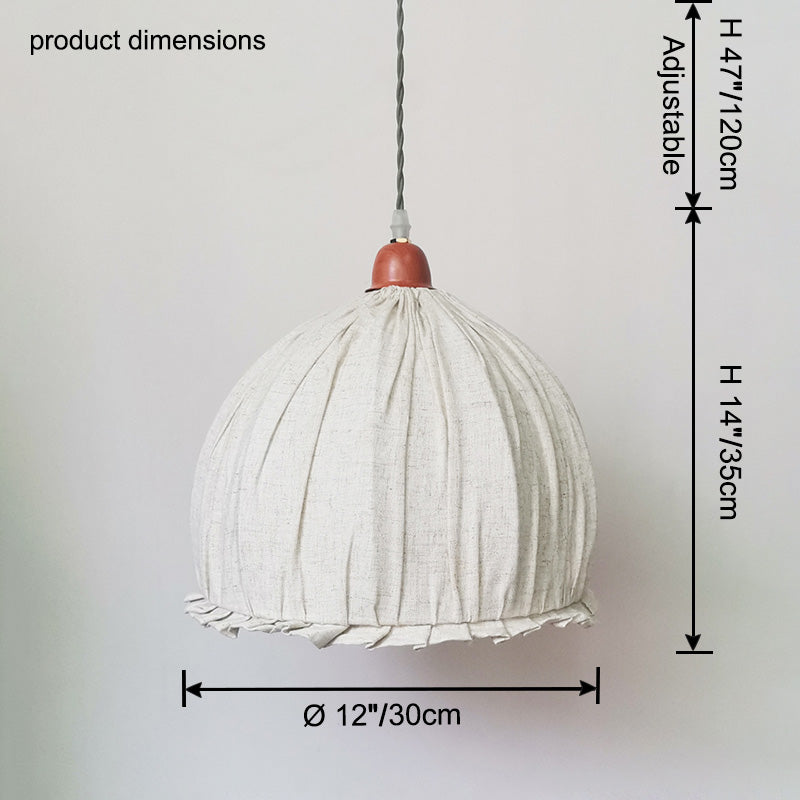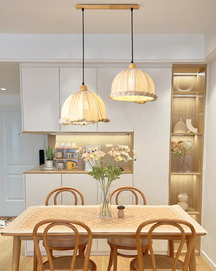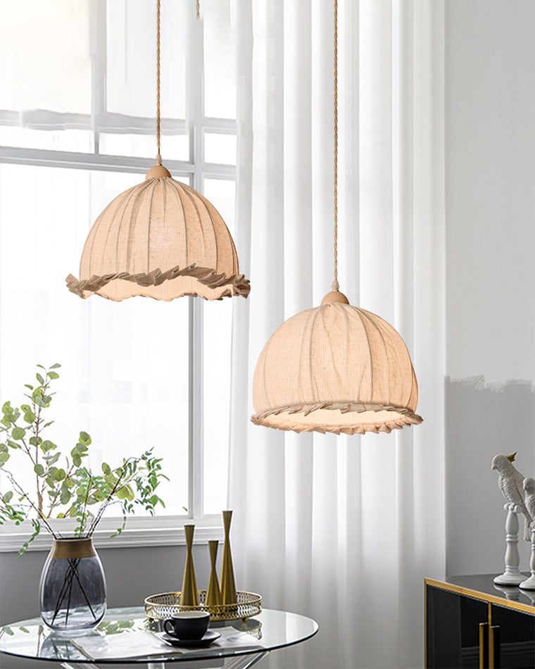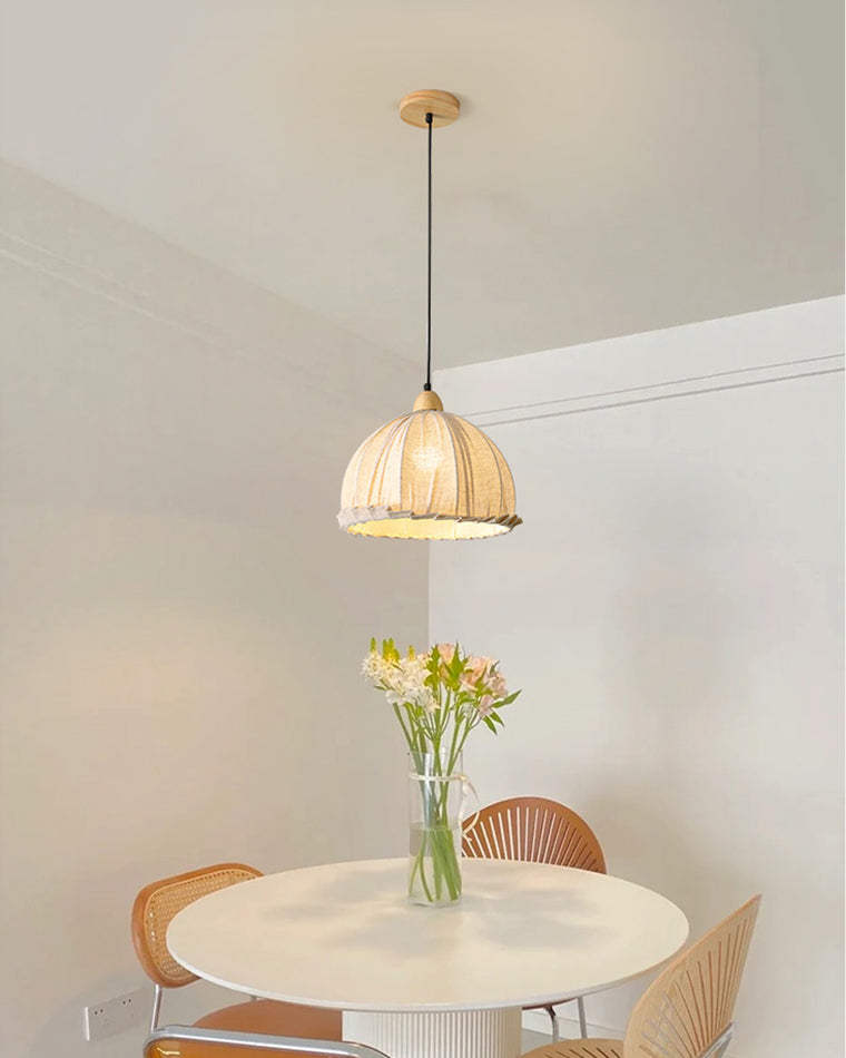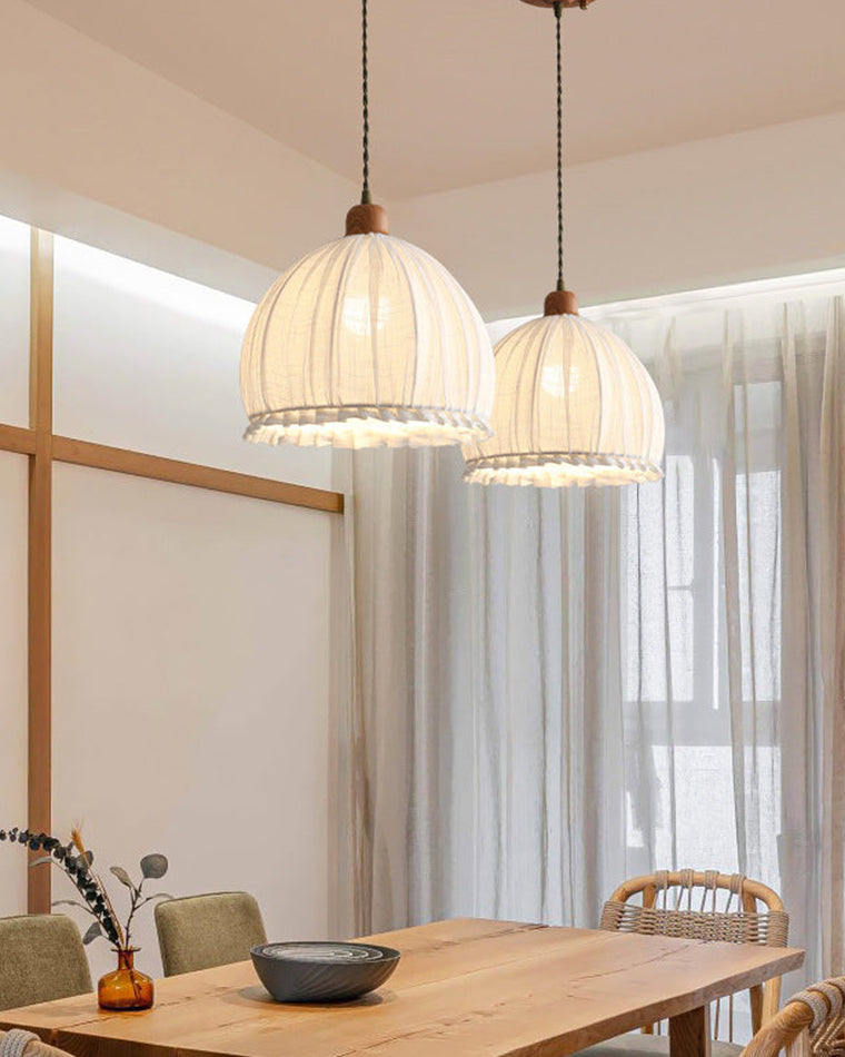 Elevate your dining room with the WOMO Fabric Dome Pendant Light. Inspired by Japandi design, this light features a fabric dome in white, beige, and green. Experience the perfect balance of minimalist elegance and natural warmth. Get yours now!