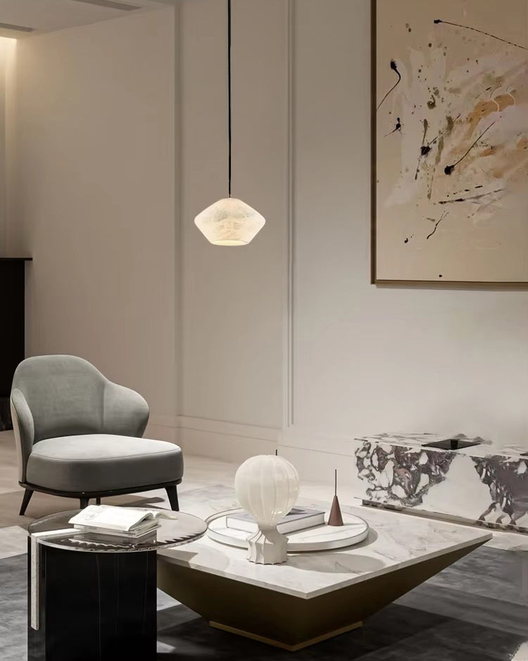 Elevate your home with the luxurious WOMO Modern Alabaster Pendant Light. Crafted with stunning alabaster, this light is perfect for your dining room or kitchen. The elegant gold accents add a touch of sophistication to any space. Enhance your decor with this timeless piece.