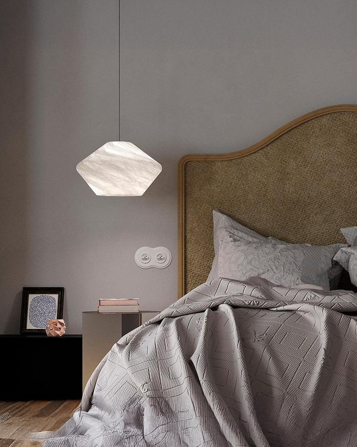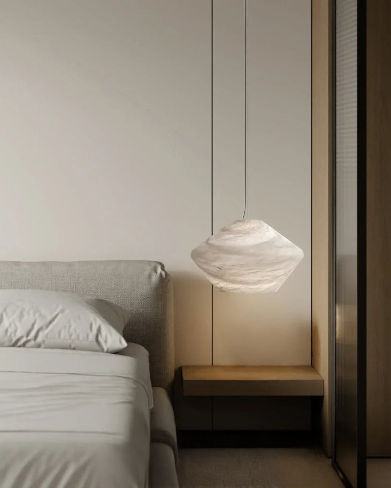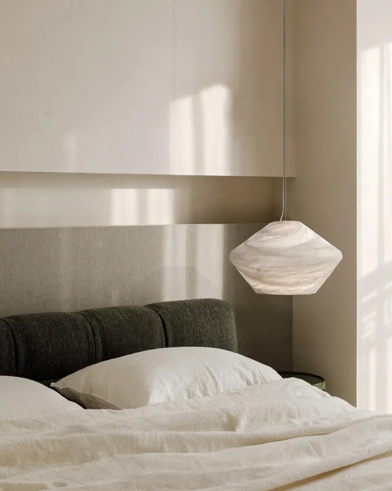 Indulge in the warm and luxurious glow of the WOMO Alabaster Pendant Light-WM2877. Perfect for contemporary bedrooms, this stunning light fixture features a beautiful alabaster shade, accented with gold details. Elevate your space with this elegant and modern lighting option!