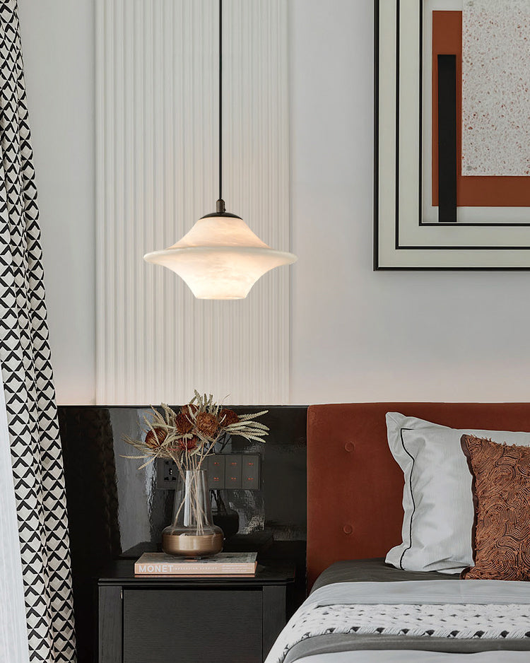 Illuminate your space with the elegant and timeless design of our WOMO Saucer Alabaster Pendant Light. Crafted with mid century modern influences and a luxurious alabaster finish, this black pendant light is perfect for adding a touch of sophistication to any bedroom or dining room. Upgrade your lighting game now!