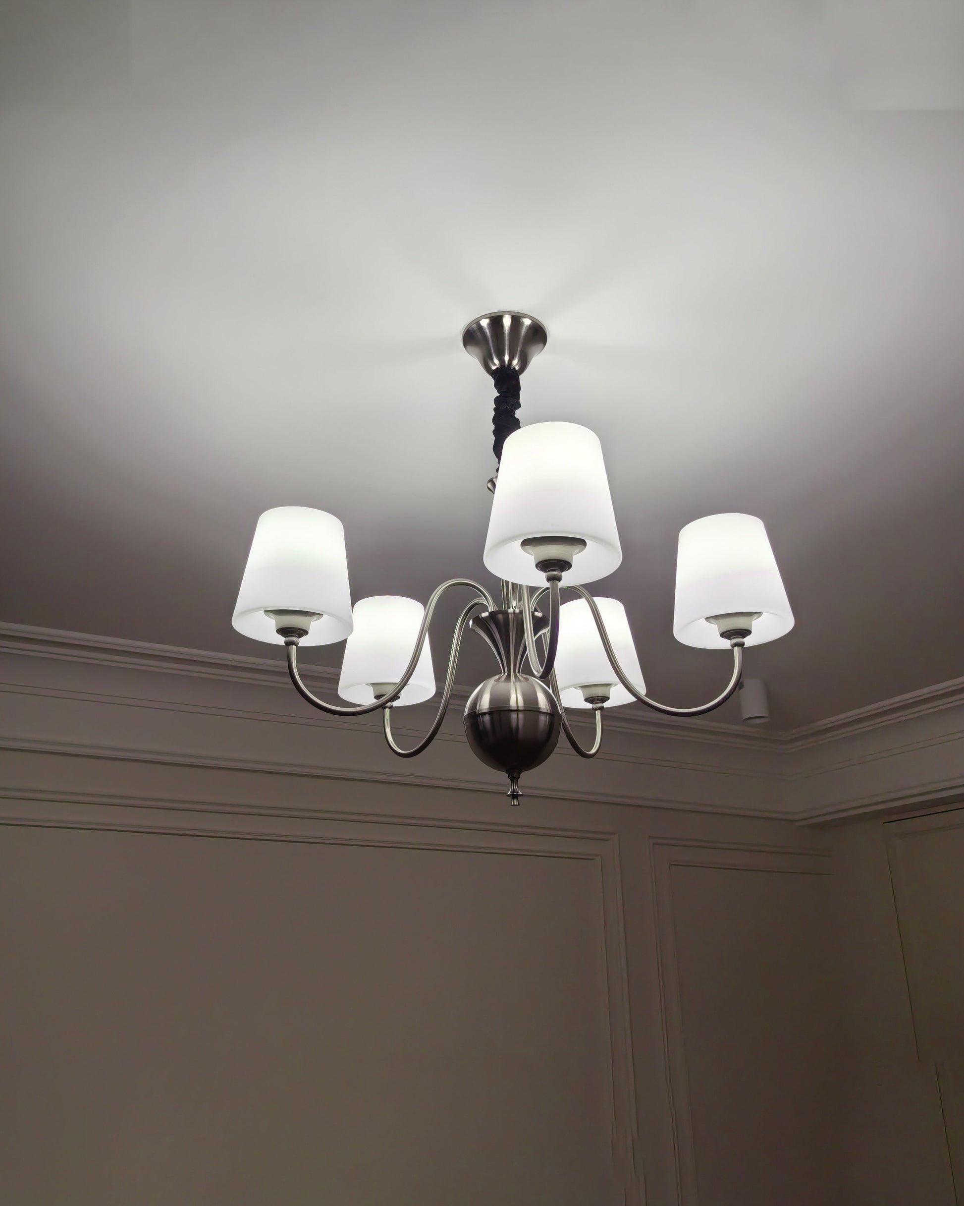 This stunning transitional chandelier features a beautifully detailed silver arm design with a sleek glass shade. Perfect for adding an elegant touch to any living room and providing warm, ambient lighting. A must-have piece for those who appreciate timeless beauty.