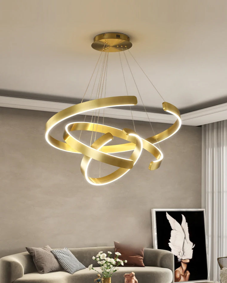 Upgrade your living room with the sleek and modern WOMO Gold Tiered Circular Chandelier! Made of durable metal, this chandelier features a stunning gold finish and an adjustable tiered design. Bring a touch of contemporary elegance to any space with this eye-catching piece.