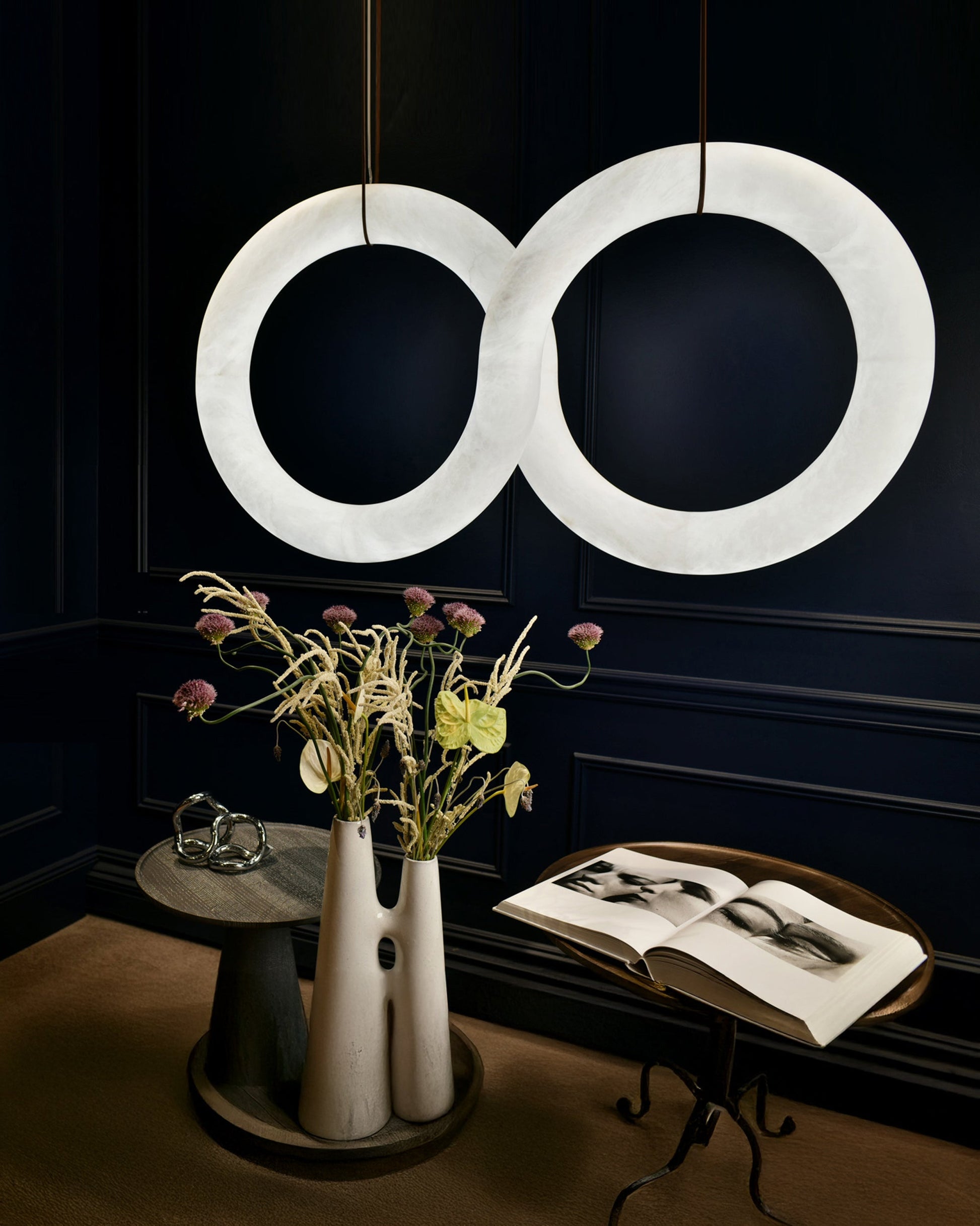 Elevate your home decor with the WOMO Infinity Alabaste Chandelier-WM2887. Its contemporary design and alabaster material bring a touch of elegance to any living room or dining room. Illuminate your space with this stunning piece and add a sense of luxury and sophistication to your space.
