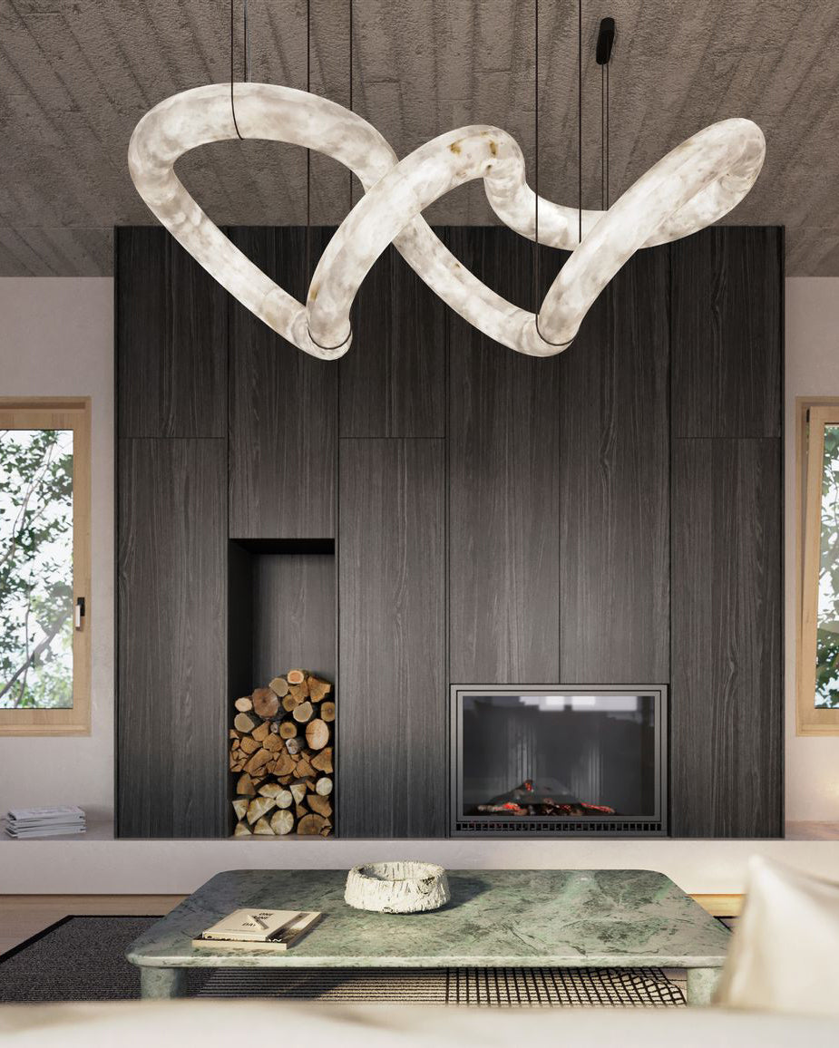 Elevate your living room with the luxurious WOMO Infinity chandelier. The stunning infinity design and high-quality, expensive alabaster create a modern and elegant look. The gold canopy adds a touch of sophistication to any space. Transform your home into a luxurious oasis with this exquisite piece.