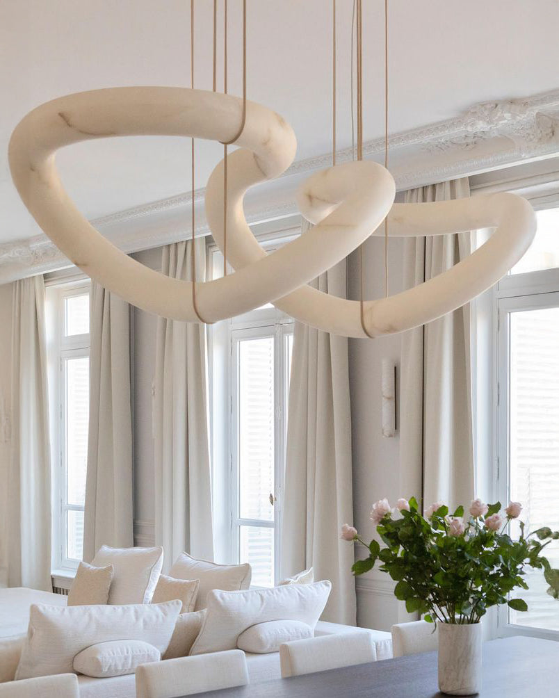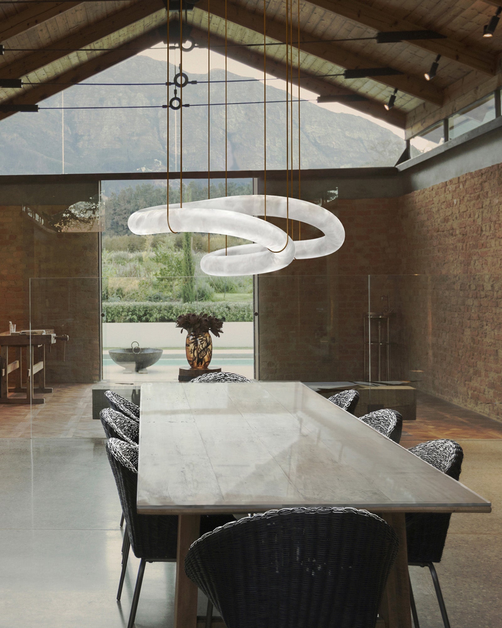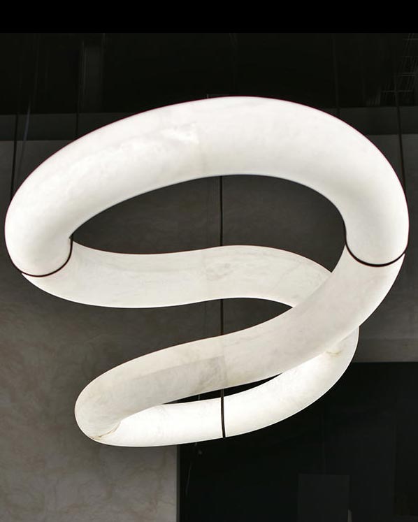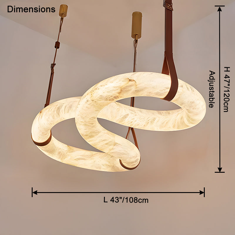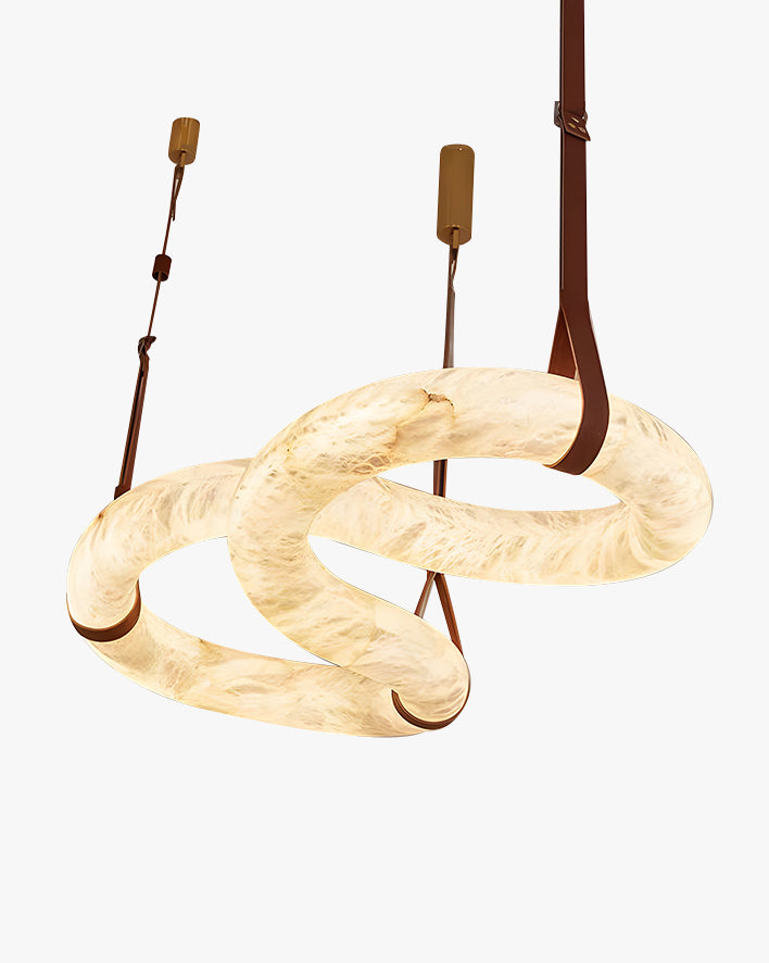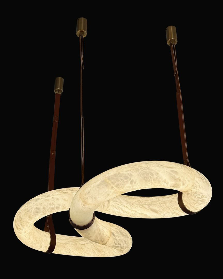 Elevate your living or dining room with the sleek and modern WOMO Infinity Alabaster Chandelier-WM2886. The contemporary design and use of alabaster add a touch of luxury to any space. Transform your home with this statement piece and create a warm and inviting atmosphere for your next gathering.