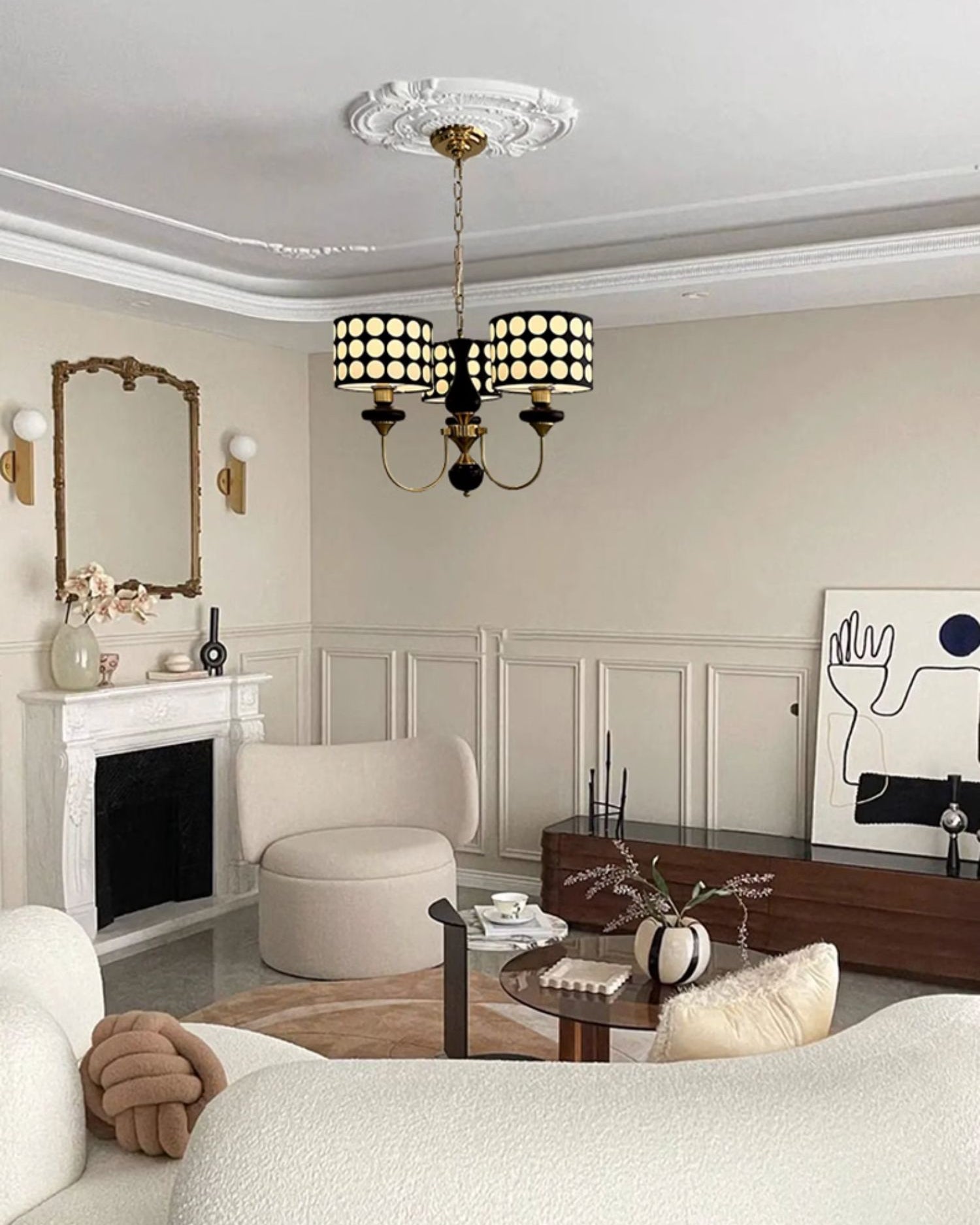 Add a touch of vintage glamour to your living room or bedroom with the WOMO Polka Dots Chandelier! Its charming polka dot design in gold and silver fabric offers a unique and multi-light experience, perfect for creating a warm and cozy atmosphere. Elevate your space with this stunning chandelier today!