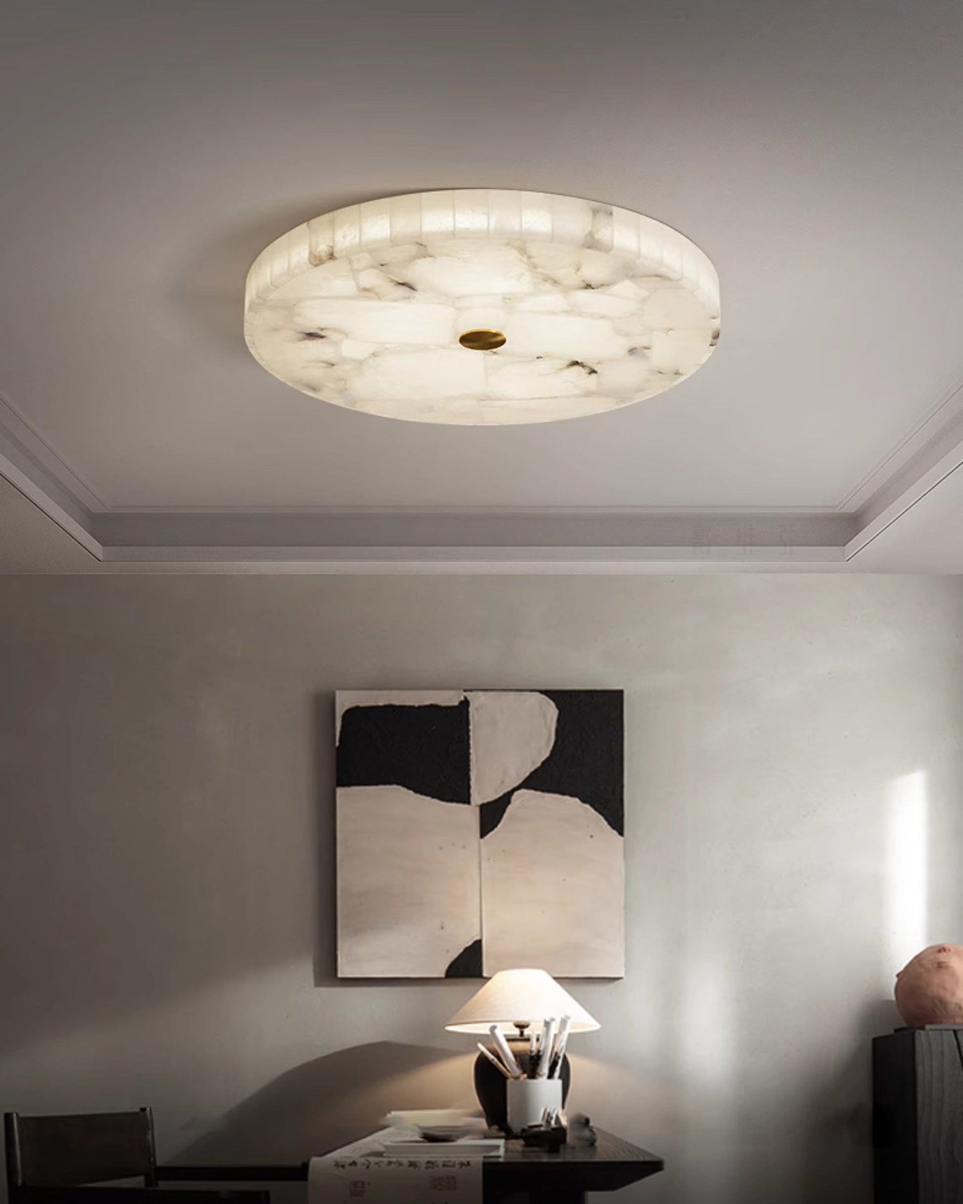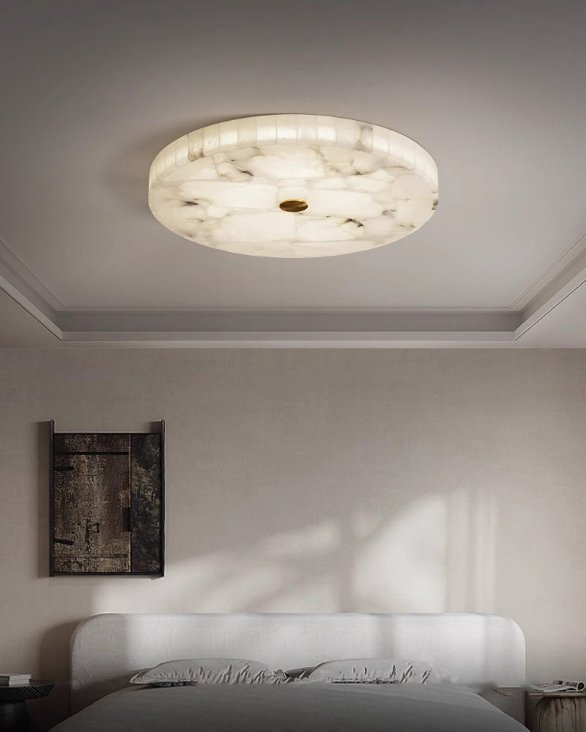 Elevate your bedroom with the minimalist charm of the WOMO Round Alabaster Ceiling Light. Crafted with high-quality alabaster, this round light adds a touch of elegance and brightness to any space. Perfect for creating a relaxing atmosphere for your bedroom. Upgrade your lighting experience now!