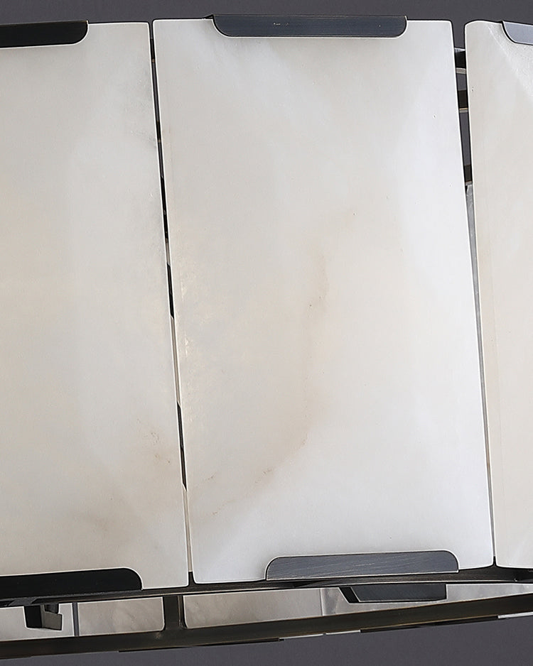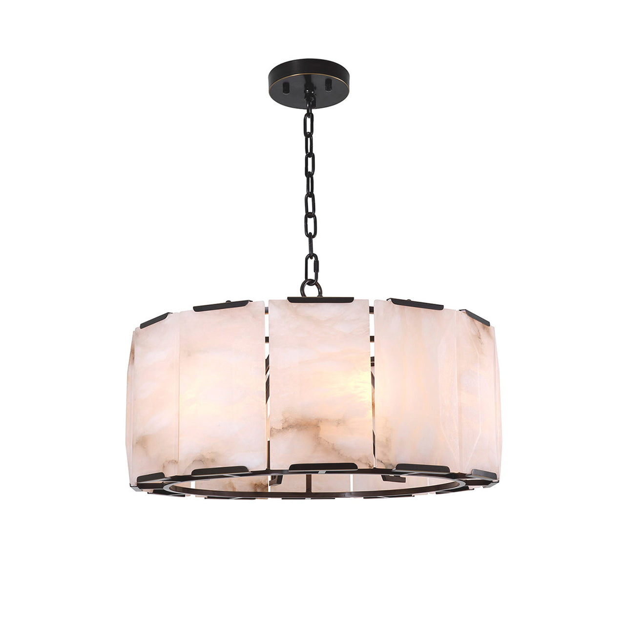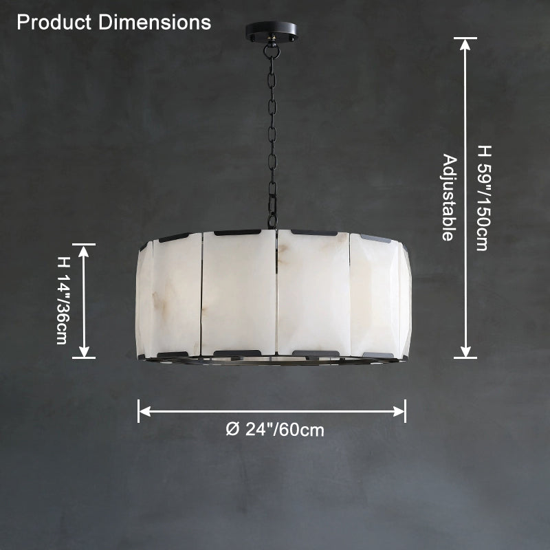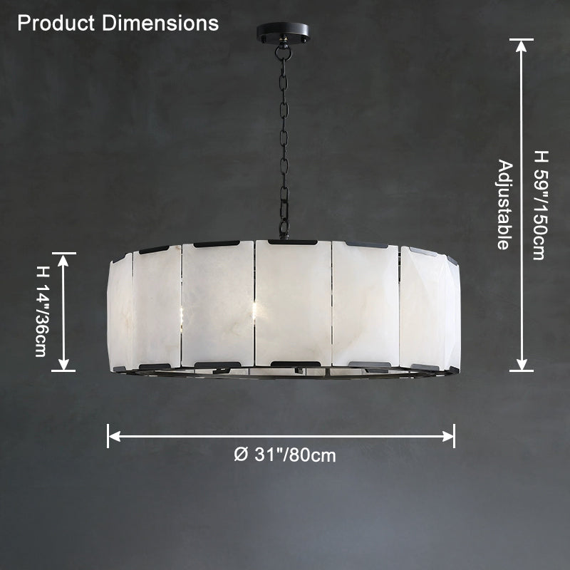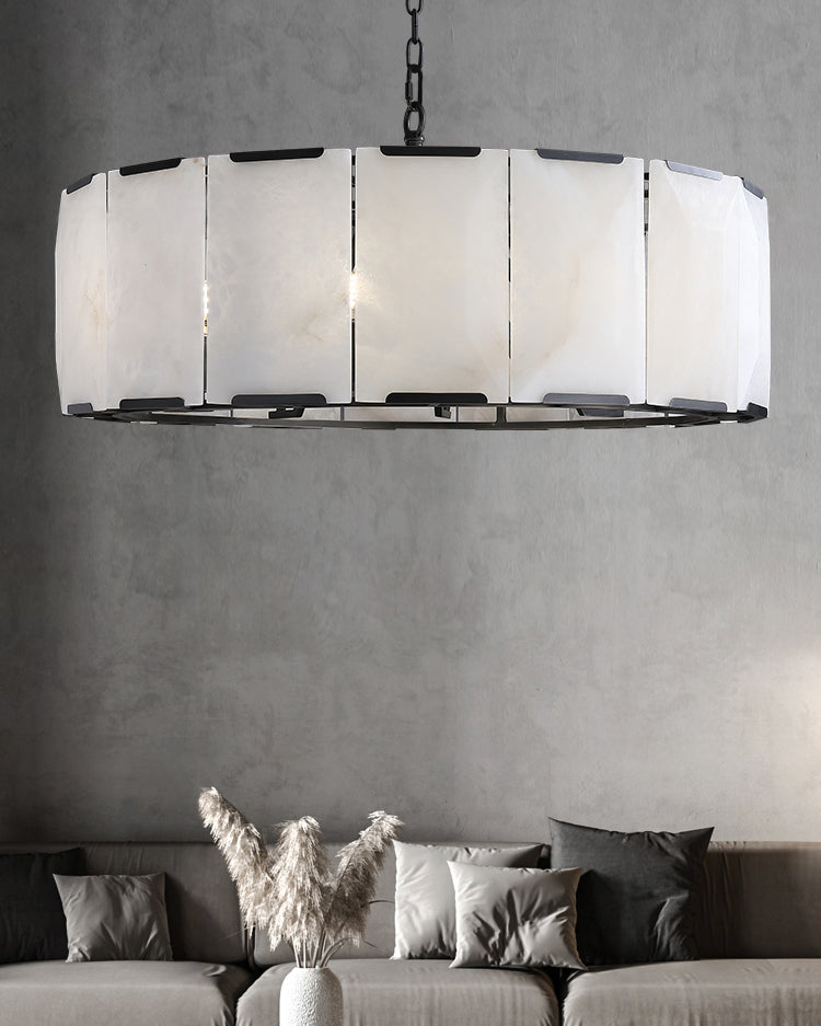 Elevate any space with the elegant WOMO circular alabaster chandelier. This statement piece combines the luxurious beauty of alabaster with a black circular design, making it perfect for any living room or dining room. Enhance your space with timeless sophistication.
