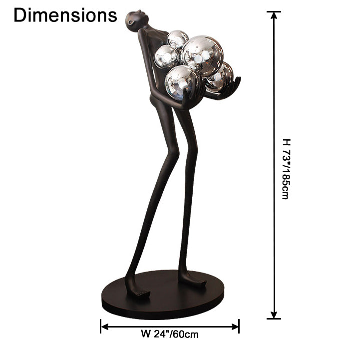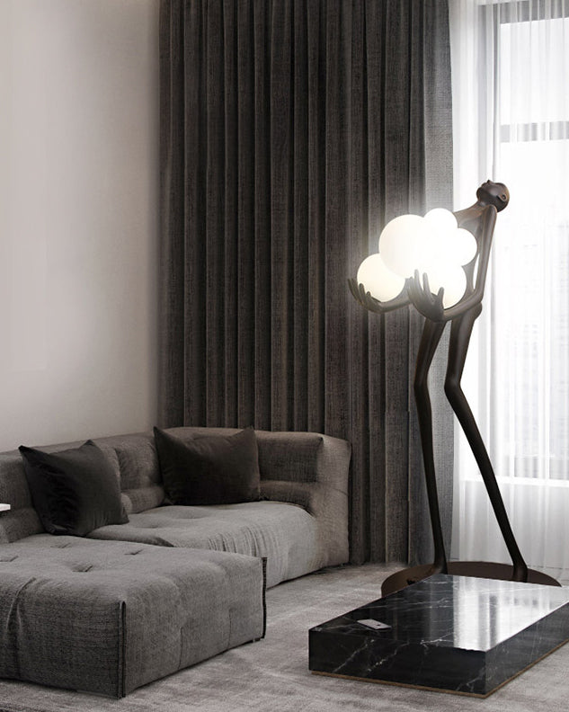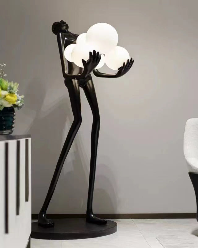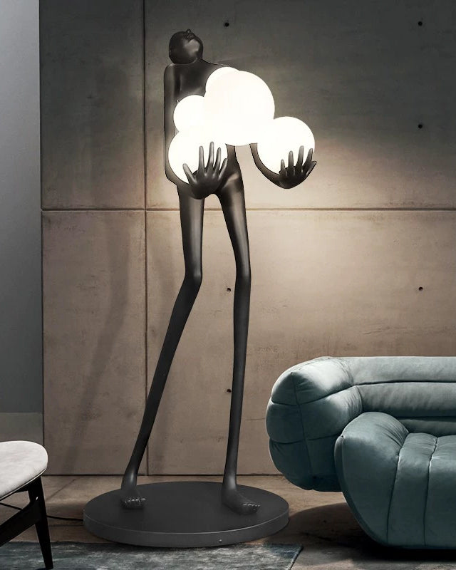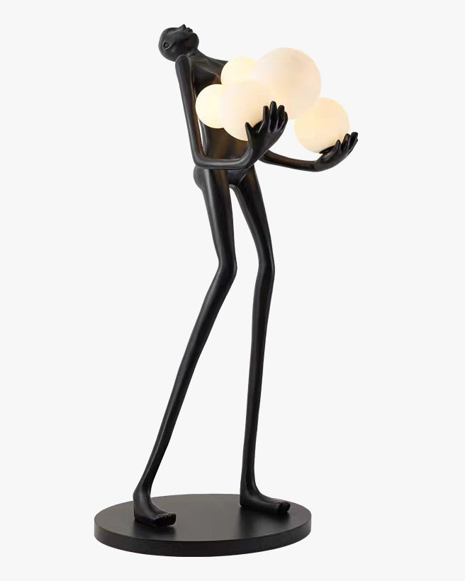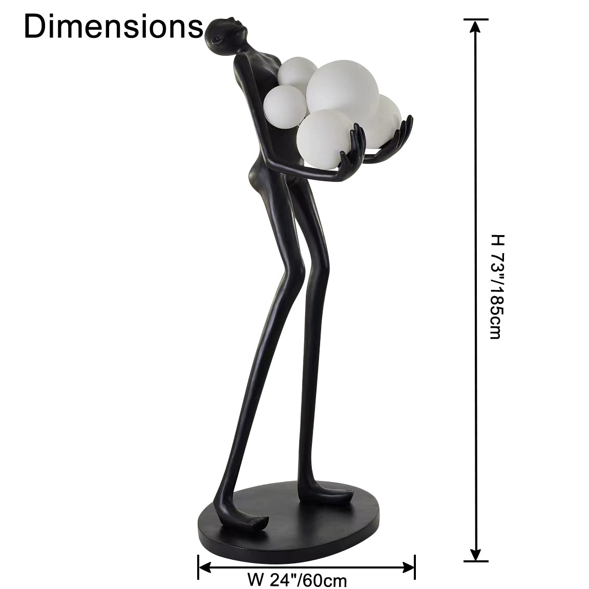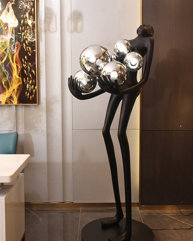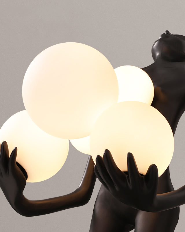 Introducing the WOMO Sculptural Glass Globe Floor Lamp! Enhance your space with this contemporary piece featuring striking black sculptural women holding elegant glass globes in either white or smoked. Elevate your interior design and create a unique ambiance with this beautiful and functional floor lamp!