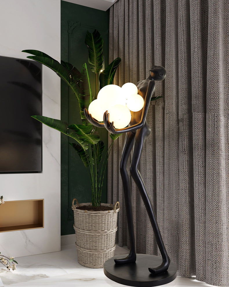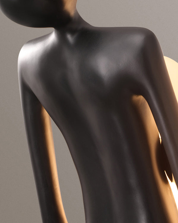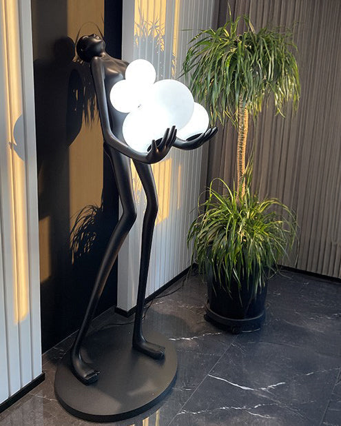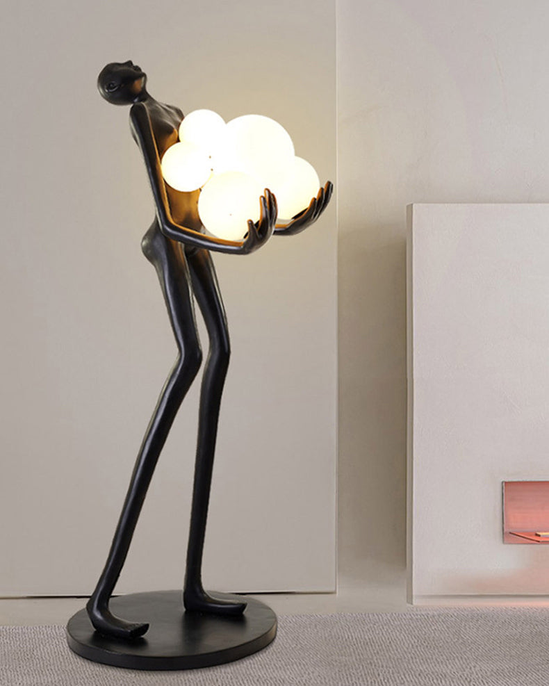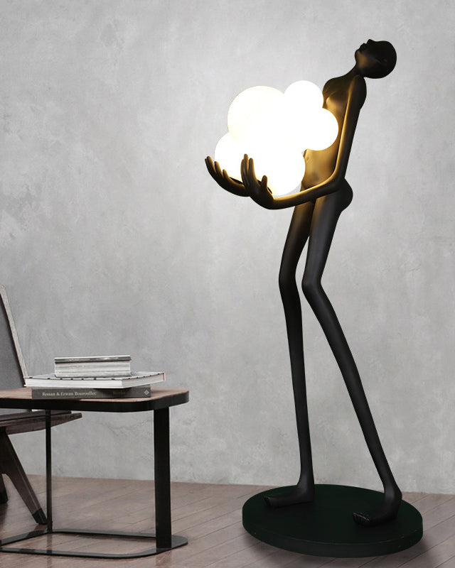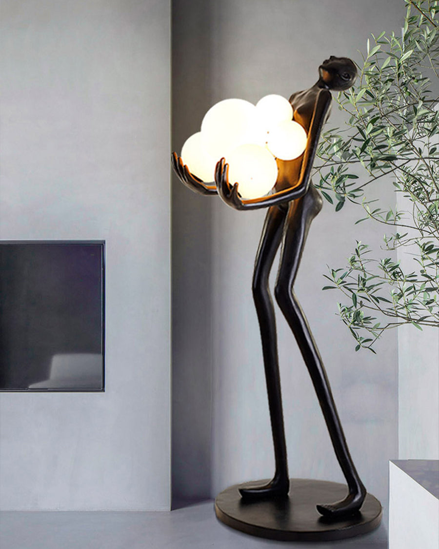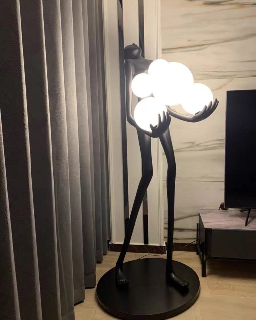 Introducing the WOMO Sculptural Glass Globe Floor Lamp! Enhance your space with this contemporary piece featuring striking black sculptural women holding elegant glass globes in either white or smoked. Elevate your interior design and create a unique ambiance with this beautiful and functional floor lamp!