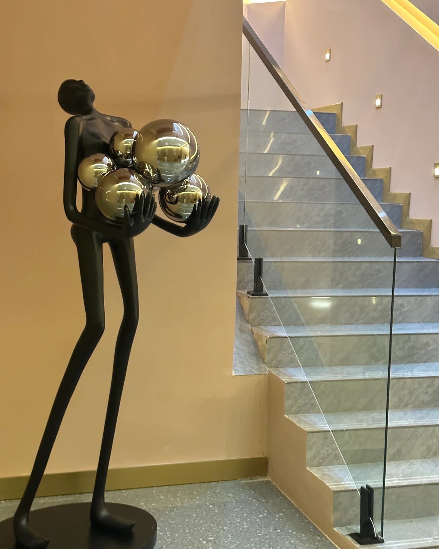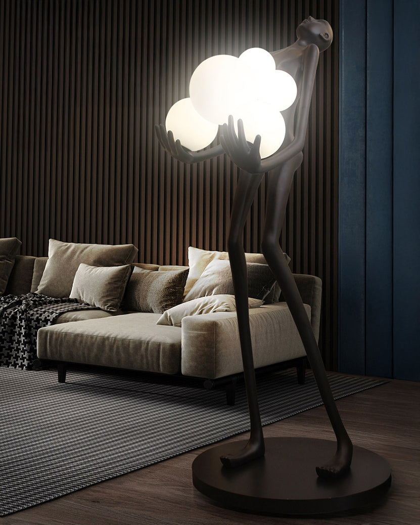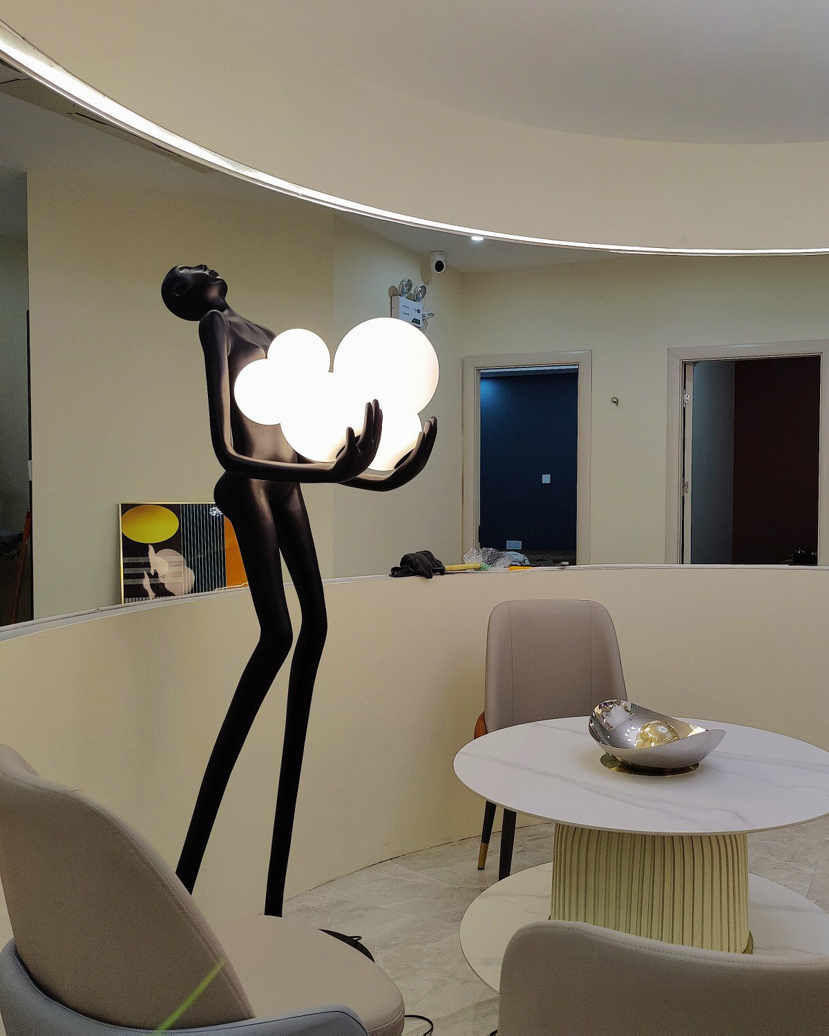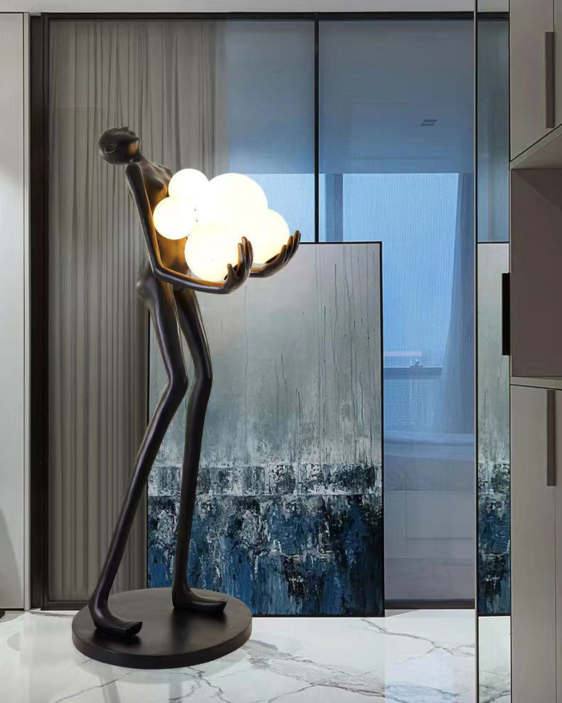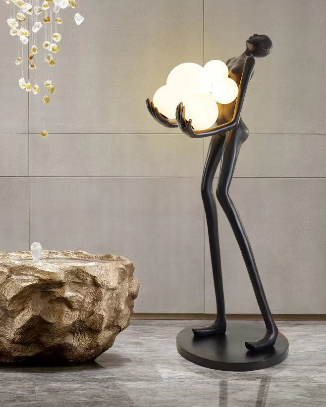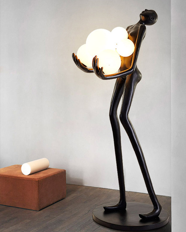Introducing the WOMO Sculptural Glass Globe Floor Lamp! Enhance your space with this contemporary piece featuring striking black sculptural women holding elegant glass globes in either white or smoked. Elevate your interior design and create a unique ambiance with this beautiful and functional floor lamp!