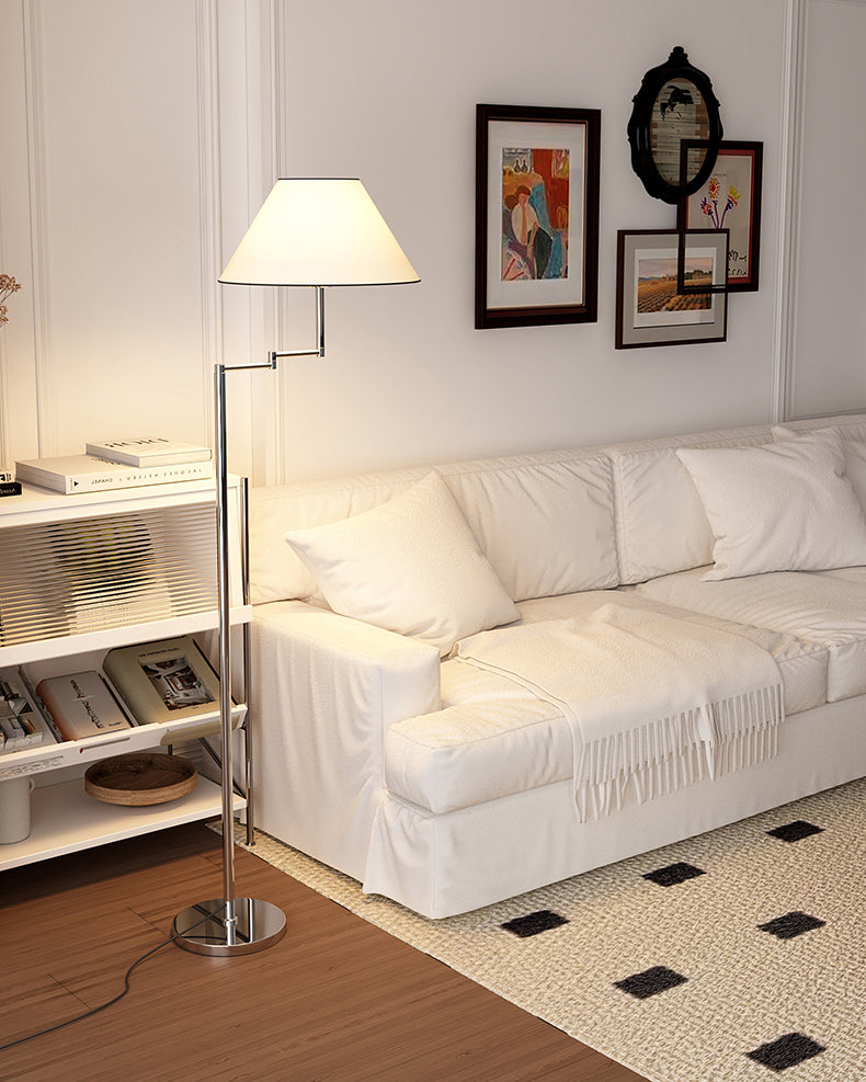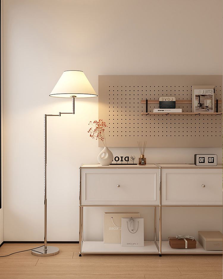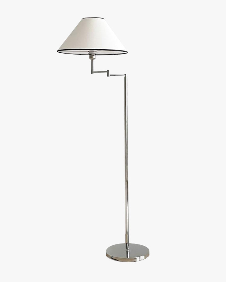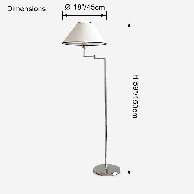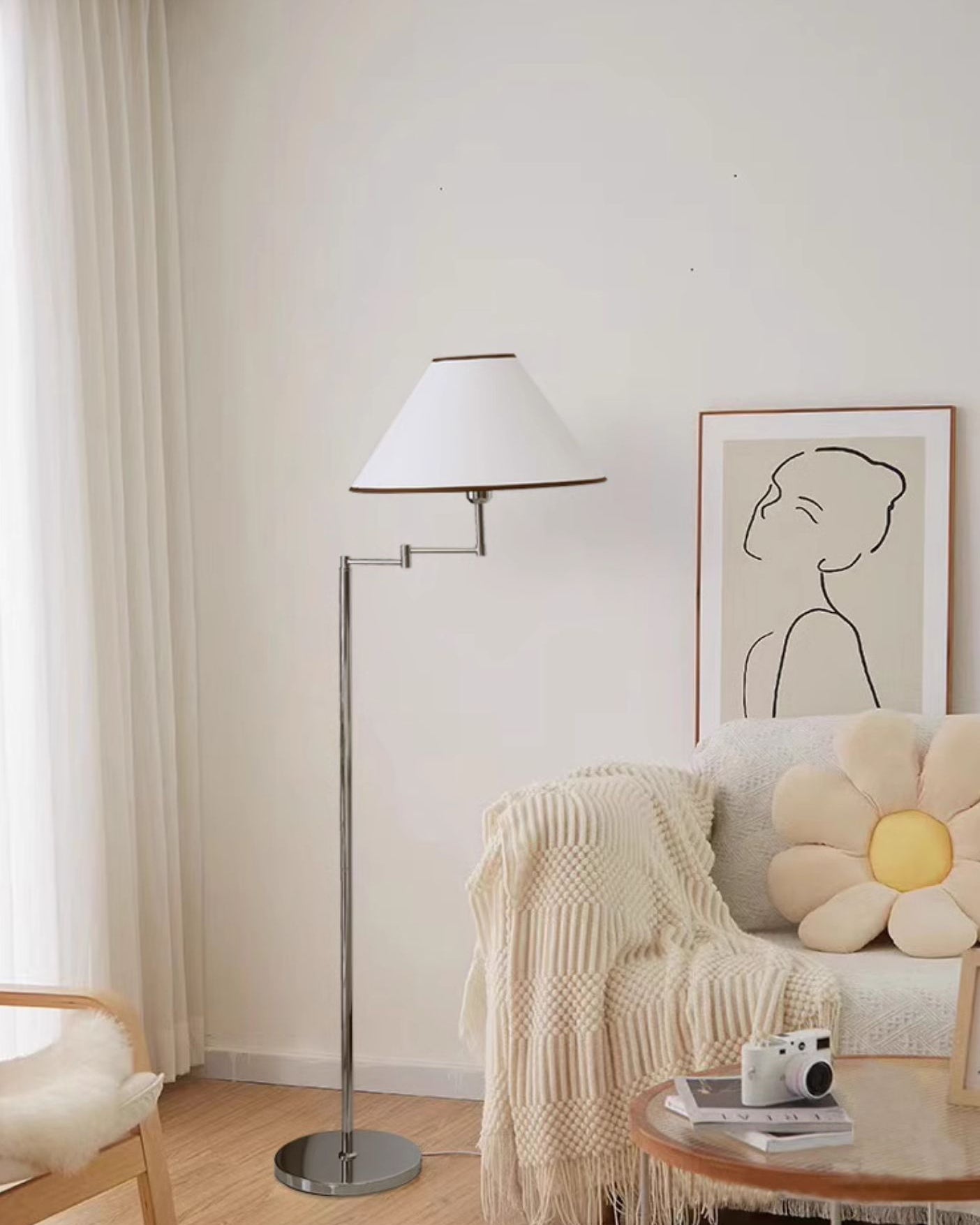 Elevate your living space with our stylish and functional WOMO Cone Swing Arm Floor Lamp! Boasting a sleek chrome finish and a swing arm design, this lamp allows for flexible lighting options. The white cone cloth shade with black edge adds a touch of elegance, while the soft light creates a warm and inviting atmosphere. Experience the perfect blend of style and functionality with this must-have lamp!