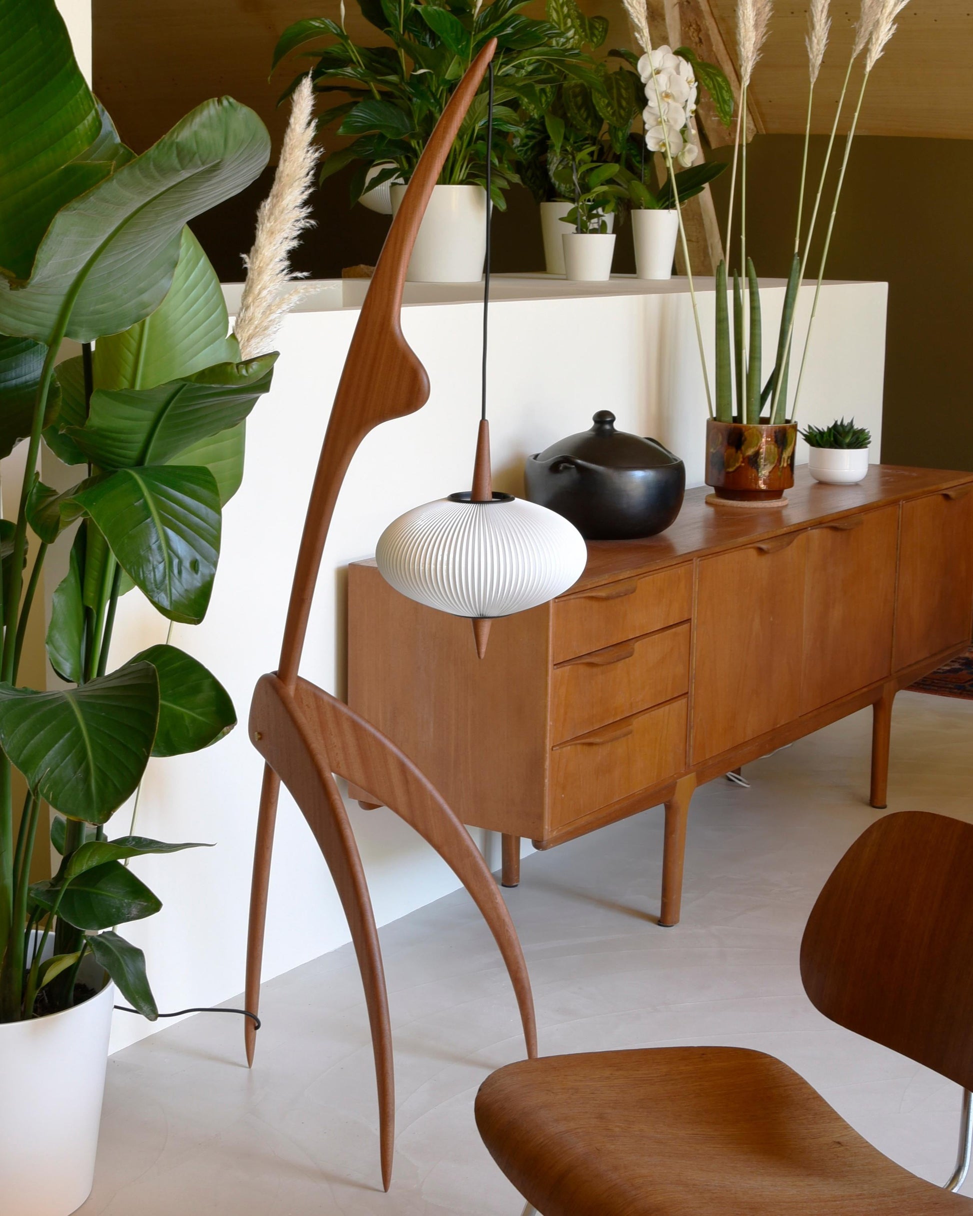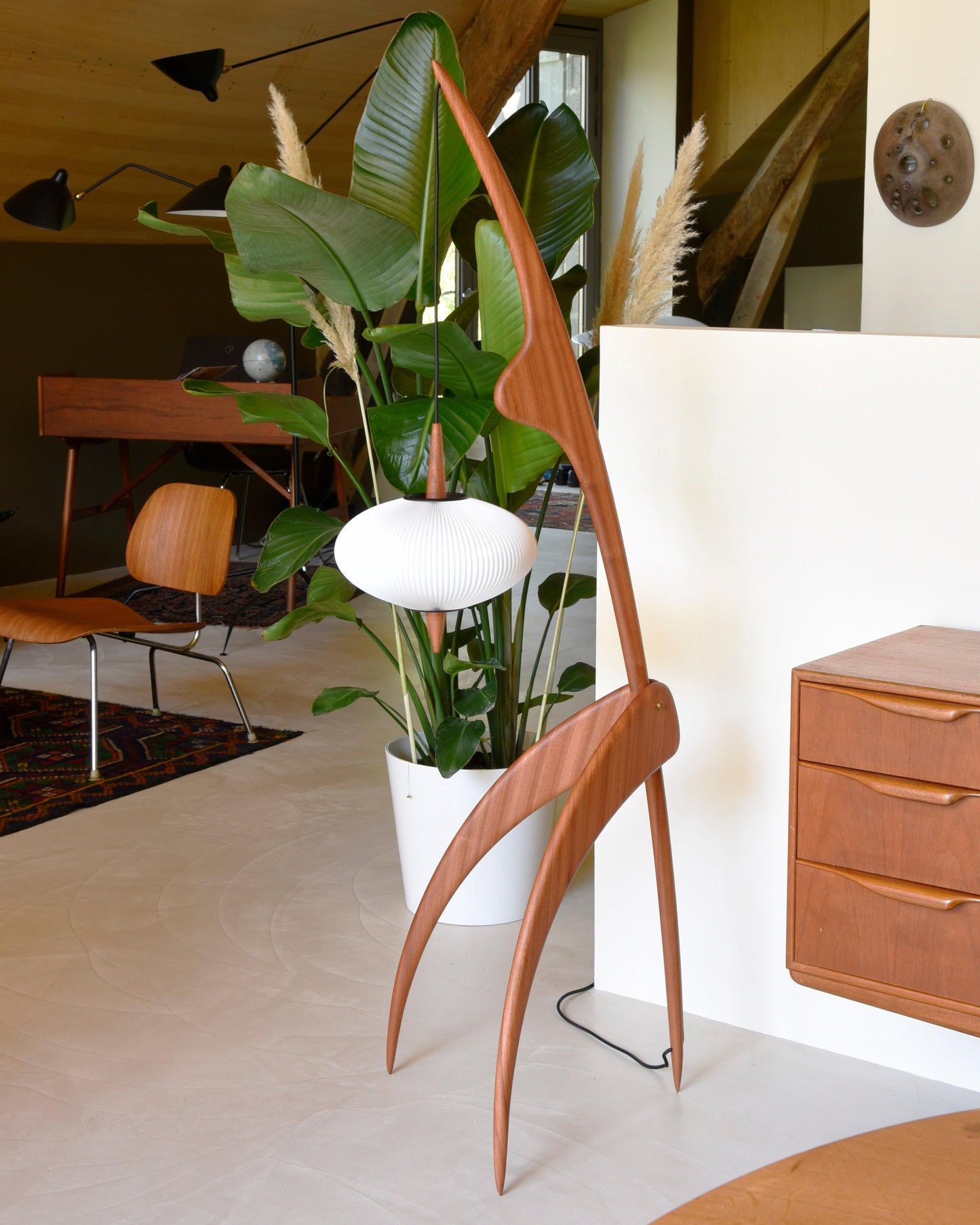 Elevate your space with the unique and stylish WOMO Flying Saucer Tripod Wood Floor Lamp. The mid-century modern design features a flying saucer lantern in cloth, supported by a sleek walnut or oak tripod. Add ambience and sophistication to any room with this one-of-a-kind statement piece.